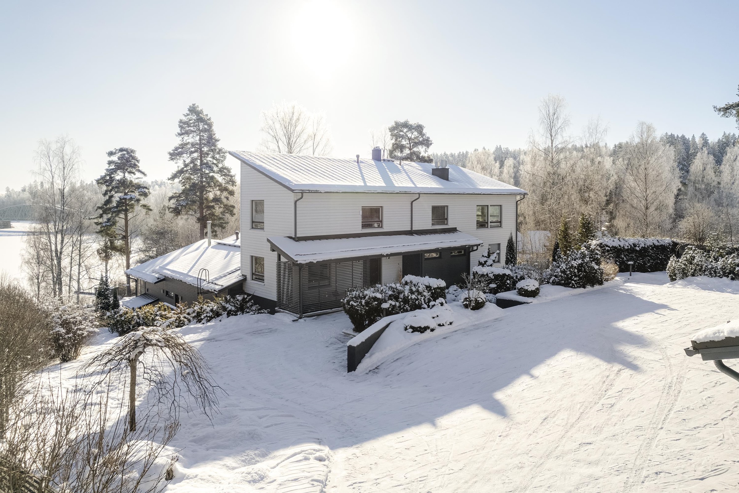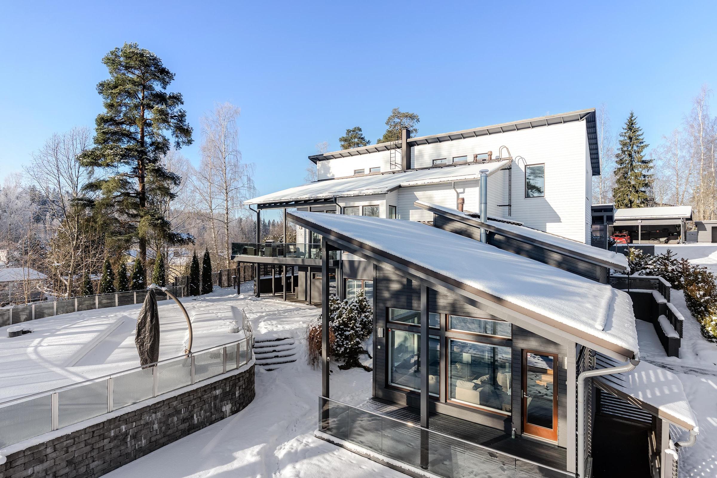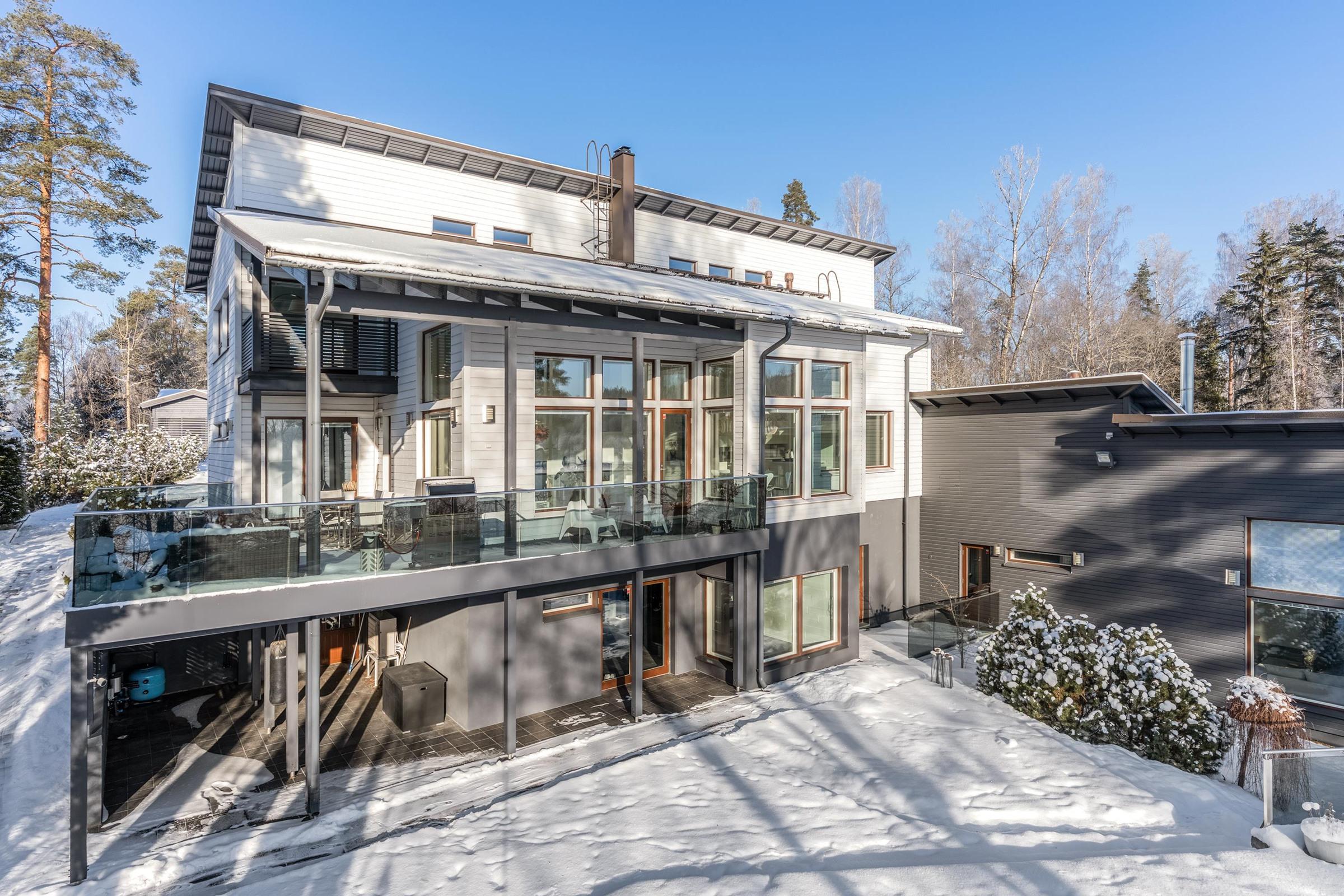 Vuonna 2010 valmistunut päärakennus on kokenut laajan uudistuksen vuosina 2014 ja 2018 ja se huokuu nyt modernia eleganssia ja ajatonta laatua. Avarat, valoisat huoneet ja suuret ikkunat tuovat luonnon osaksi asumista. Kodin sydämen muodostaa laadukas Poggenpohlin keittiö, jota täydentävät Gaggenaun huippuluokan kodinkoneet. Useat takalliset oleskelutilat luovat lämpimän ja kutsuvan tunnelman, jossa arjen hetket ja edustavat illat sulautuvat saumattomasti yhteen.