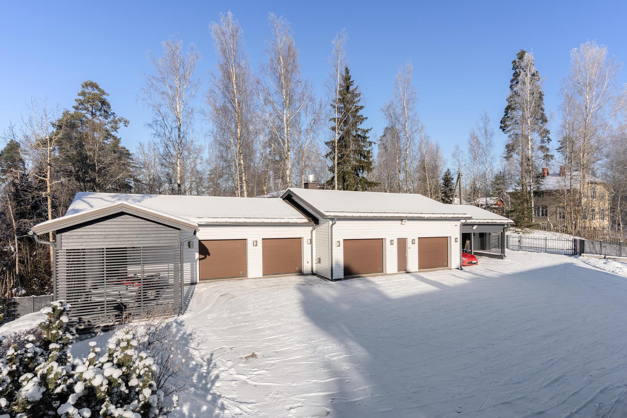 Rakennuskanta täydentyy poikkeuksellisella, noin 320 neliön autotallirakennuksella, jossa on neljä autopaikkaa, sähkötoimiset ovet ja viimeistelty epoksilattia. Rakennuksen yhteydessä on lisäksi kaksi autokatospaikkaa. Sen alakerrassa sijaitsee täysin varusteltu, yli 100 neliön kuntosali sekä nykyaikainen väestönsuoja - kaikki toteutettu samaa tinkimätöntä laatua noudattaen.