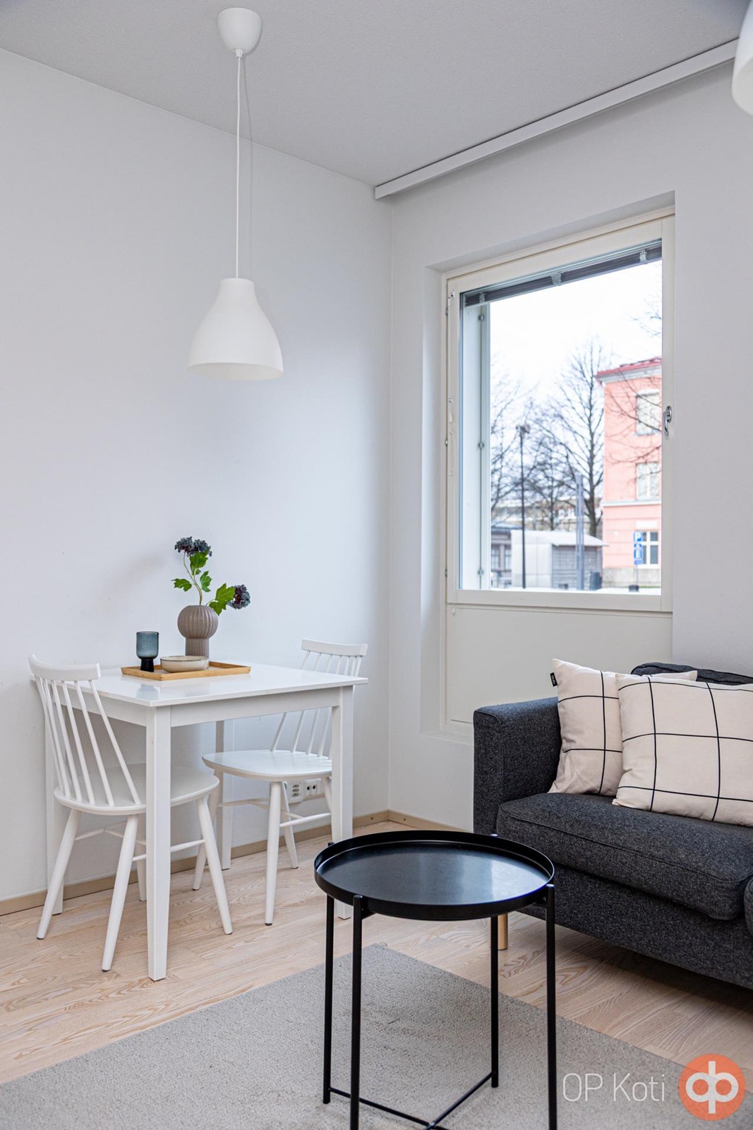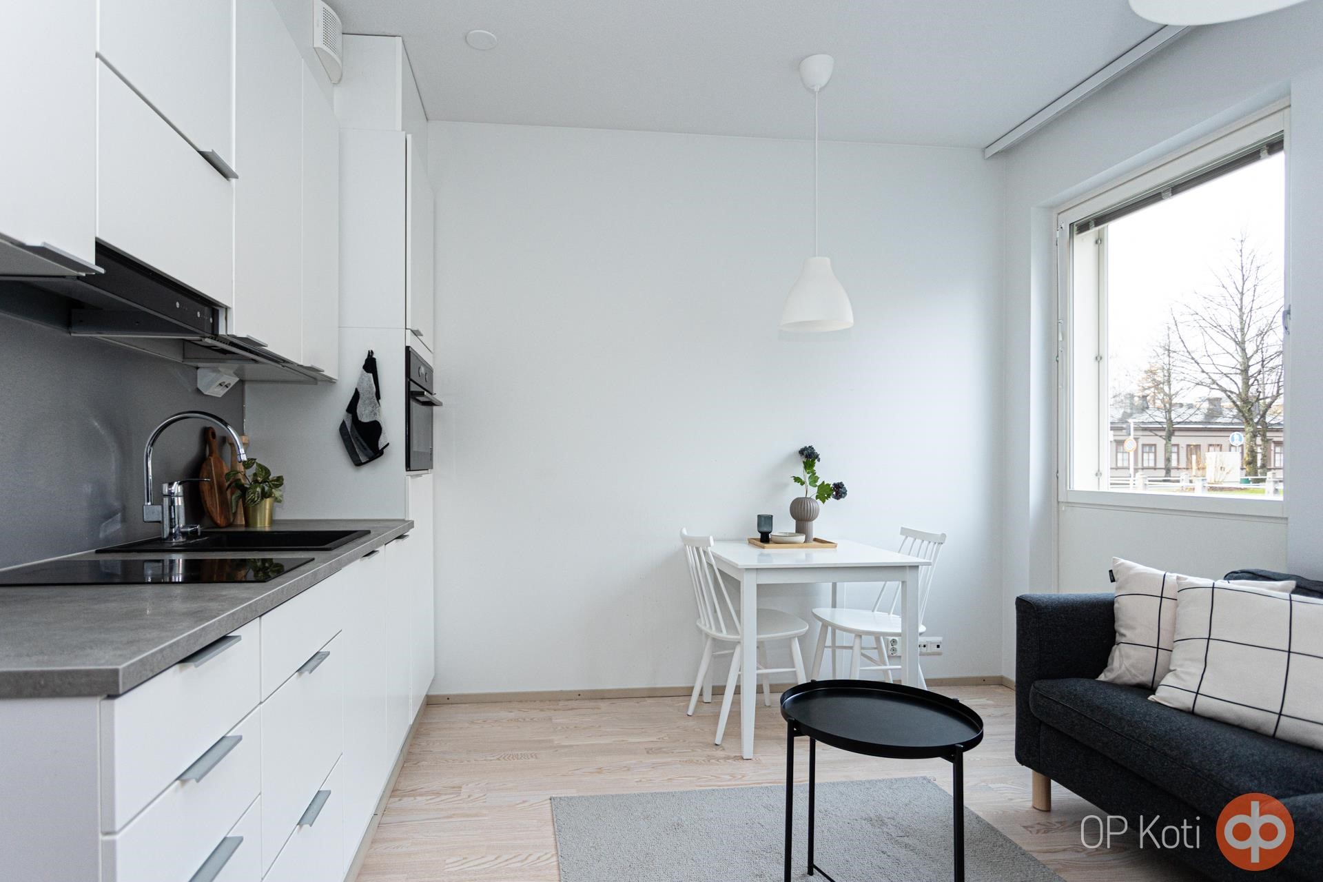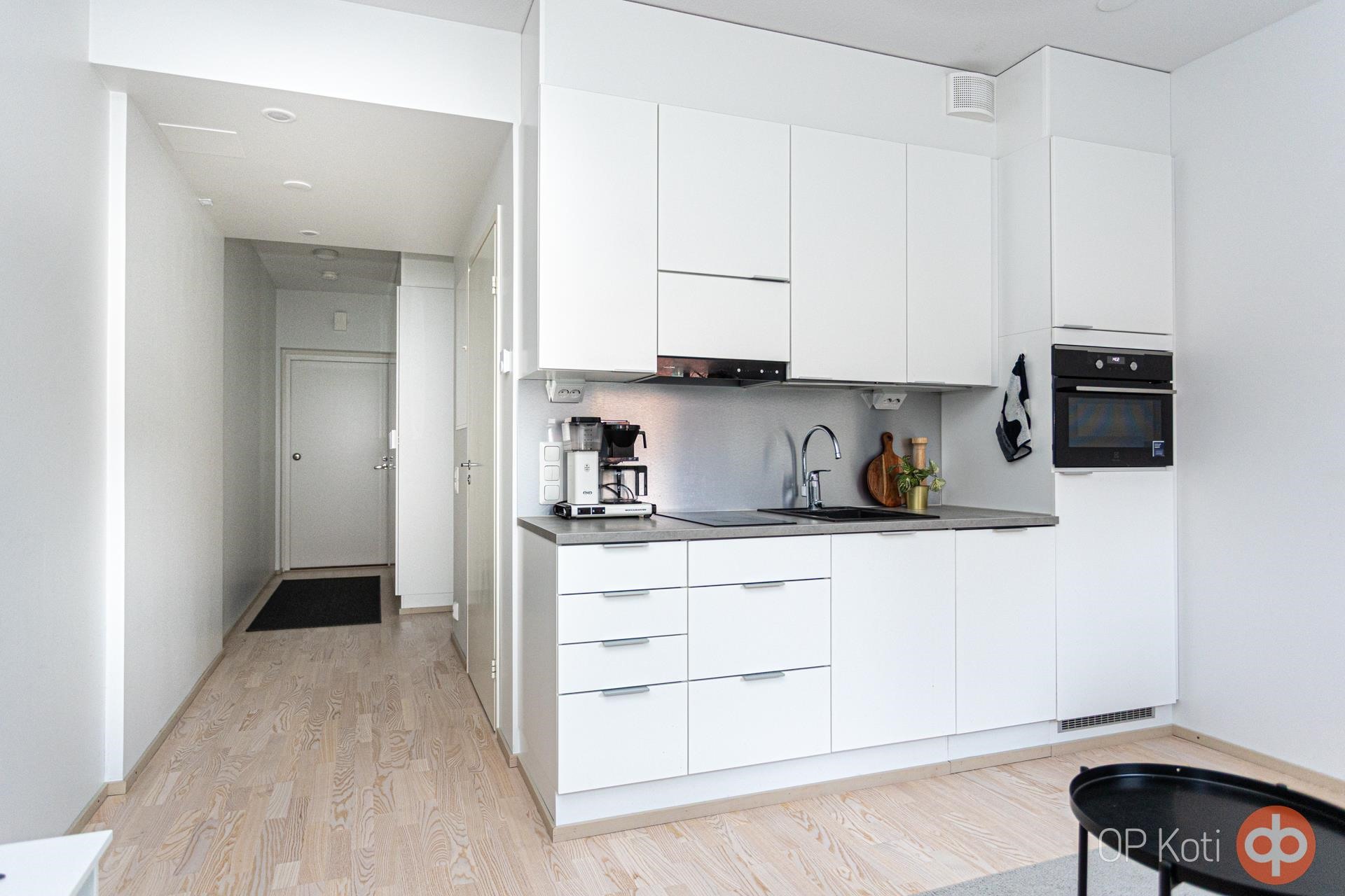 Huoneisto on kauttaaltaan vaalea ja suunniteltu nykyaikaisen kaupunkiasumisen tarpeisiin. Vesikiertoinen lattialämmitys, tammiparketti, laadukkaat pintamateriaalit ja integroidut kodinkoneet tekevät pienestä tilasta toimivan ja viihtyisän.