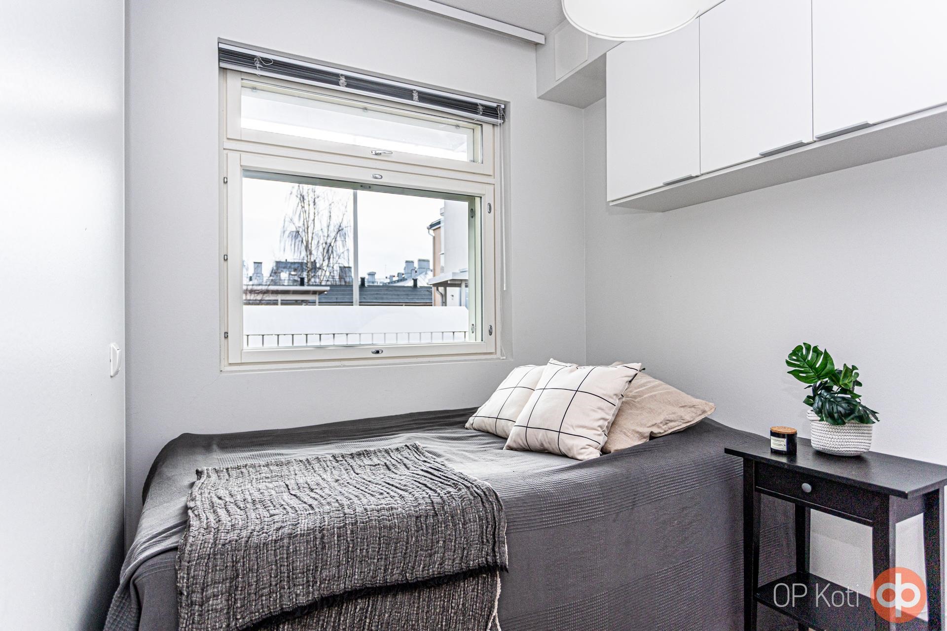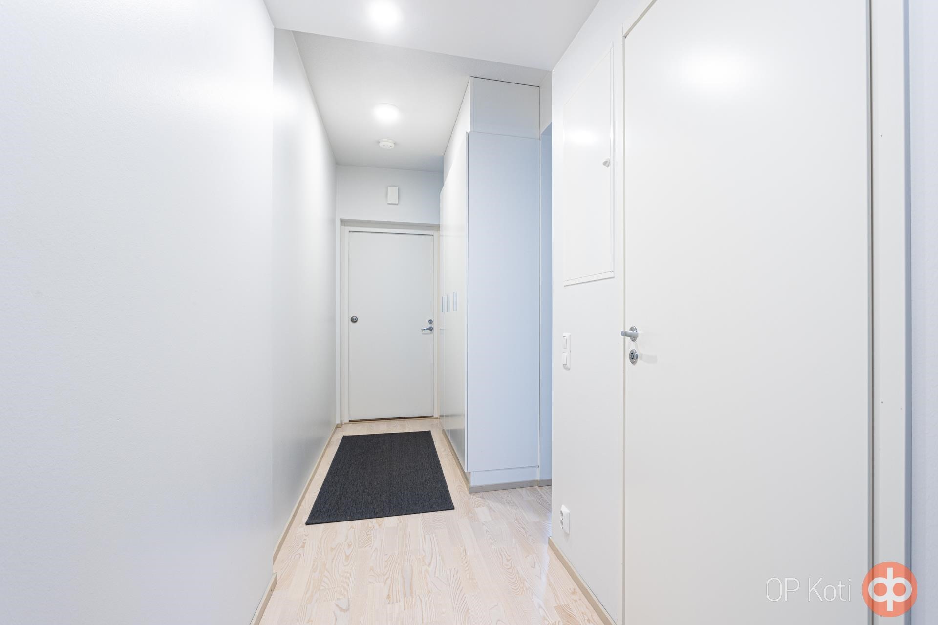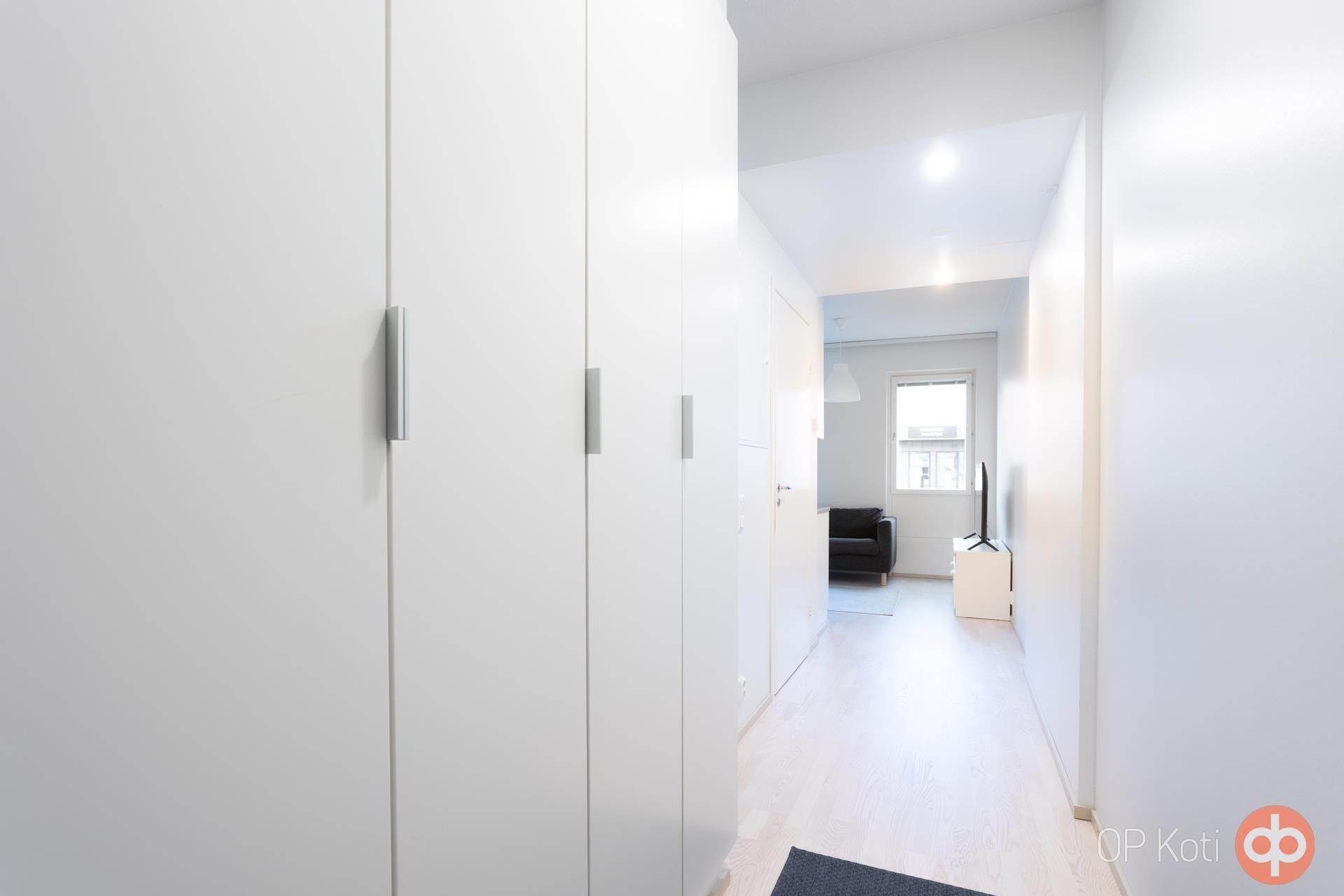 Huoneisto on kauttaaltaan vaalea ja suunniteltu nykyaikaisen kaupunkiasumisen tarpeisiin. Vesikiertoinen lattialämmitys, tammiparketti, laadukkaat pintamateriaalit ja integroidut kodinkoneet tekevät pienestä tilasta toimivan ja viihtyisän.