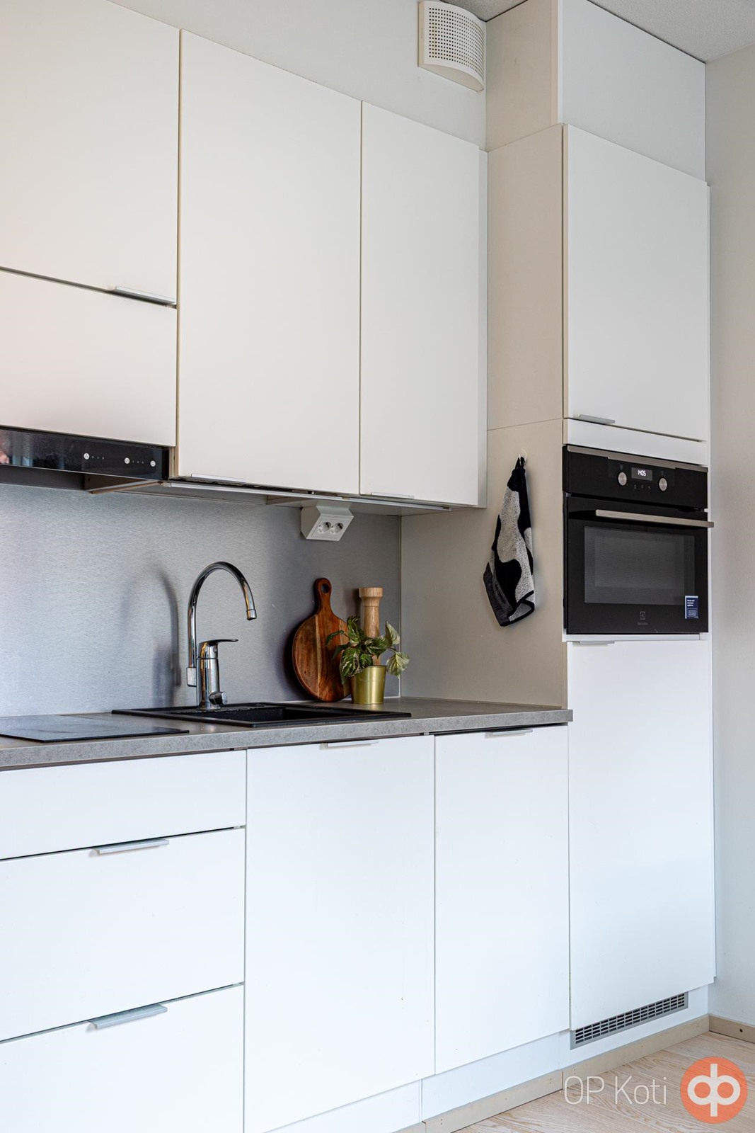 - Jääkaappi jääkaapin sisällä pakastinlokero, erillisuuni, induktioliesi, liesituuletin, mikroaaltouuni, astianpesukone, kaapistot, kiinteät valaisimet.