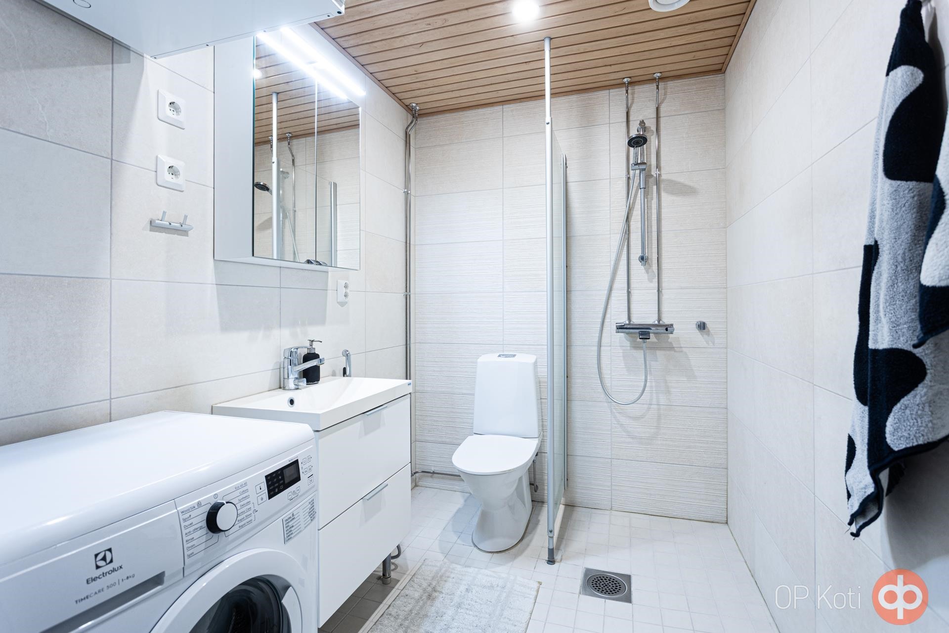 - Kylpyhuone, suihku, suihkuseinä, peilikaappi, allaskaappi, pesukoneliitäntä, lattialämmitys, kiinteät valaisimet.