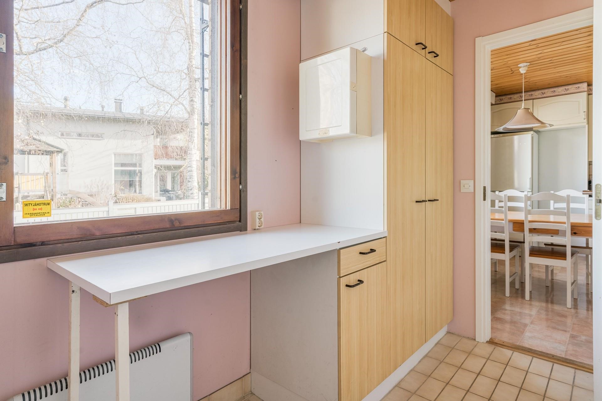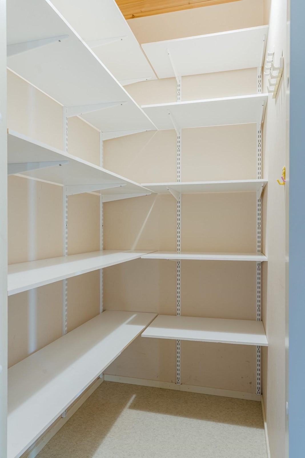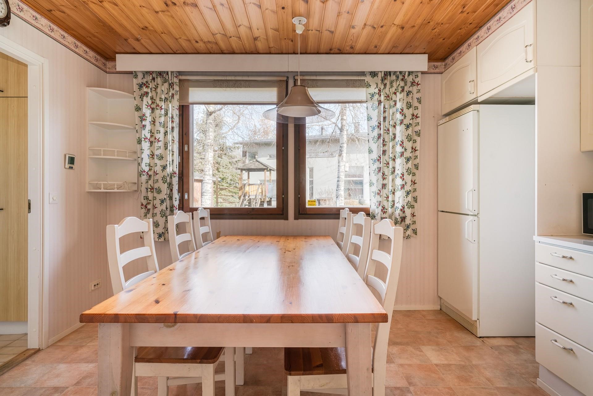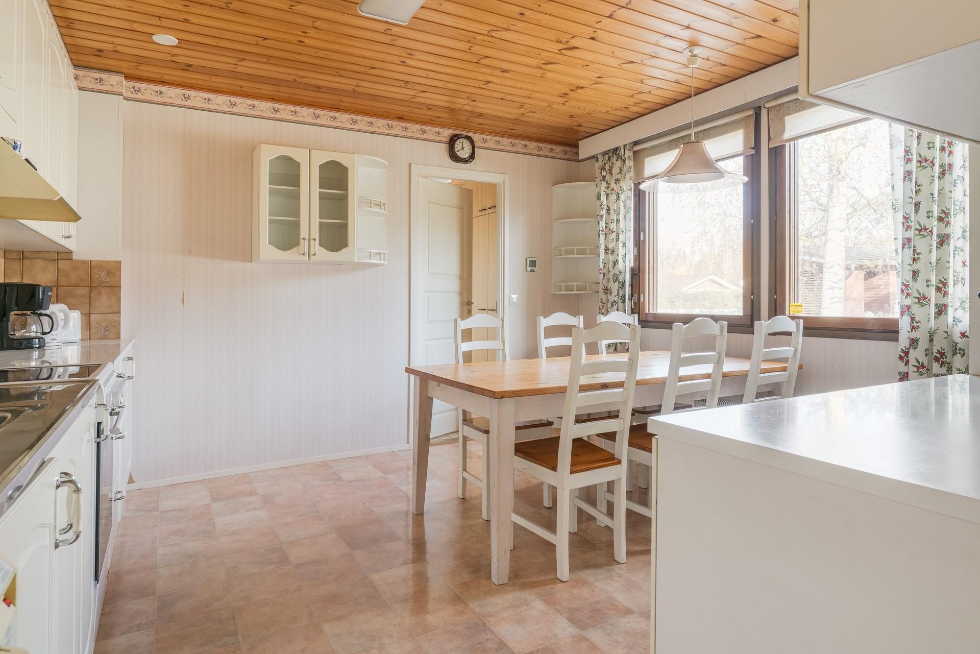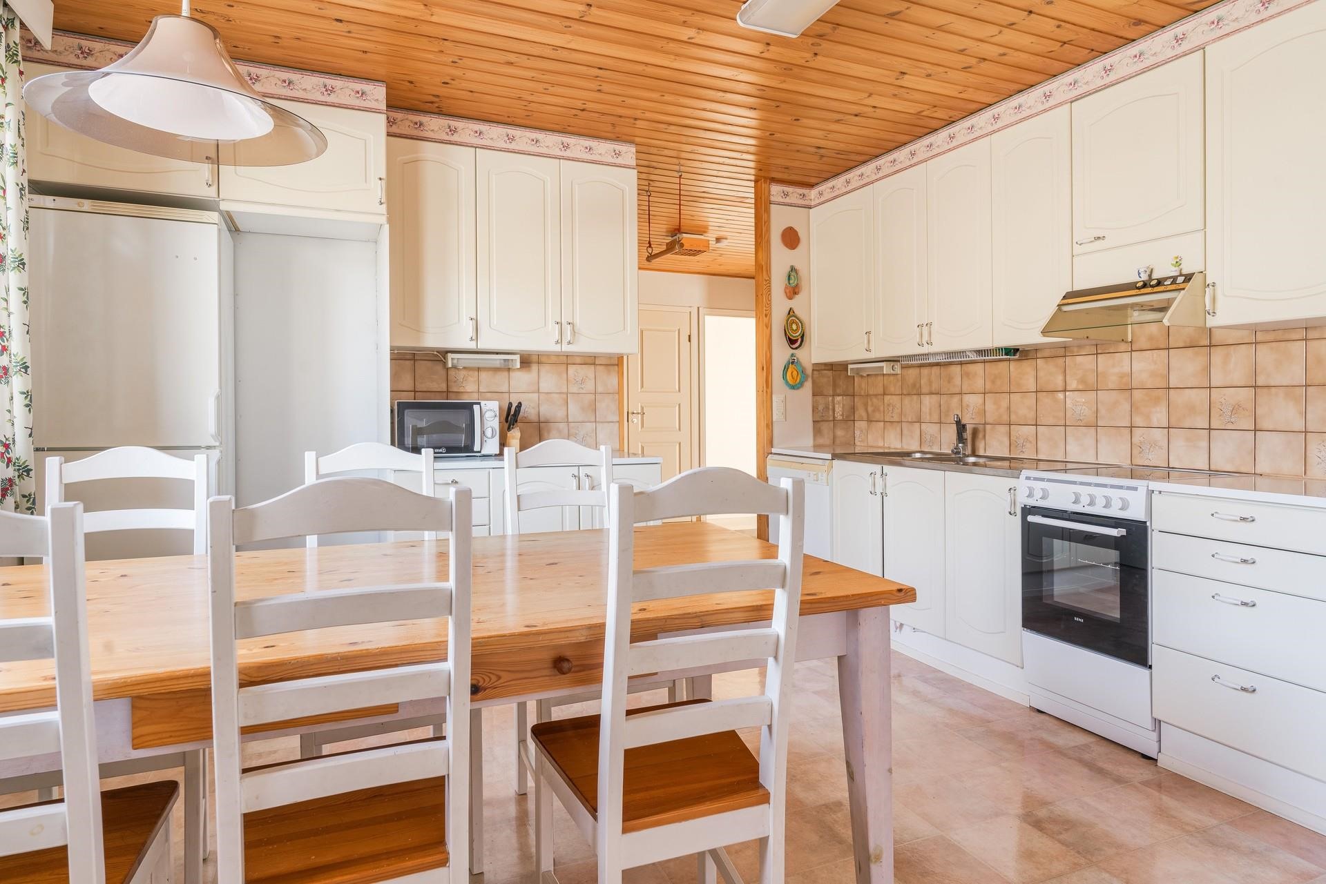Tilava keittiö mahdollistaa isonkin ruokapöydän sijoittamisen. Keittiön yhteydessä oleva kodinhoitohuone tekee arjen askareista sujuvia. Säilytystilaa on runsaasti kaapistoissa, kolmessa vaatehuoneessa sekä lämpimässä ulkovarastossa.