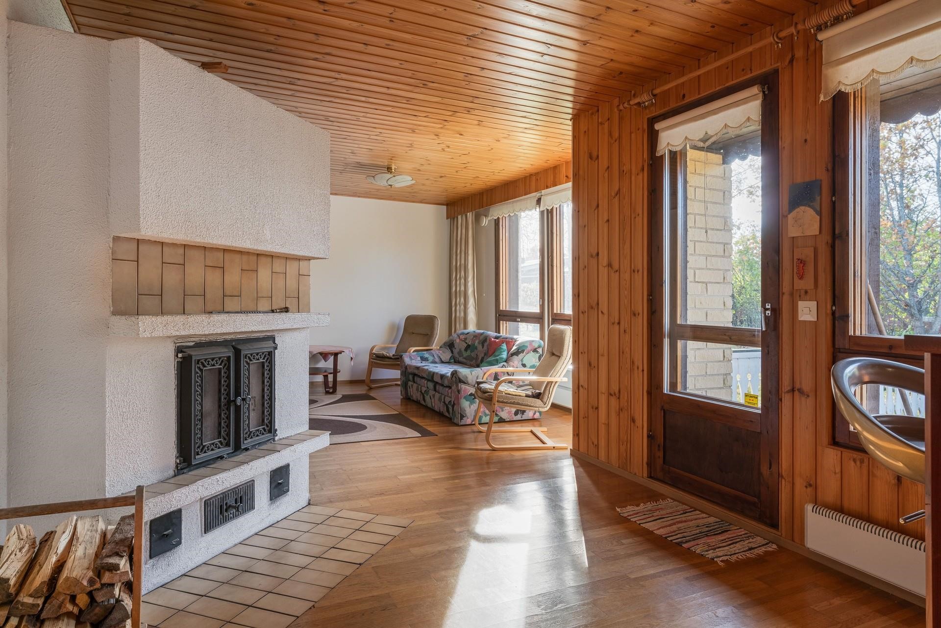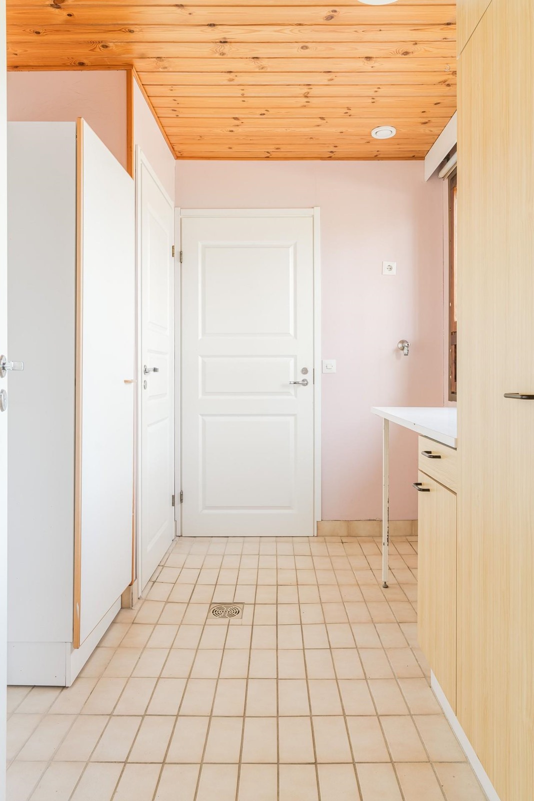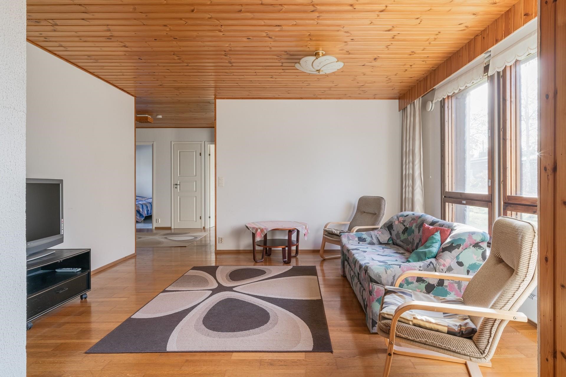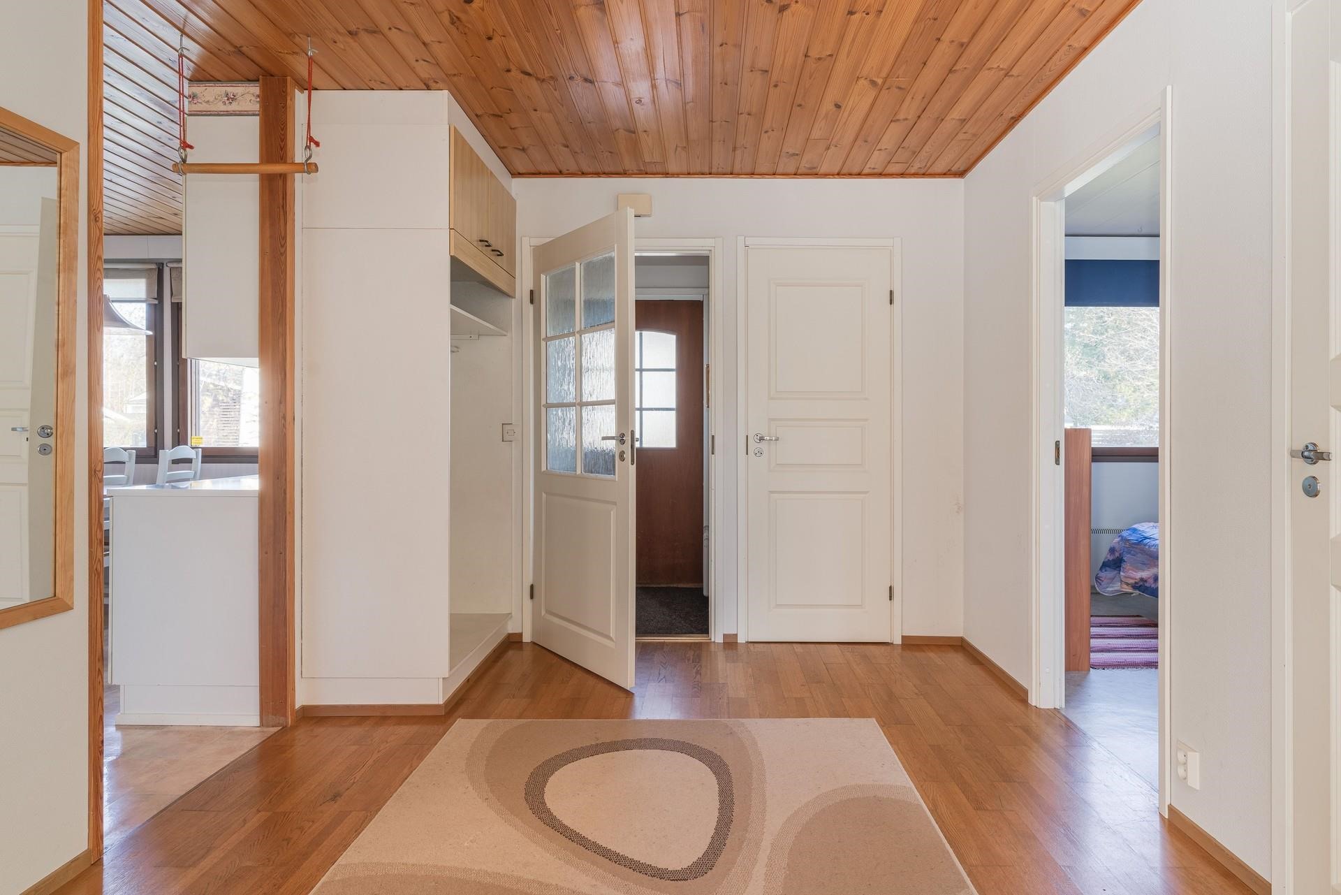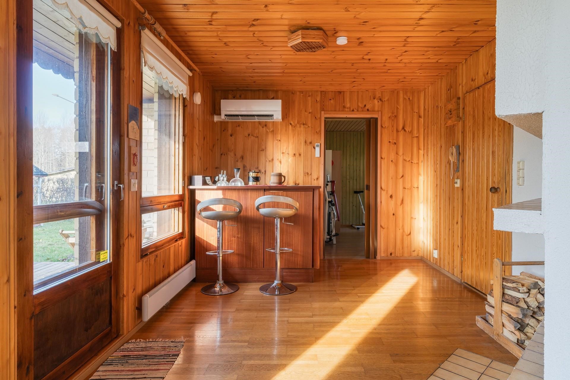 - Keittiö: Lattia muovimattoa, seinät tapetoitu. Olohuone: Lattia parkettia, seinät maalattu. Makuuhuone 1: Lattia muovimattoa, seinät maalattu. Makuuhuone 2: Lattia muovimattoa, seinät maalattu. Makuuhuone 3: Lattia muovimattoa, seinät maalattu. Kodinhoitohuone: Lattia laatoitettu, seinät maalattu. Sauna: Lattia laatoitettu, seinät paneelia. Kylpyhuone: Lattia laatoitettu, seinät kaakeloitu. Eteinen: Lattia parkettia, seinät maalattu. Wc: Lattia laatoitettu, seinät kaakeloitu. Takkahuone: Lattia parkettia, seinät paneelia. Harrastehuone: Lattia muovimattoa, seinät maalattu.