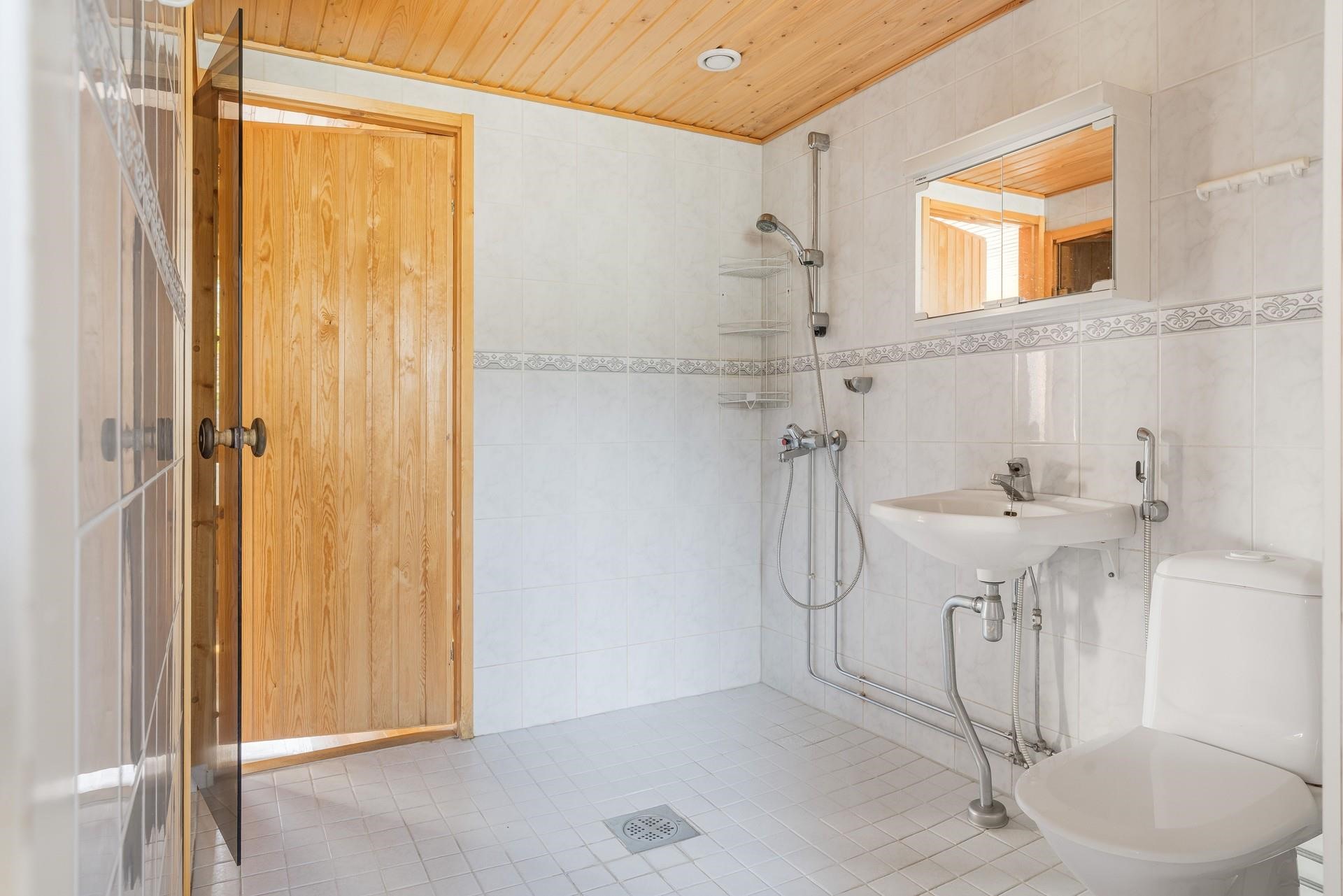 - Sauna, puukiuas, kylpyhuone, suihku, peilit, peilikaappi, kaapit, allaskaappi, pesukoneliitäntä, lattialämmitys, kiinteät valaisimet.