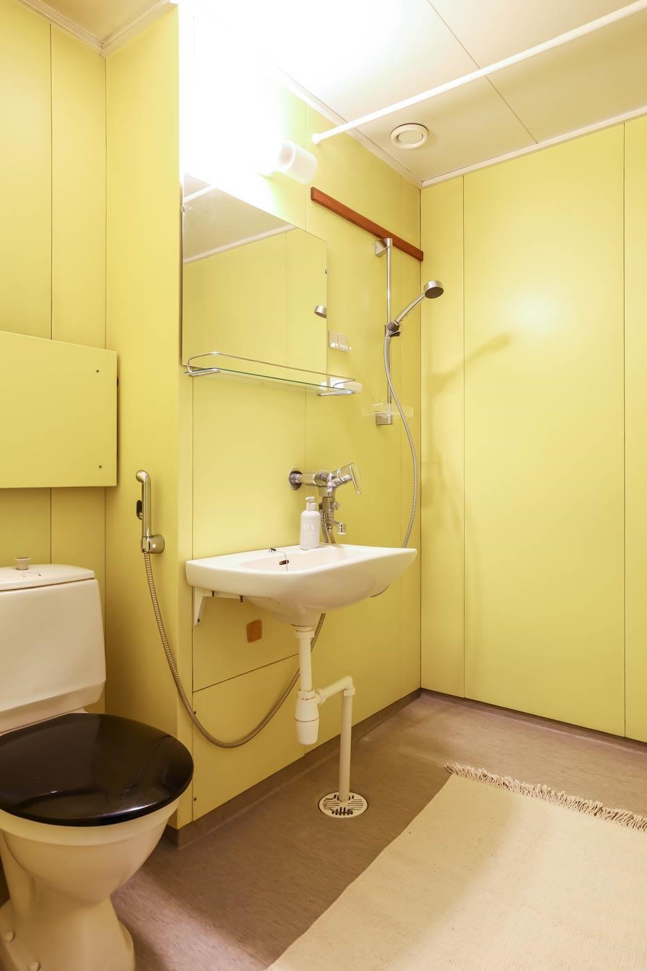 - Kylpyhuoneessa on suihku, peili, pesukoneliitäntä ja kiinteät valaisimet.