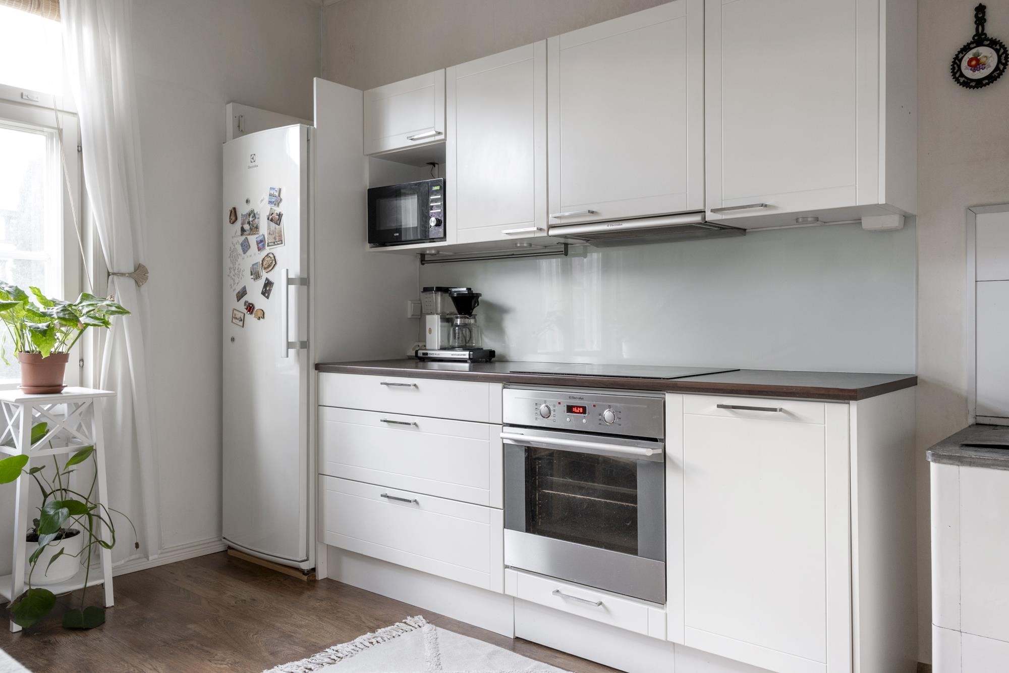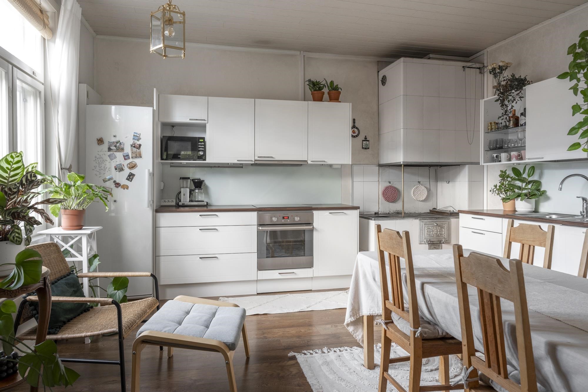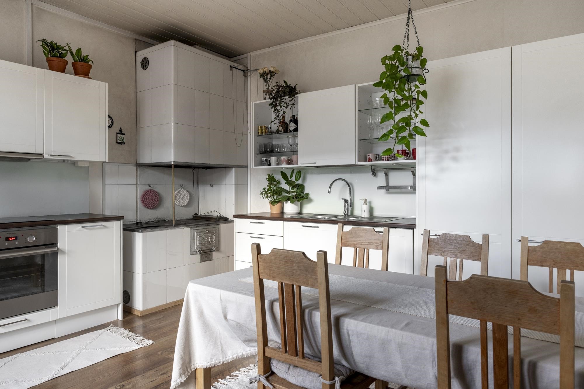 - Jääkaappi, pakastekaappi kellarissa, erillisuuni, keraaminen liesi, liesituuletin, astianpesukone, kaapistot, kiinteät valaisimet. Puuhella