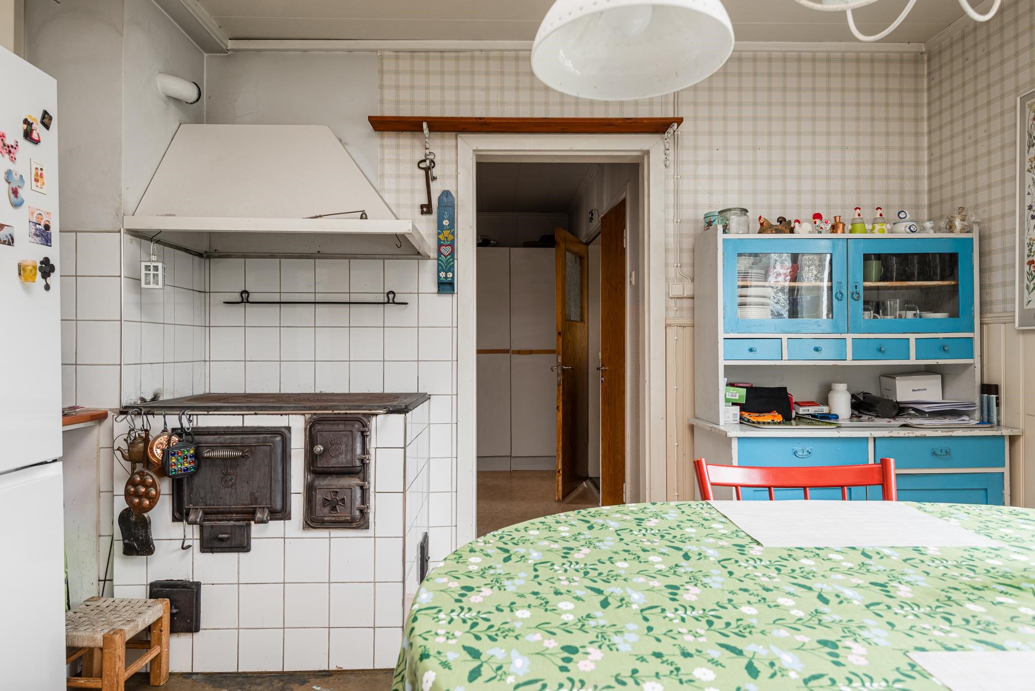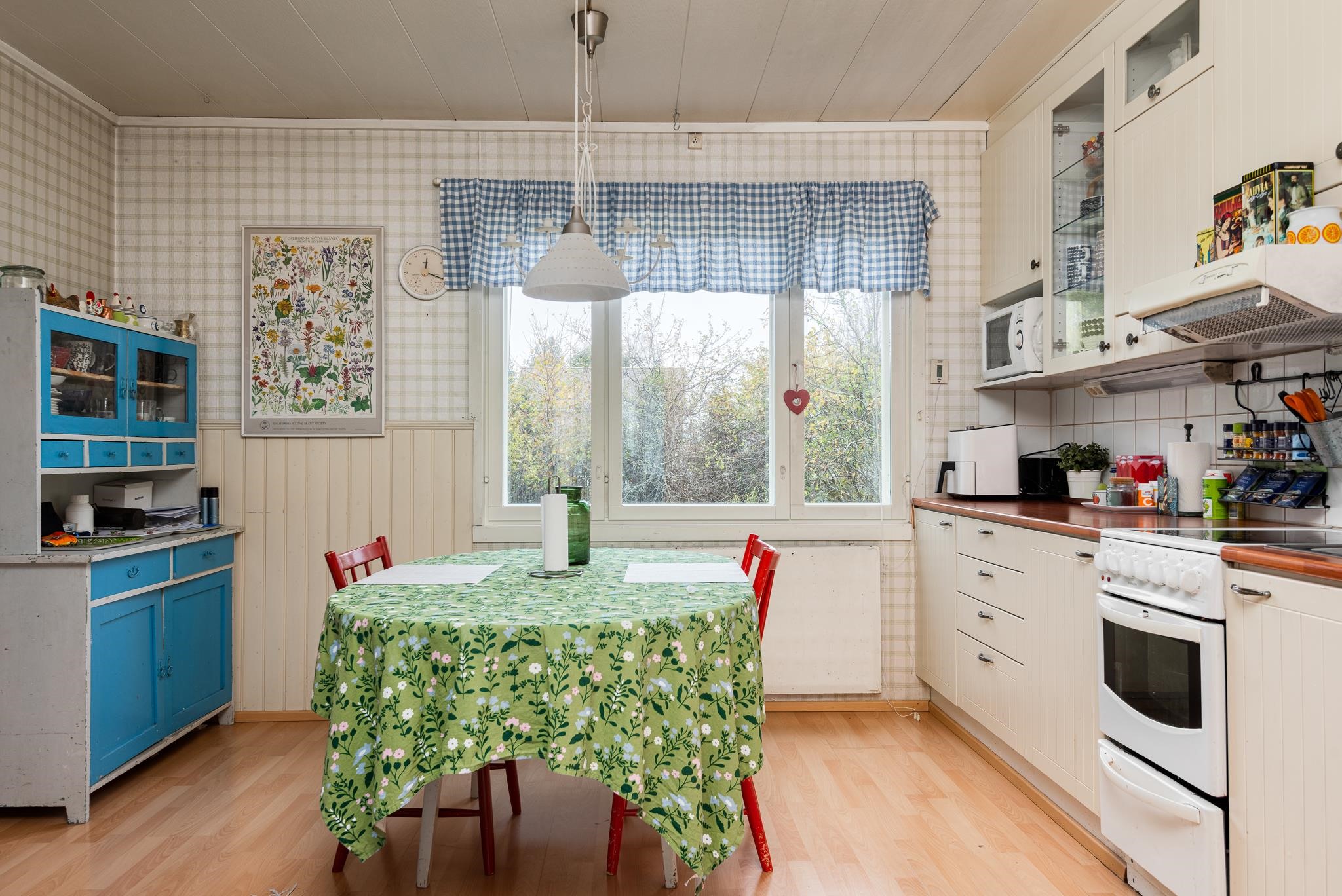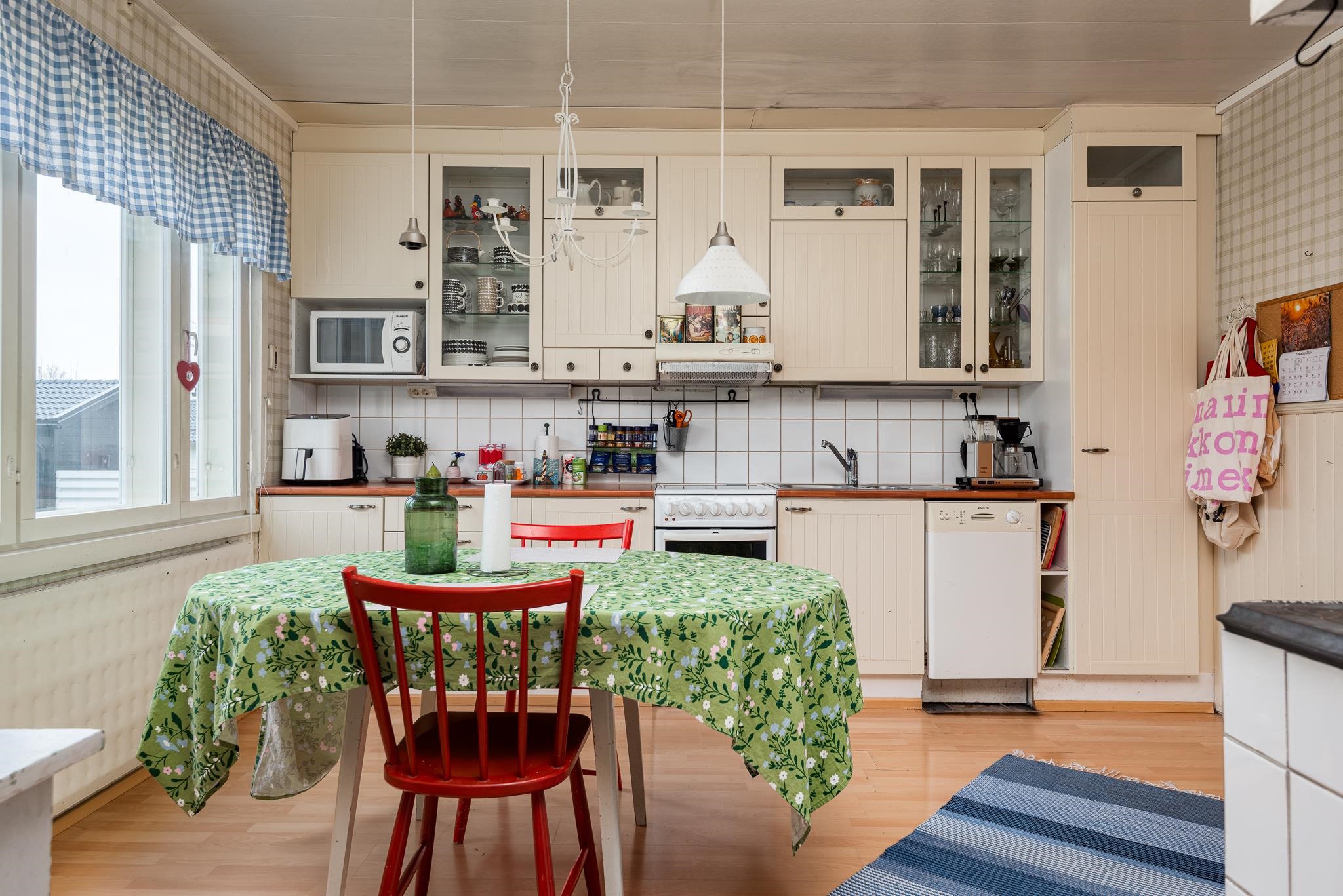 - Jääkaappipakastin, keraaminen liesi, liesituuletin ulos, astianpesukone, kaapistot, kiinteät valaisimet. Puuliesi