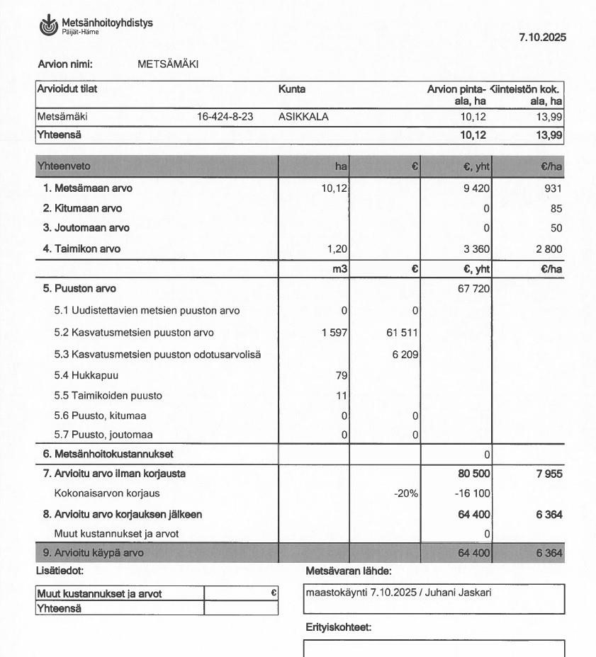 Kiinteistöstä on tehty metsäarvio 7.10.2025. Lähtöhinta 85 000e. Kiinteistöstä tulee jättää kirjallinen ostotarjous välittäjälle viimeistään 15.11.2025. Tarjouksiin pidätetään oikeus hylätä tai hyväksyä tarjoukset. Ostaja vastaa mahdollisista kaupantekoon liittyvistä lainhuuto-, varainsiirtovero- ja kaupanvahvistusmaksuista.