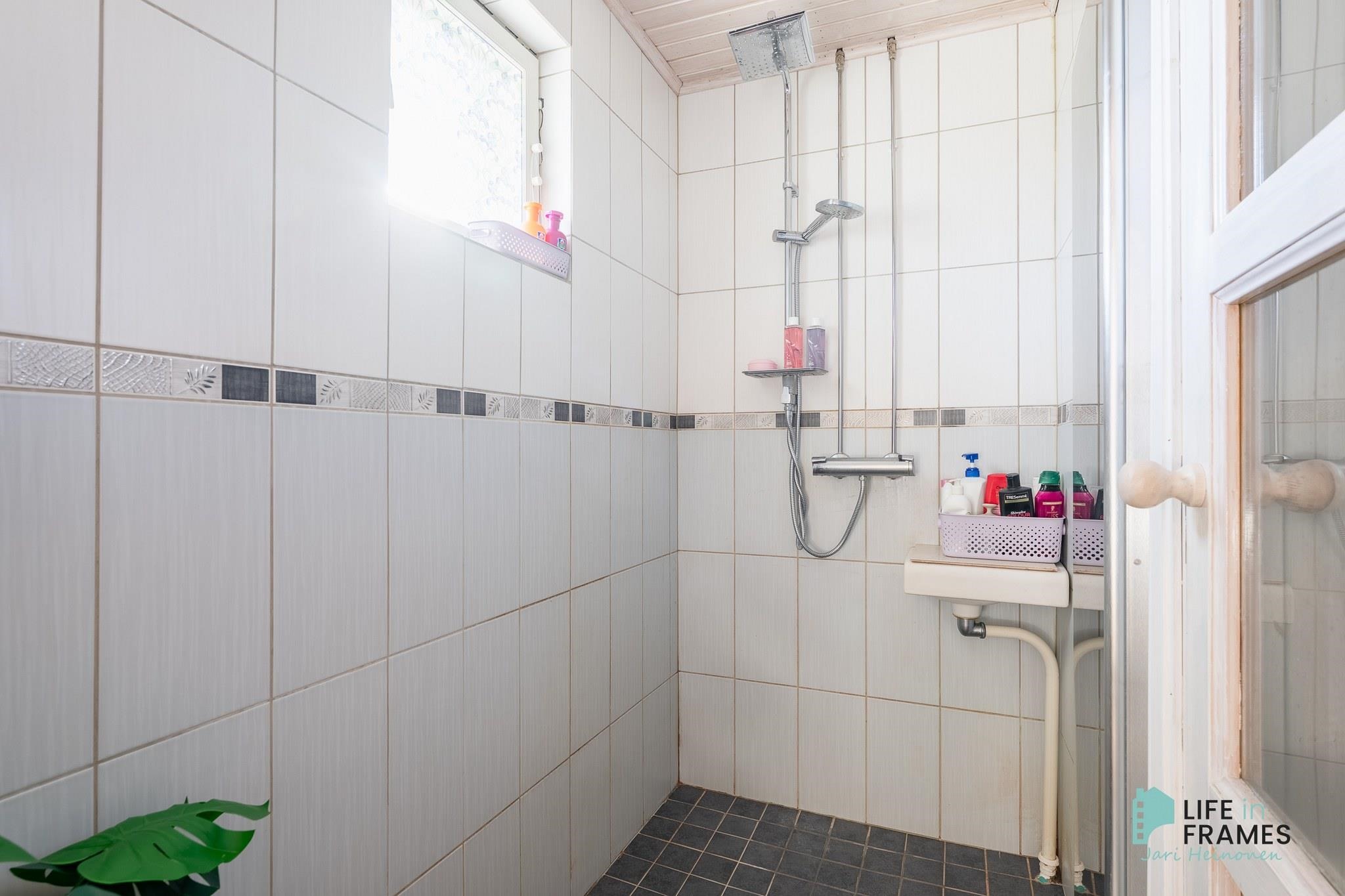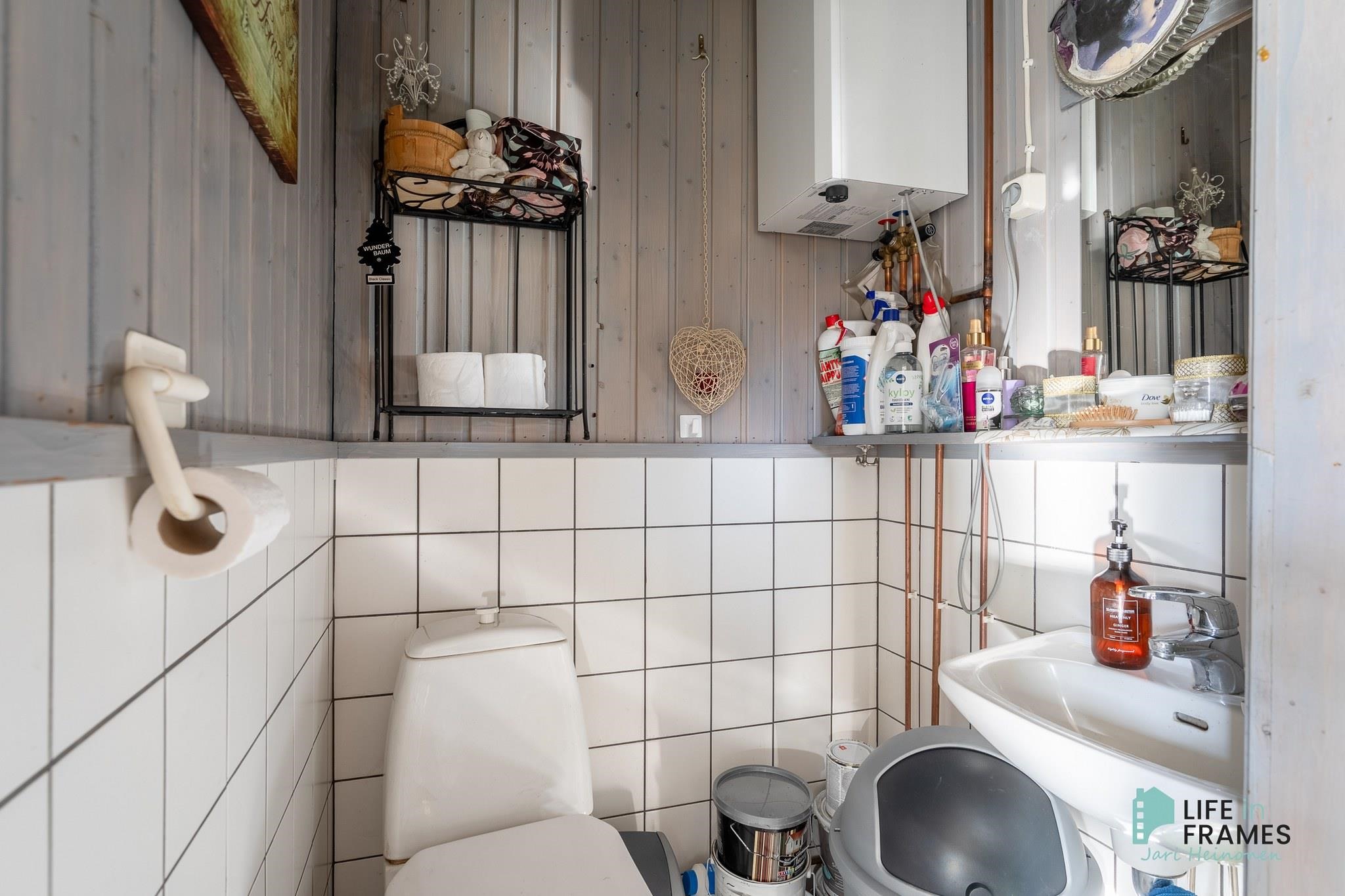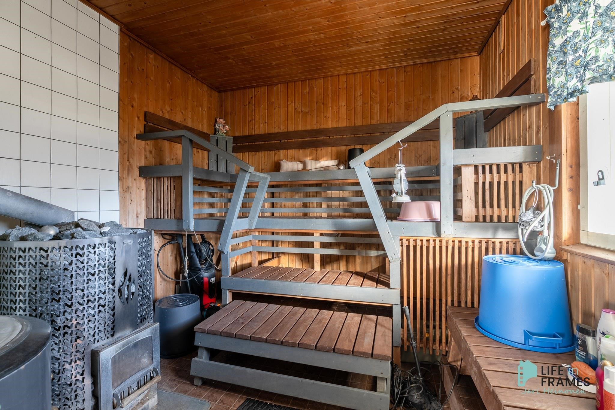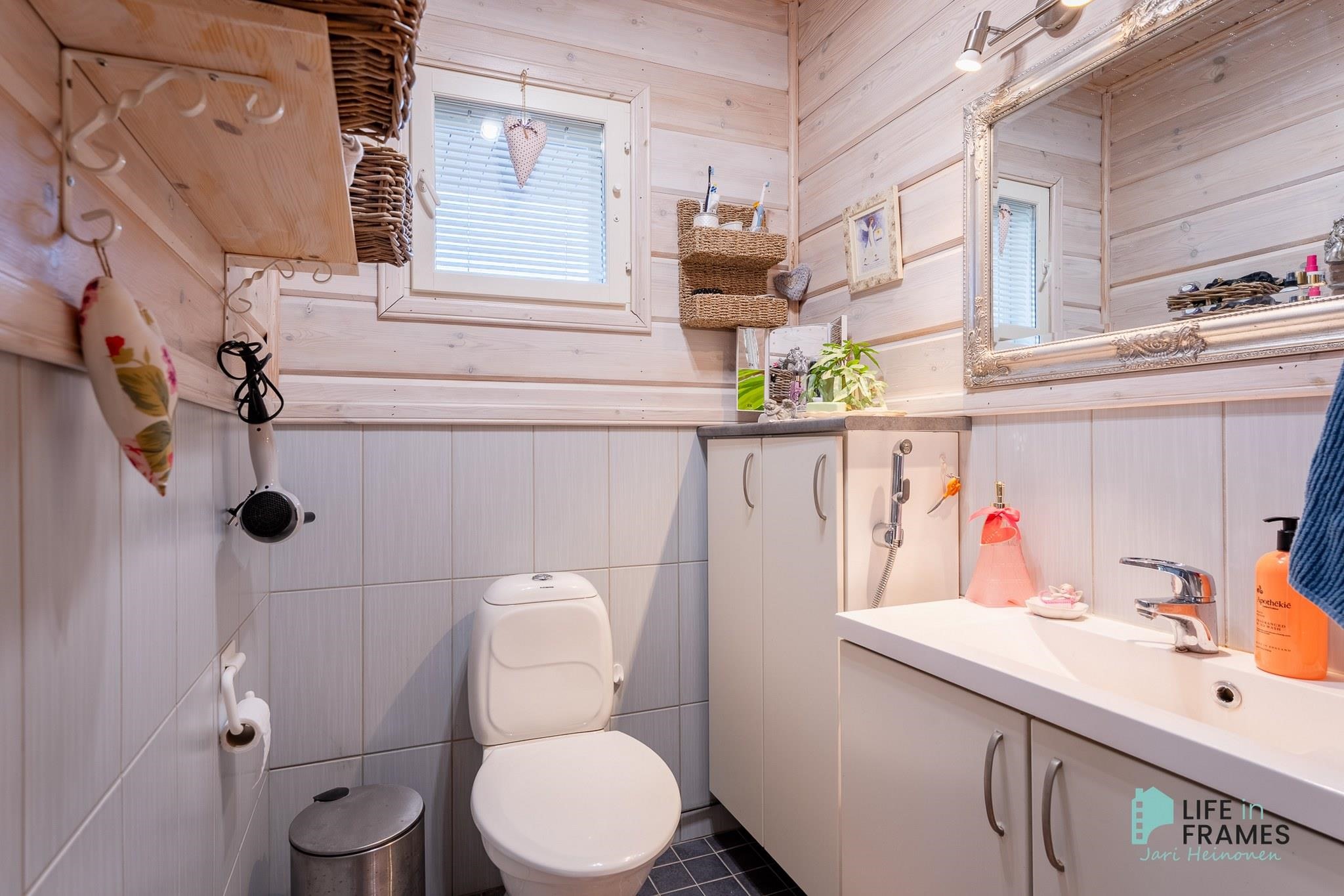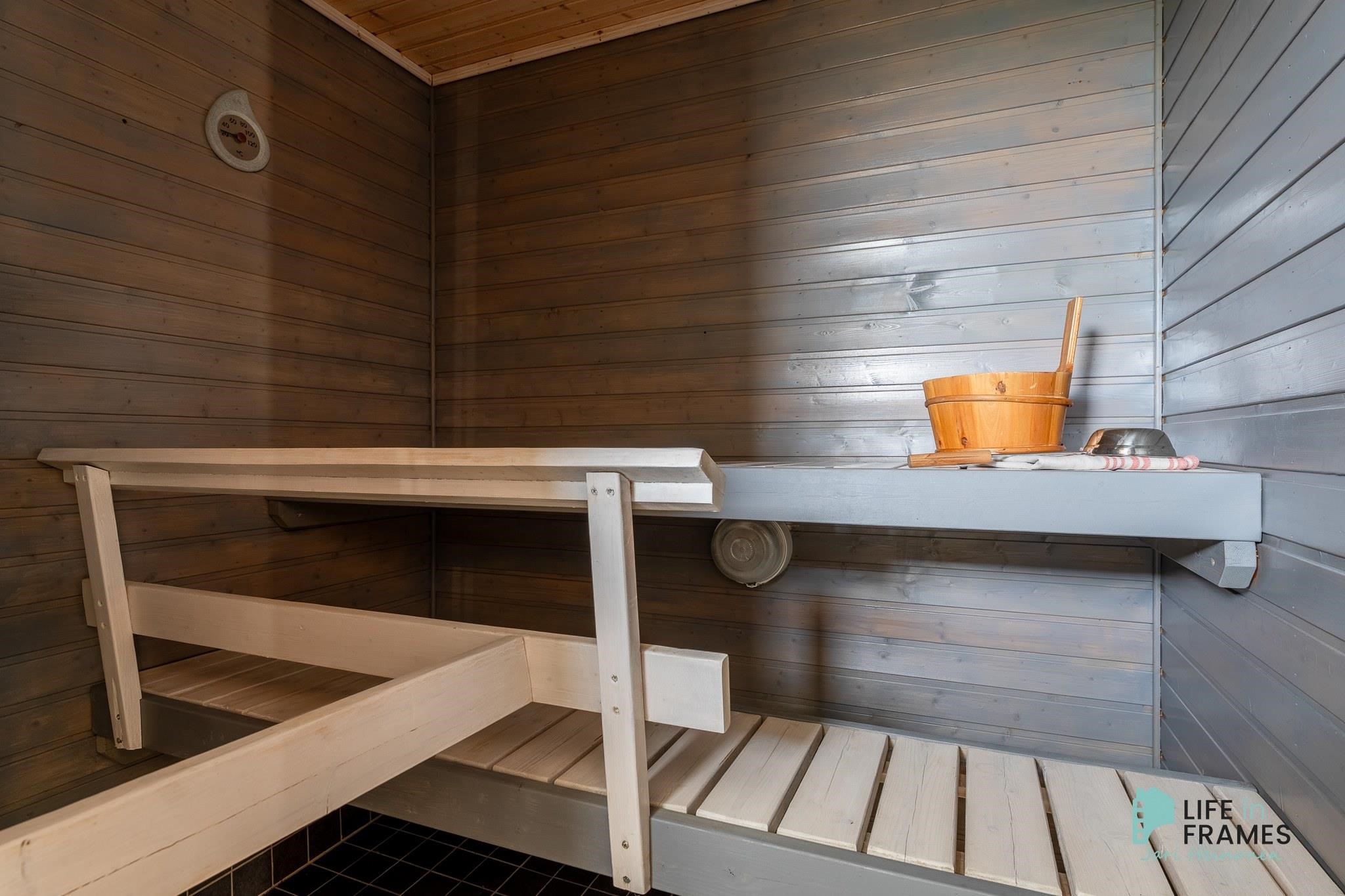 - Sauna, sähkökiuas, puukiuas (ulkosaunassa), kylpyhuone, erillinen wc (myös ulkorakennuksessa), suihku, suihkuseinä, peilikaappi, kaapit, allaskaappi, pesukoneliitäntä, lattialämmitys, kiinteät valaisimet.