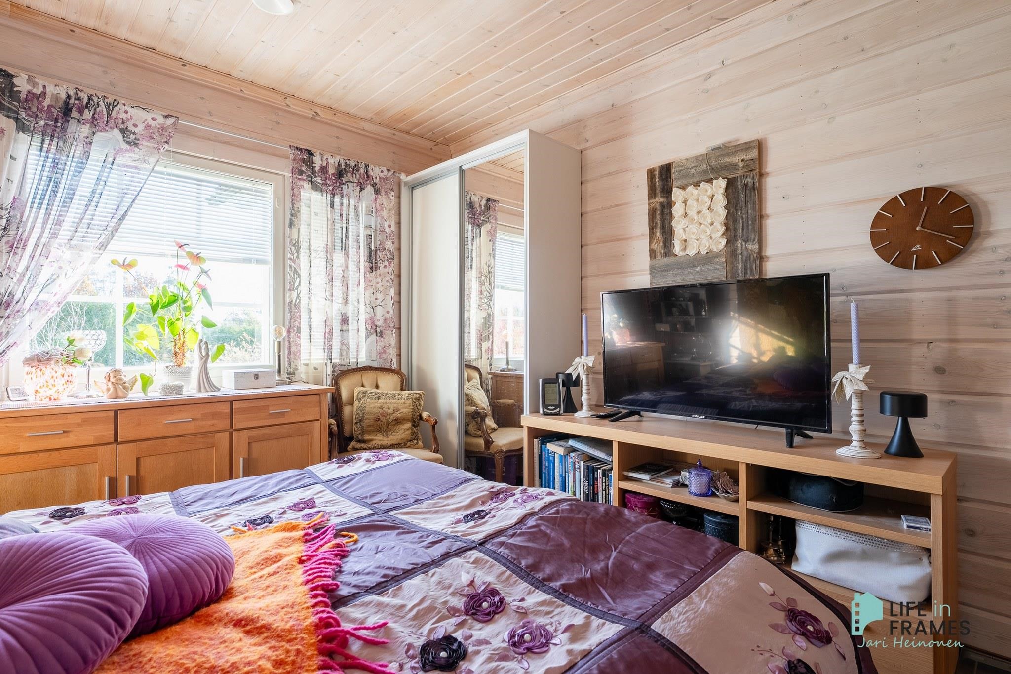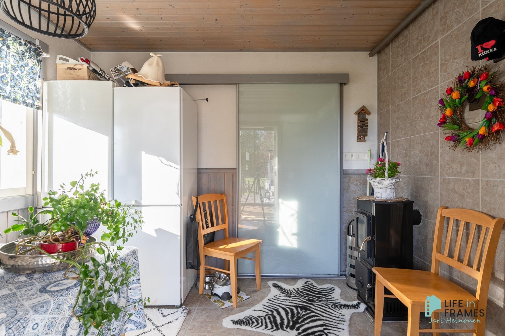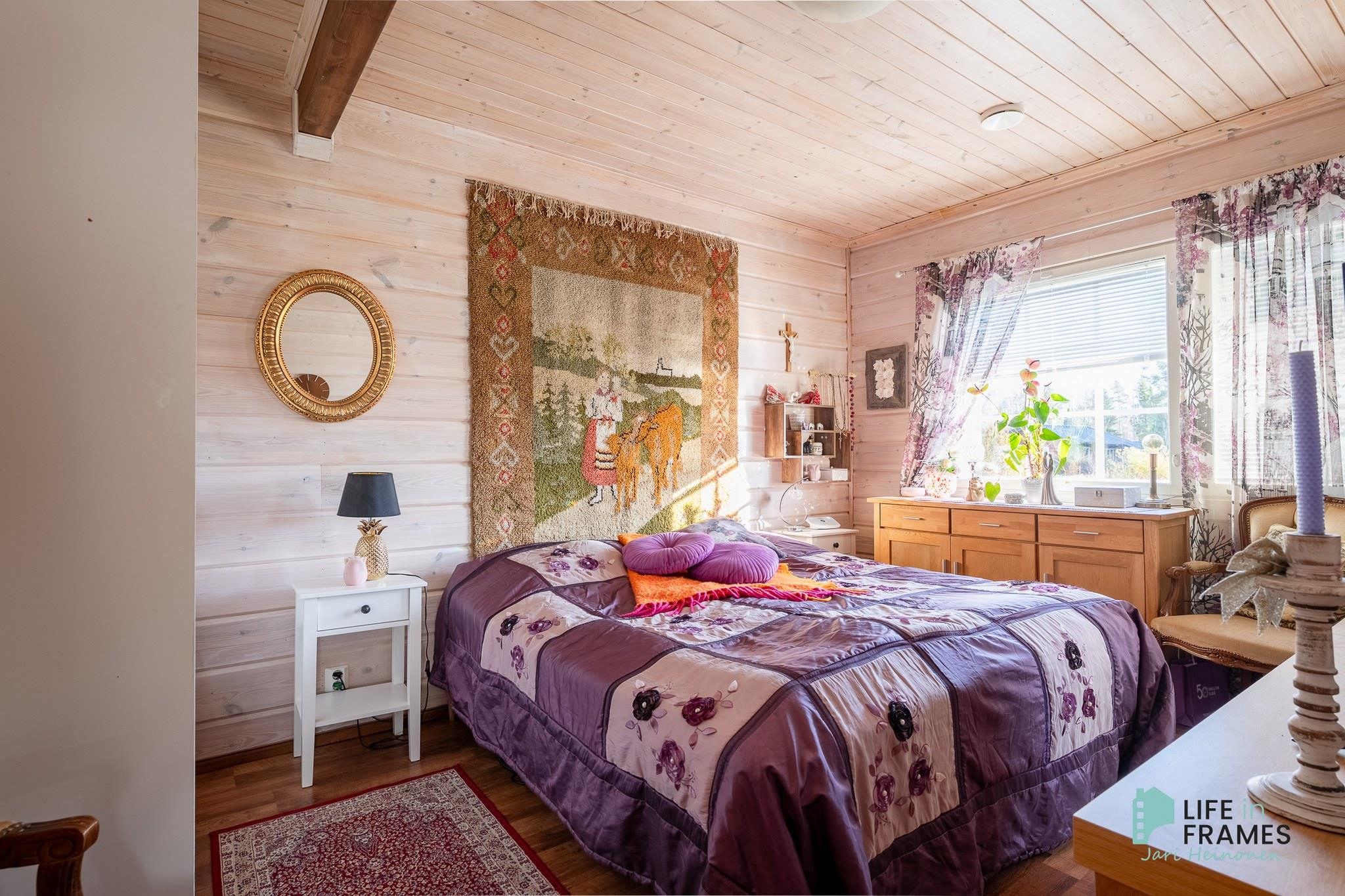 - Huonetilat: hirsiseinät, lattiassa laatta/laminaatti.