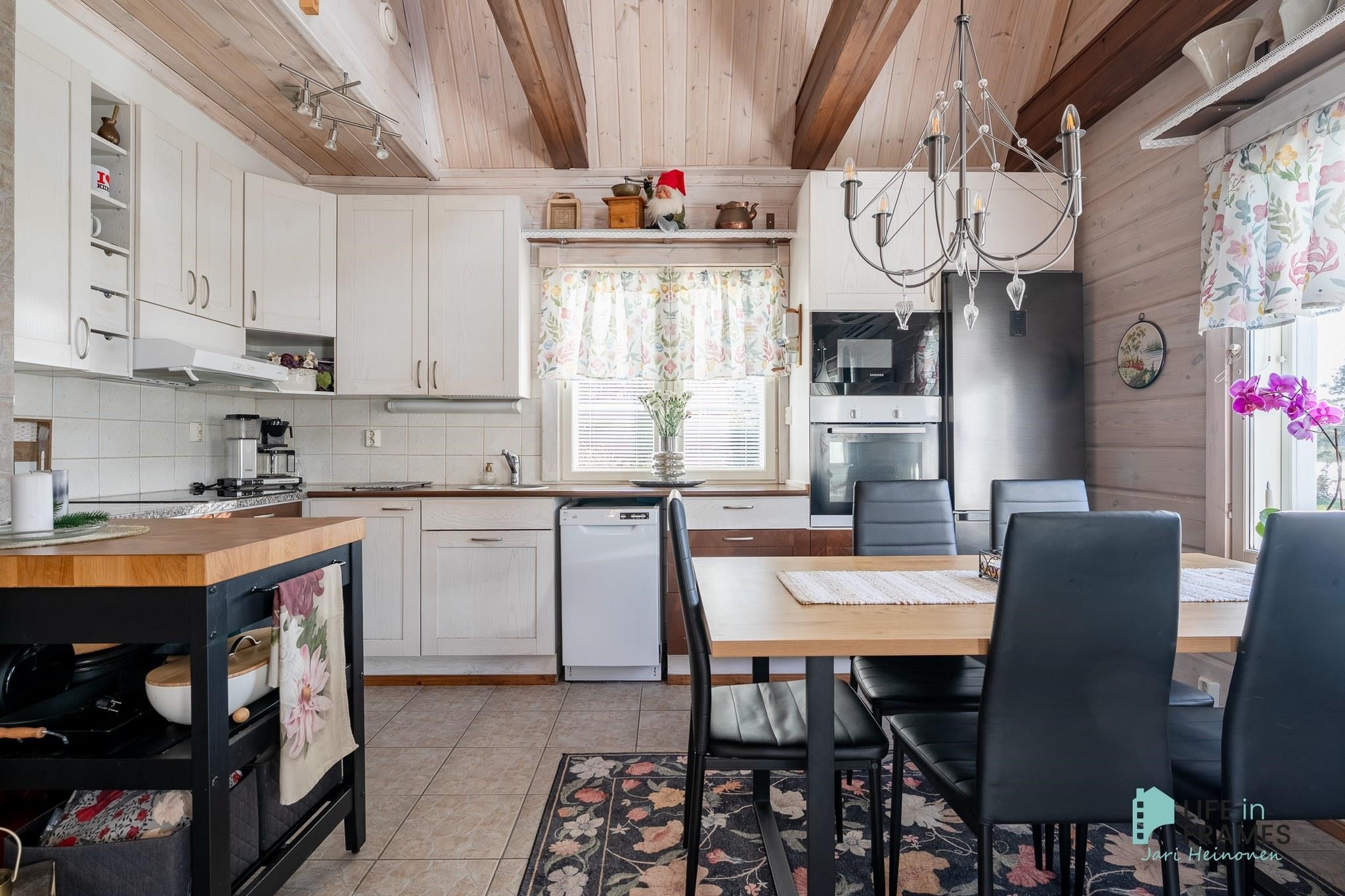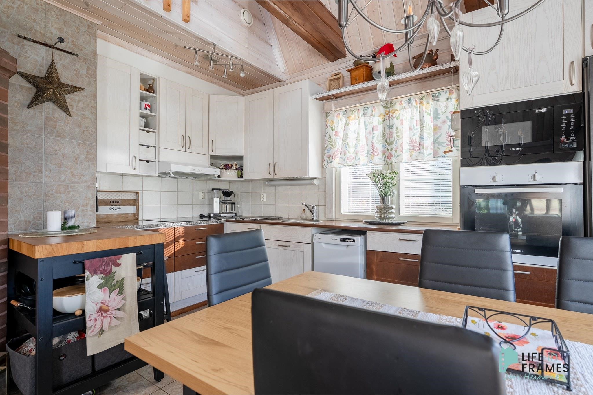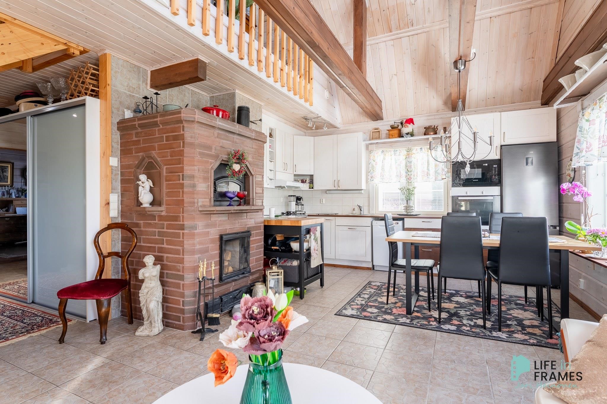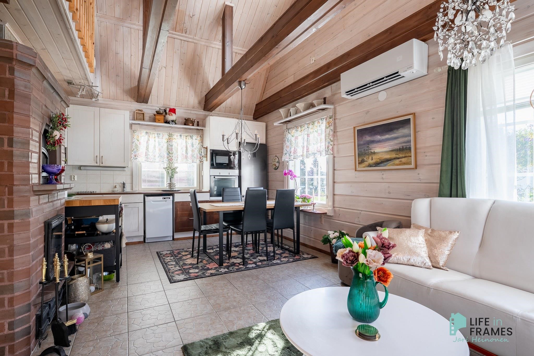 Tässä on valmis kokonaisuus, jossa ei ole tarvetta isoille remonteille. Valoisa tupakeittiö kutsuu viettämään aikaa yhdessä perheen ja ystävien kanssa. Ylös asti avoin tila tuntuu neliöitään isommalta korkeamman huonekorkeuden myötä.