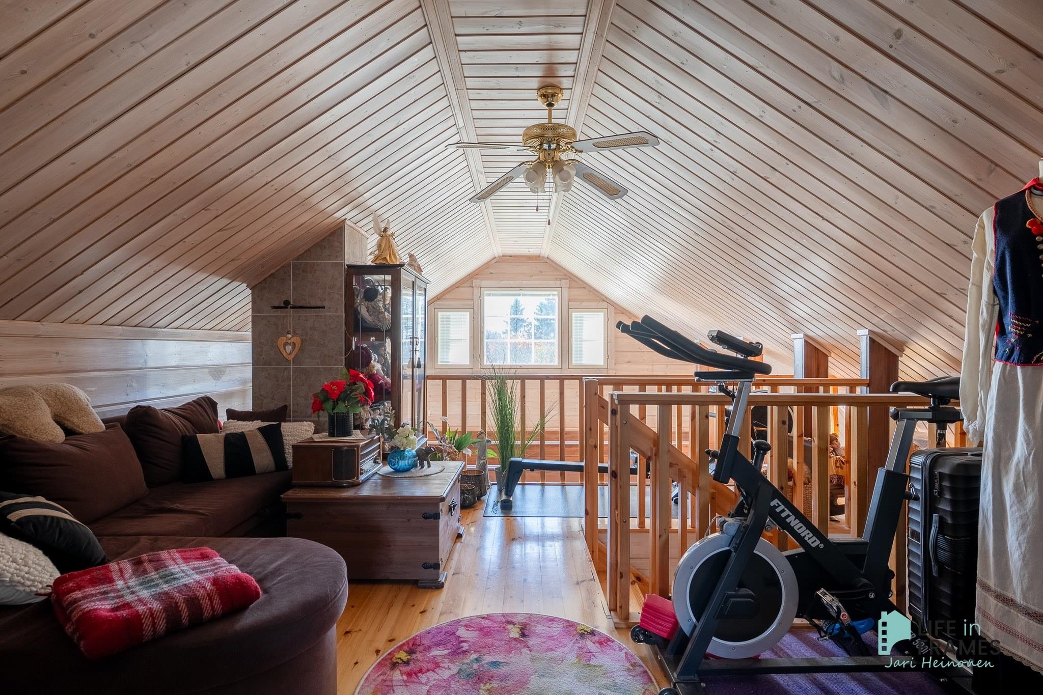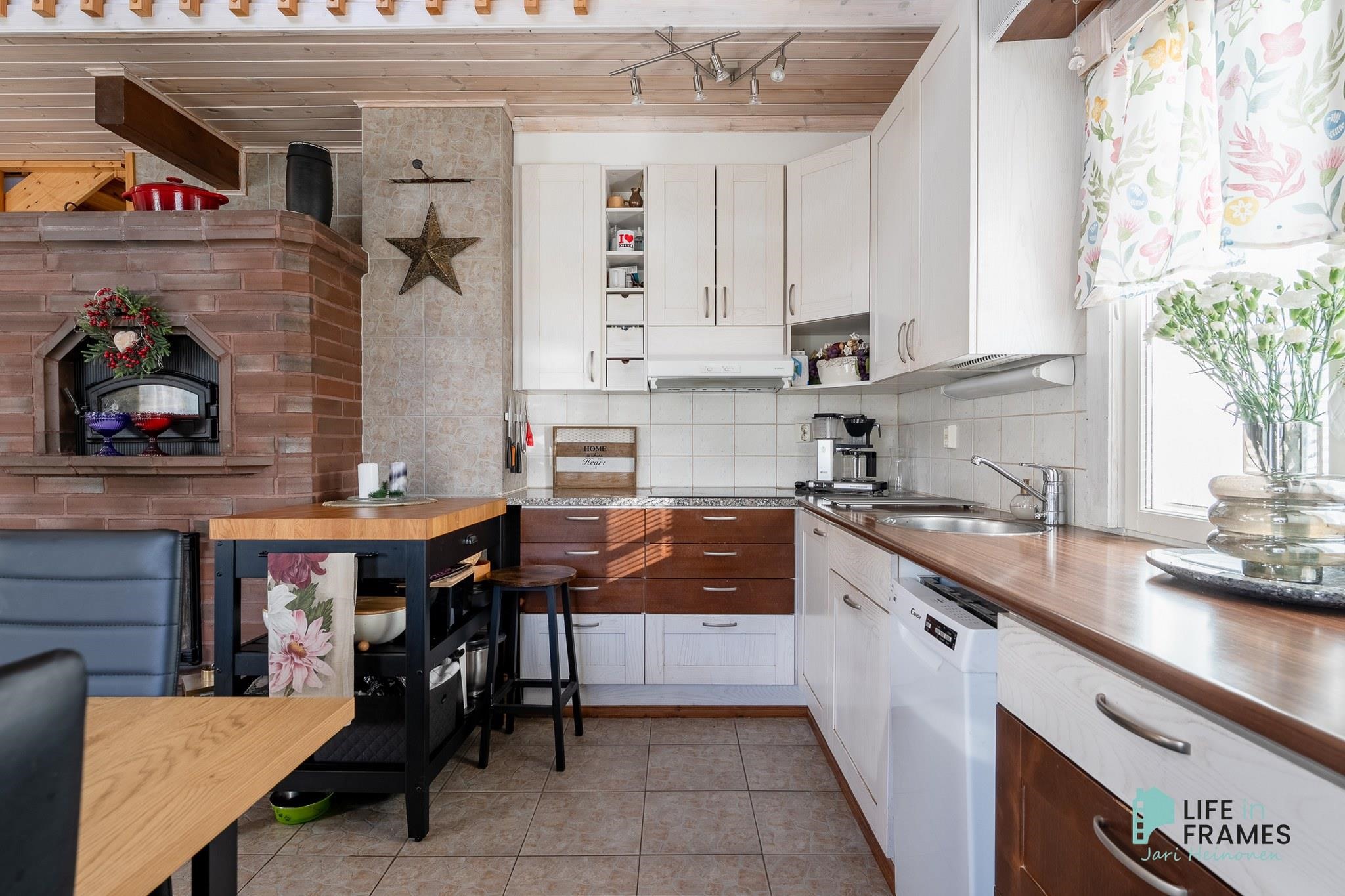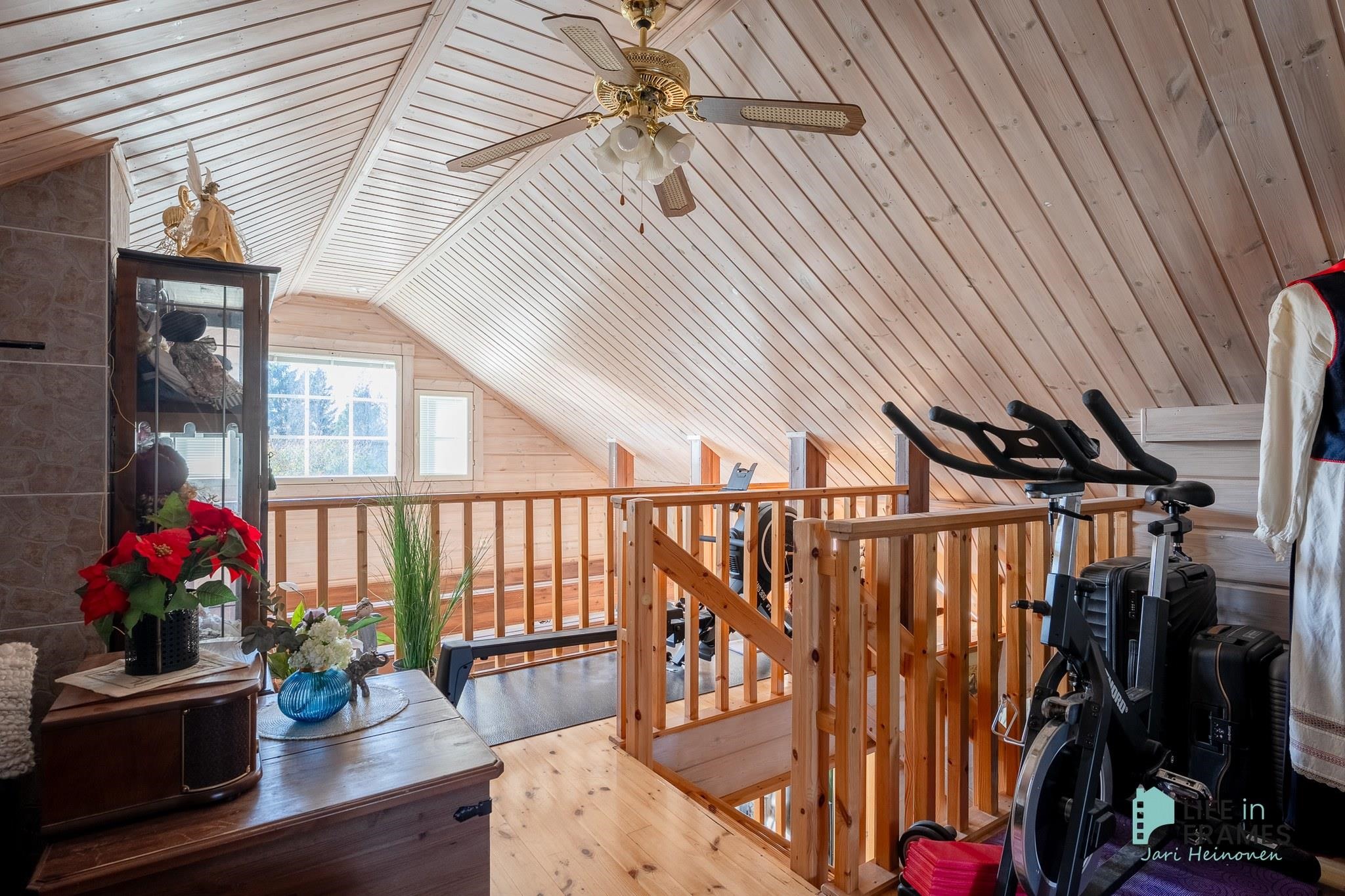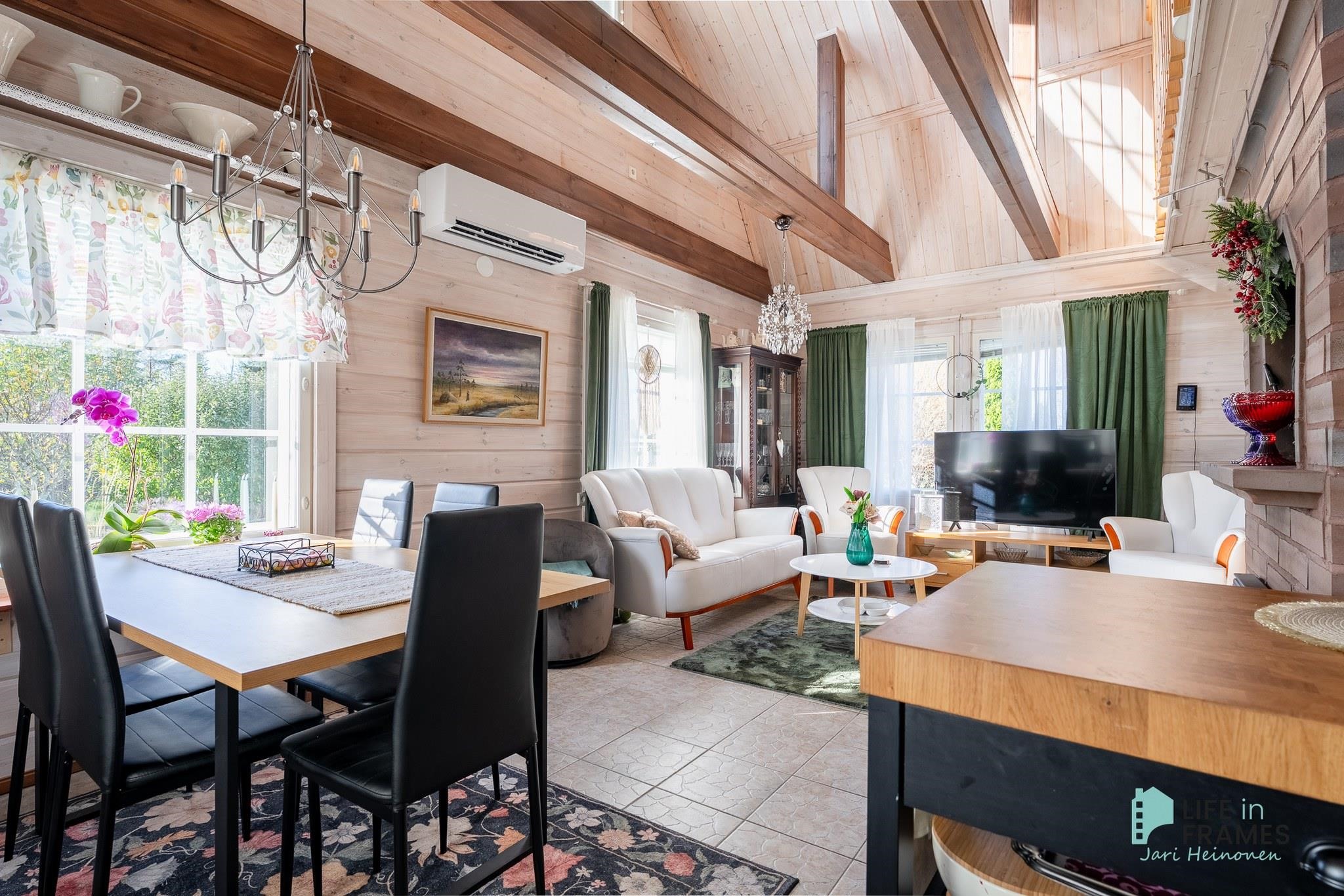 Tässä on valmis kokonaisuus, jossa ei ole tarvetta isoille remonteille. Valoisa tupakeittiö kutsuu viettämään aikaa yhdessä perheen ja ystävien kanssa. Ylös asti avoin tila tuntuu neliöitään isommalta korkeamman huonekorkeuden myötä.