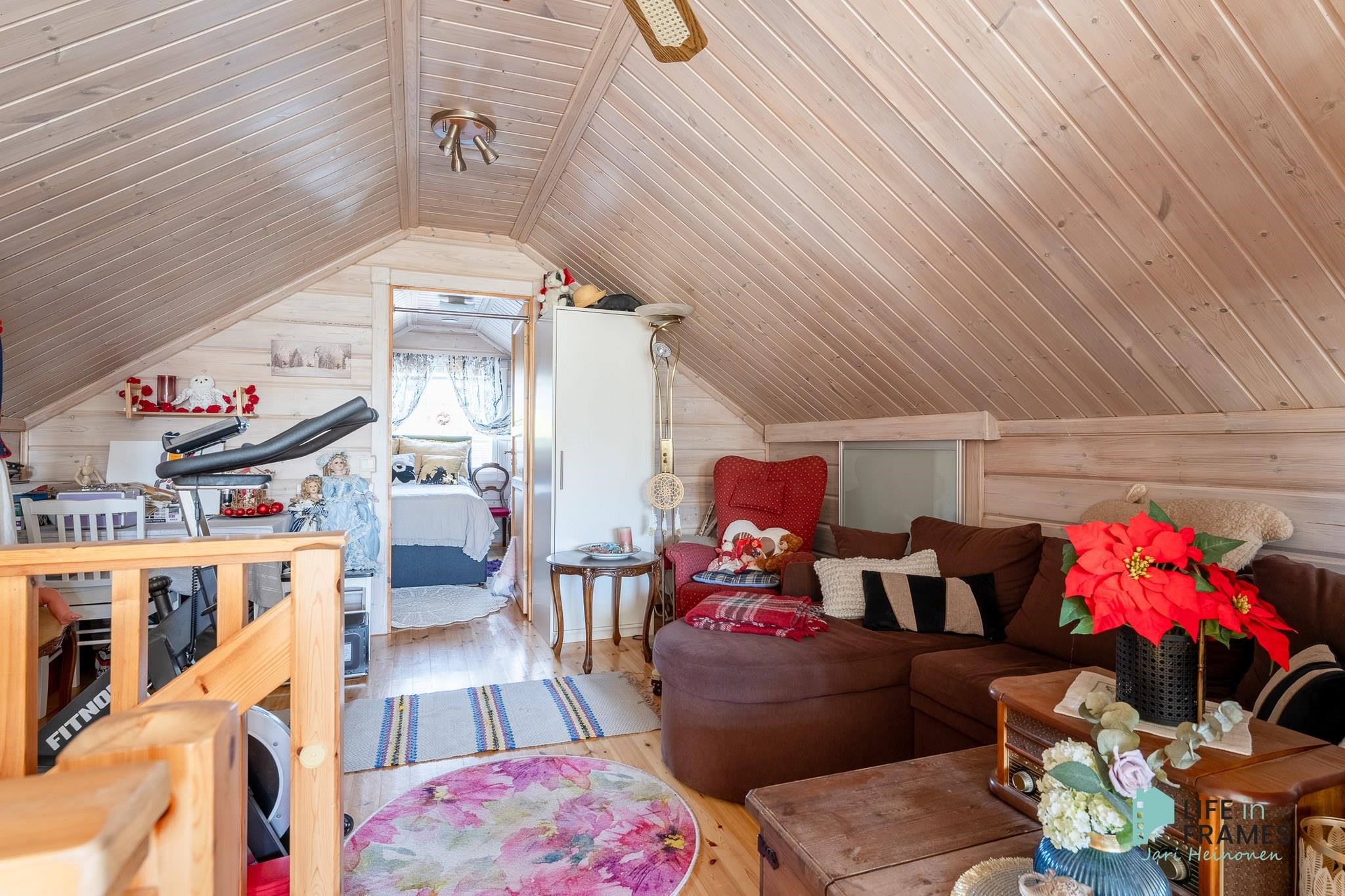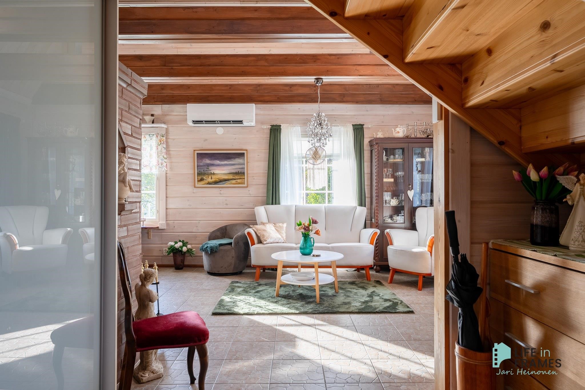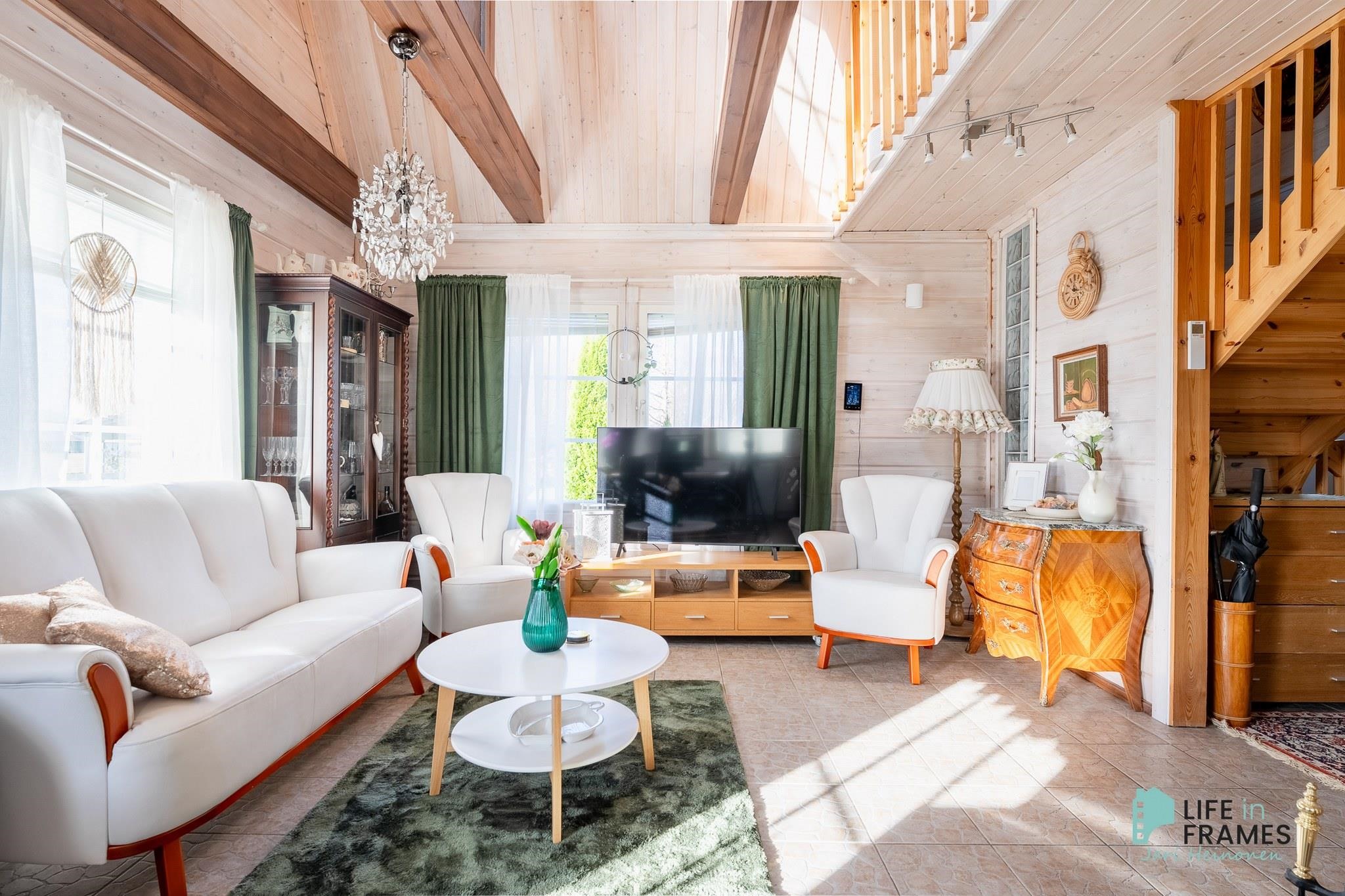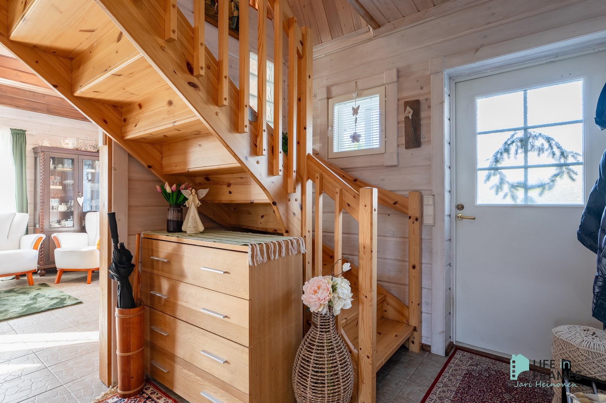 Tässä on valmis kokonaisuus, jossa ei ole tarvetta isoille remonteille. Valoisa tupakeittiö kutsuu viettämään aikaa yhdessä perheen ja ystävien kanssa. Ylös asti avoin tila tuntuu neliöitään isommalta korkeamman huonekorkeuden myötä.