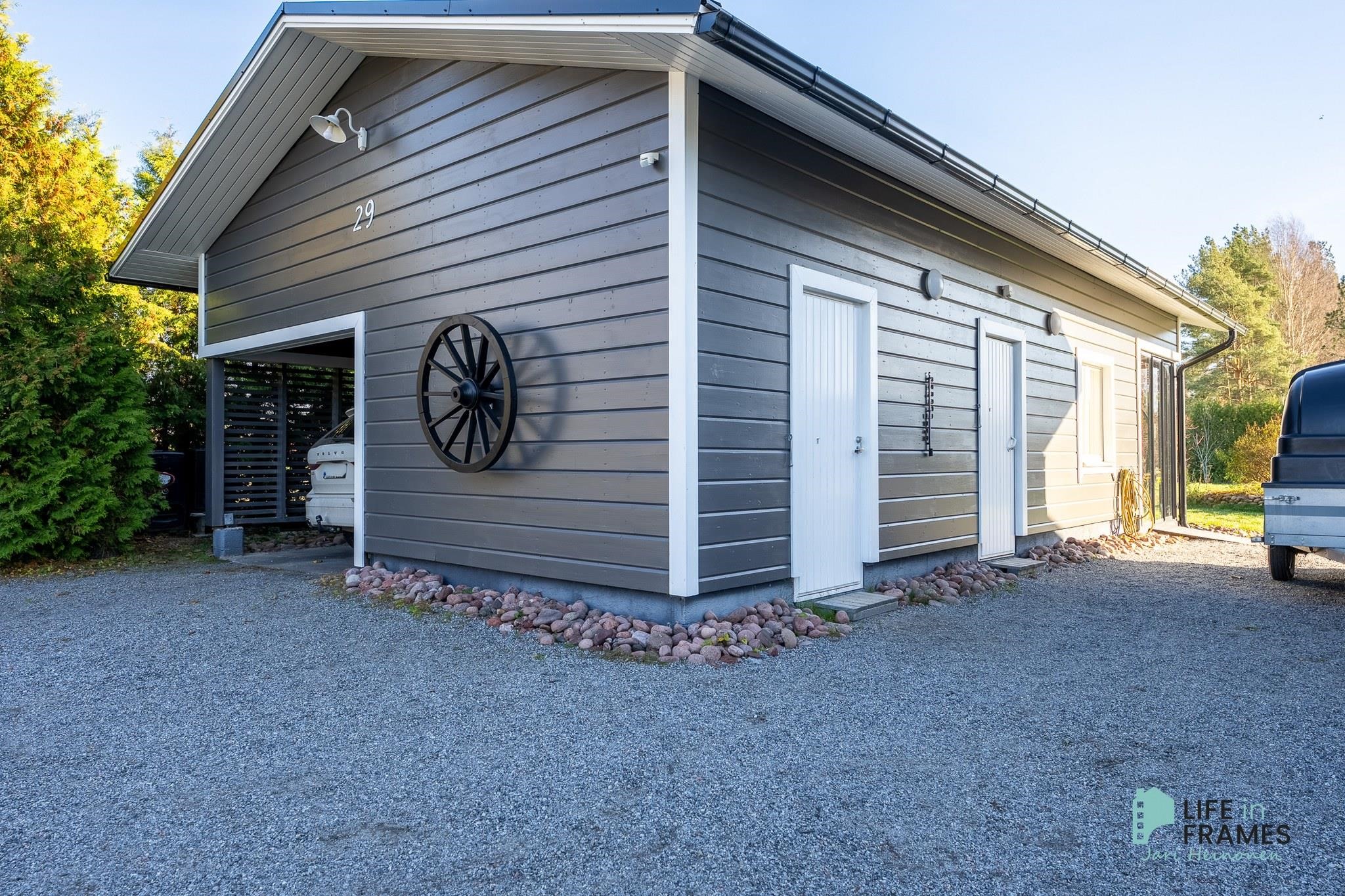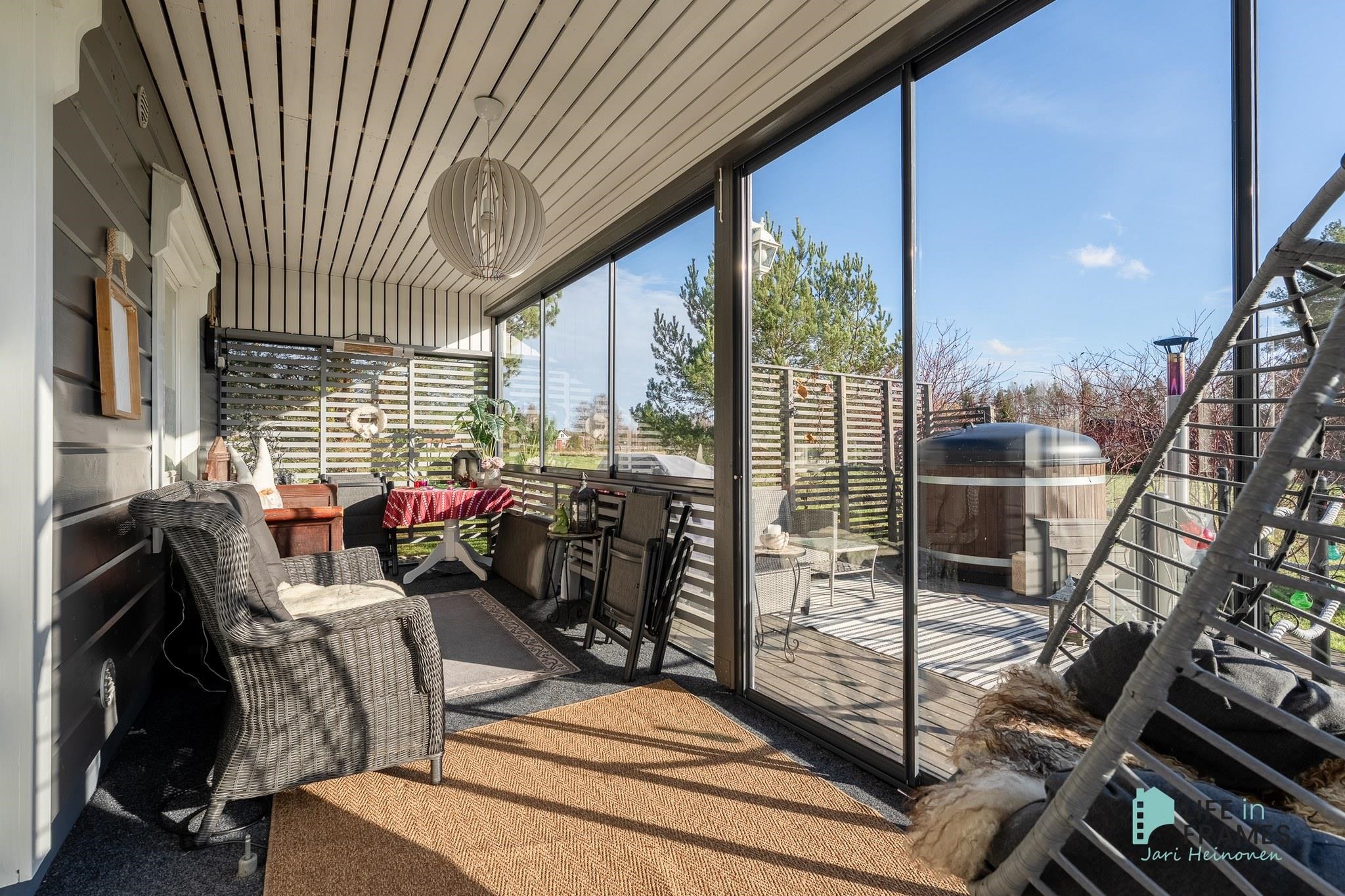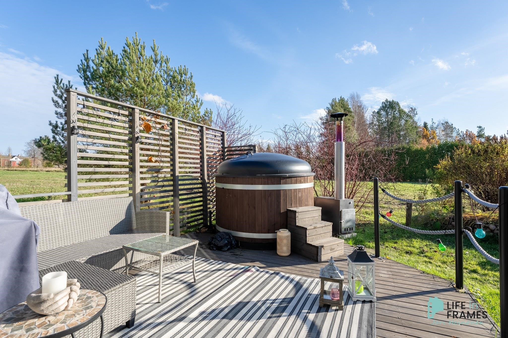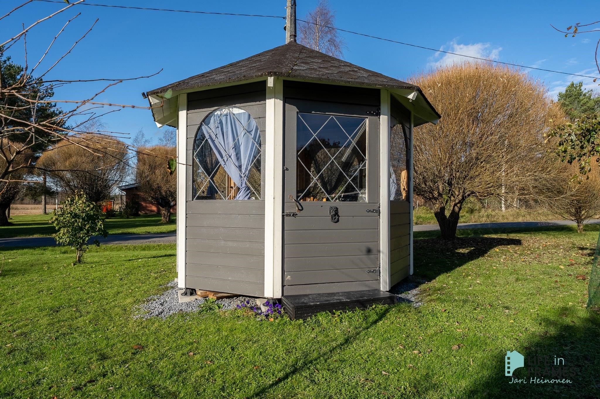 Ulkorakennuksessa on puilla lämpiävä sauna ja sen yhteydessä on tupa, jossa on myös kamiina ja erillinen wc, joten se voisi hyvin palvella vaikka etätyöpisteenä. Lasitettu terassi jatkaa terassikautta keväästä pitkälle syksyyn. Terassi jatkuu myös lasittamattomana ja sen yhteydestä löytyvä kylpytynnyri viimeistelee tämän kohteen.