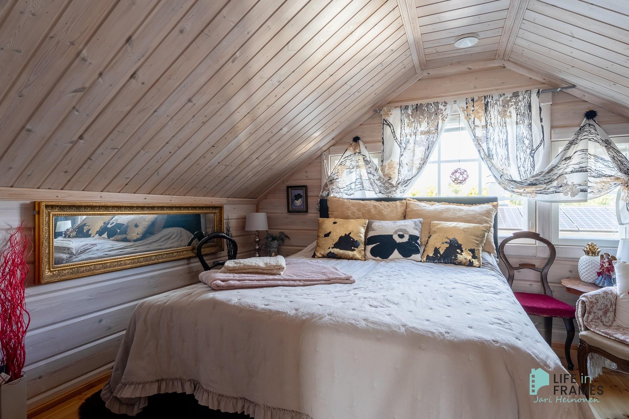 Talosta löytyy kolme makuuhuonetta, joista yksi on yläkerrassa. Kodinhoitohuone vastaa nykyajan tarpeita ja pesu- ja saunatilat ovat sen yhteydessä. Talo itsessään on erittäin viehättävä hirsiseinineen, mutta ulkorakennuksesta löytyy jotain, joka kruunaa tämän kohteen.