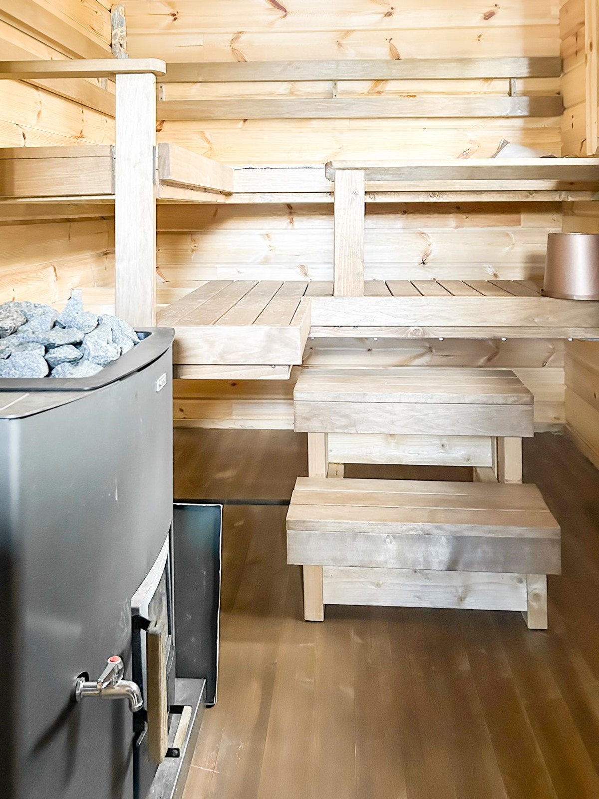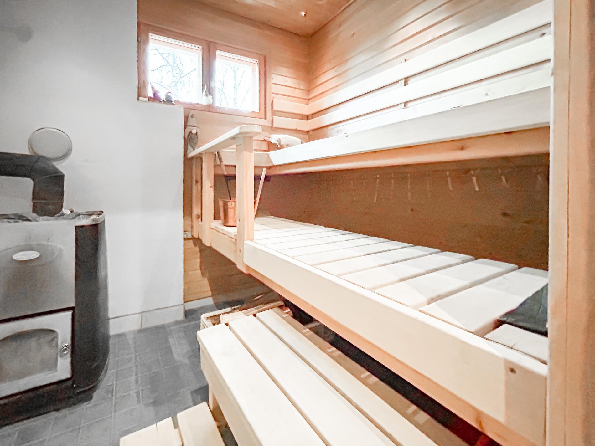 - Sauna, puukiuas, kylpyhuone, erillinen wc, peilikaappi, allaskaappi, pesukoneliitäntä, lattialämmitys, kiinteät valaisimet.