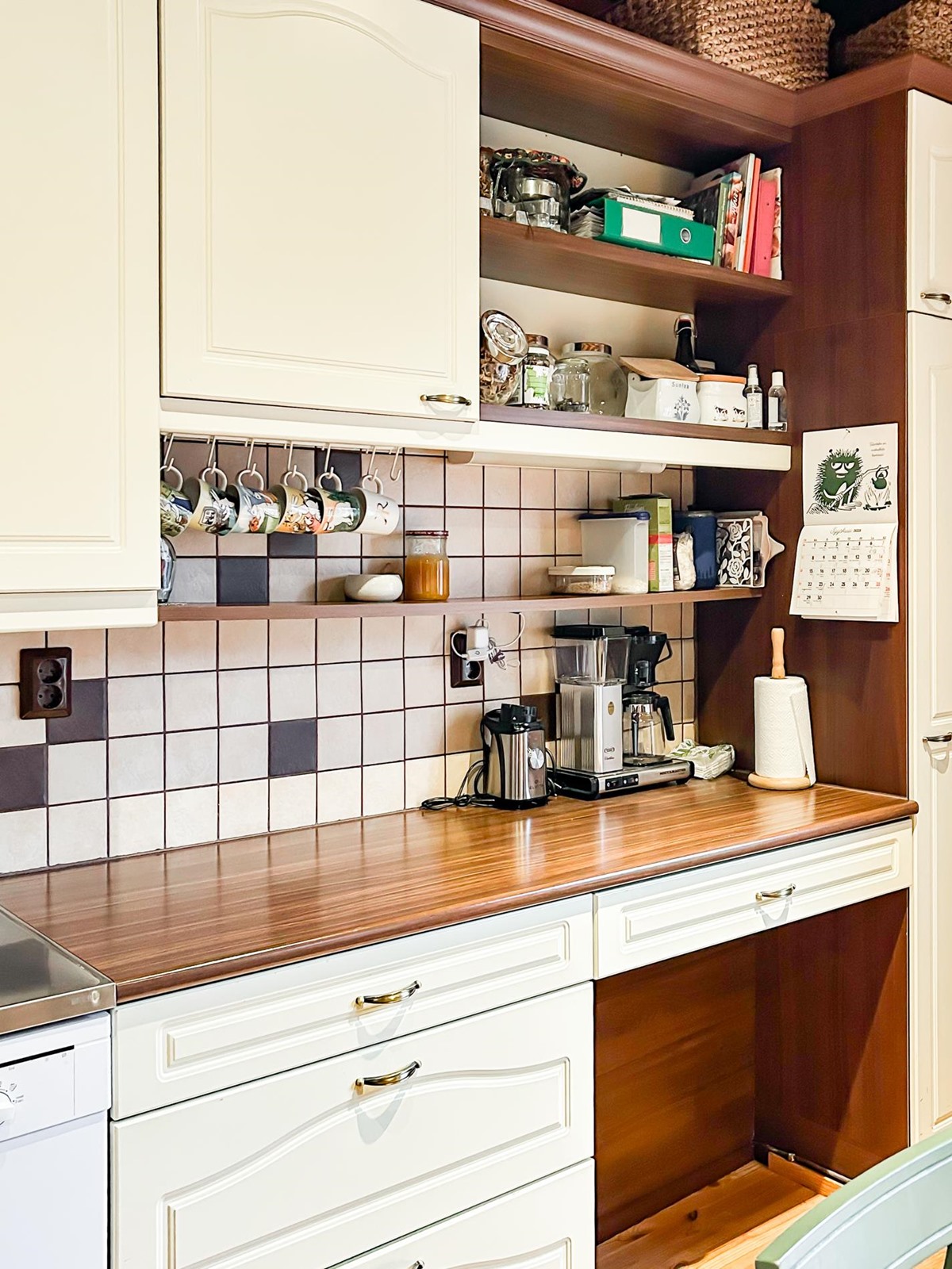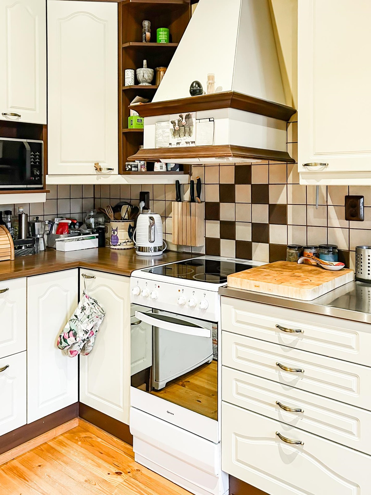 - Jääkaappi, keraaminen liesi, liesituuletin, leivinuuni, mikroaaltouuni, astianpesukone, kaapistot, kiinteät valaisimet.