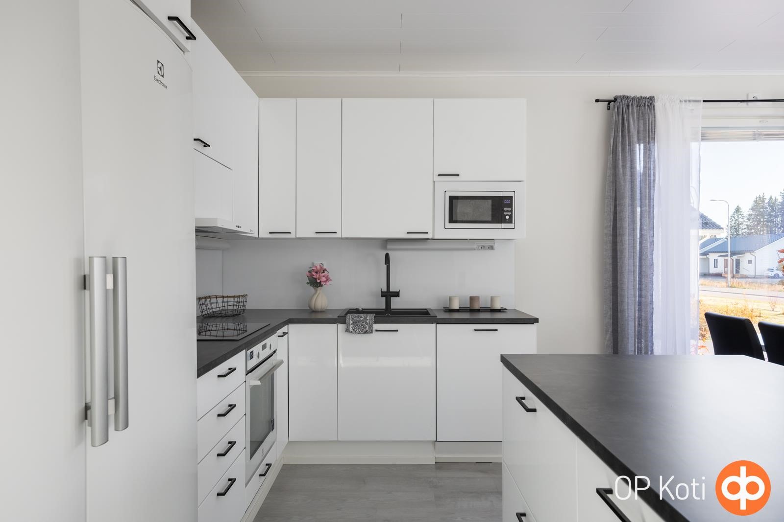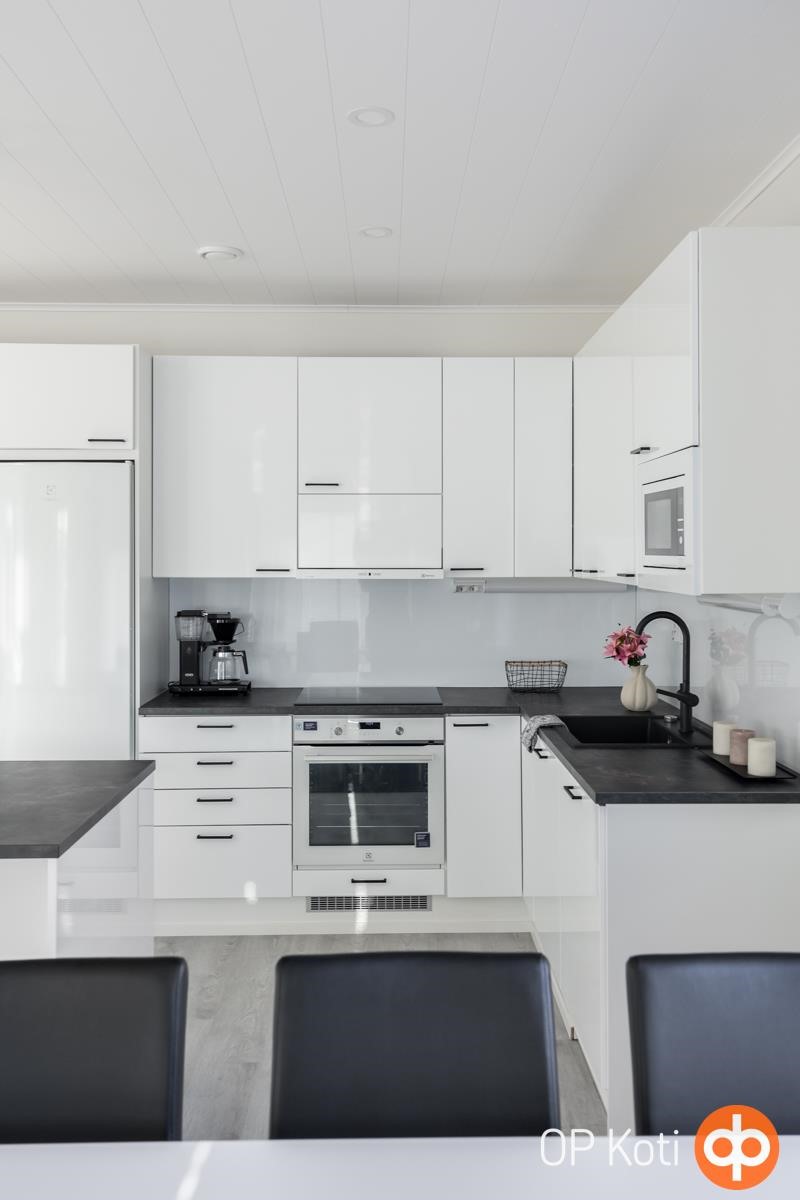 - Jääkaappi, pakastekaappi, erillisuuni, induktioliesi, liesituuletin, astianpesukone, kaapistot, kiinteät valaisimet. Pöytämateriaalit tummanharmaat laminaattitasot. Electroluxin jää- ja pakastinkaapit, induktioliesi ja valkoinen erillisuuni. Musta komposiittiallas ja musta hana.