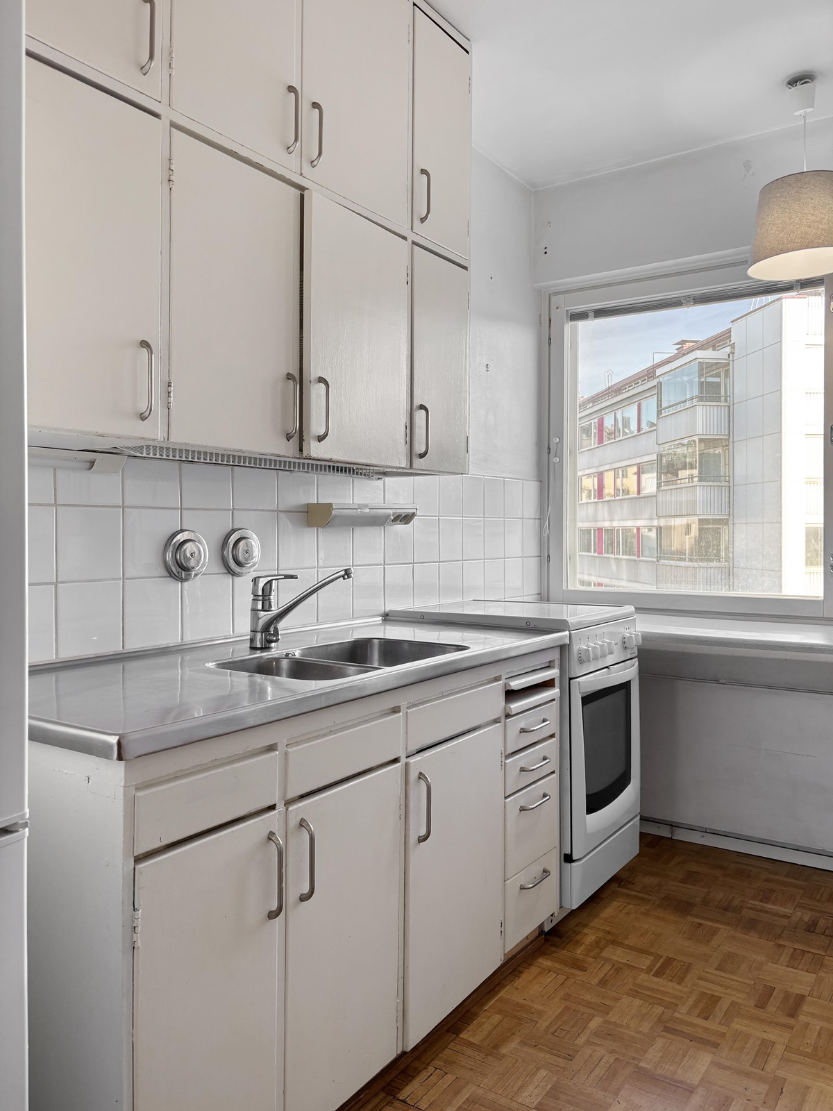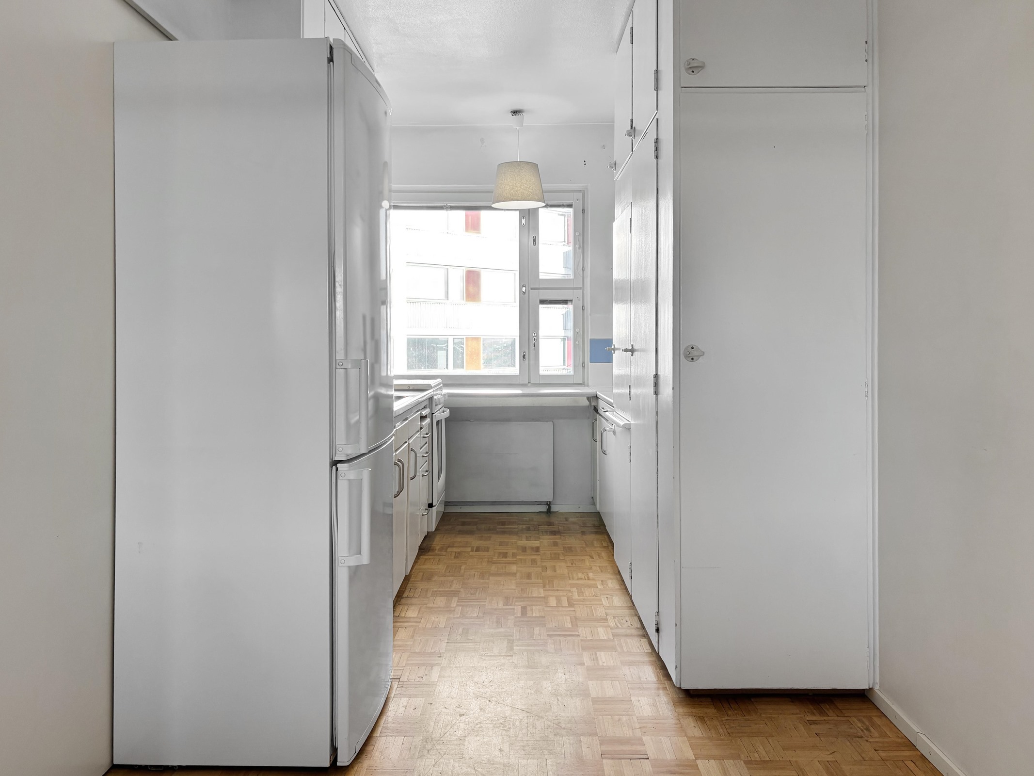 - Jääkaappipakastin, keraaminen liesi, kaapistot, kiinteät valaisimet.