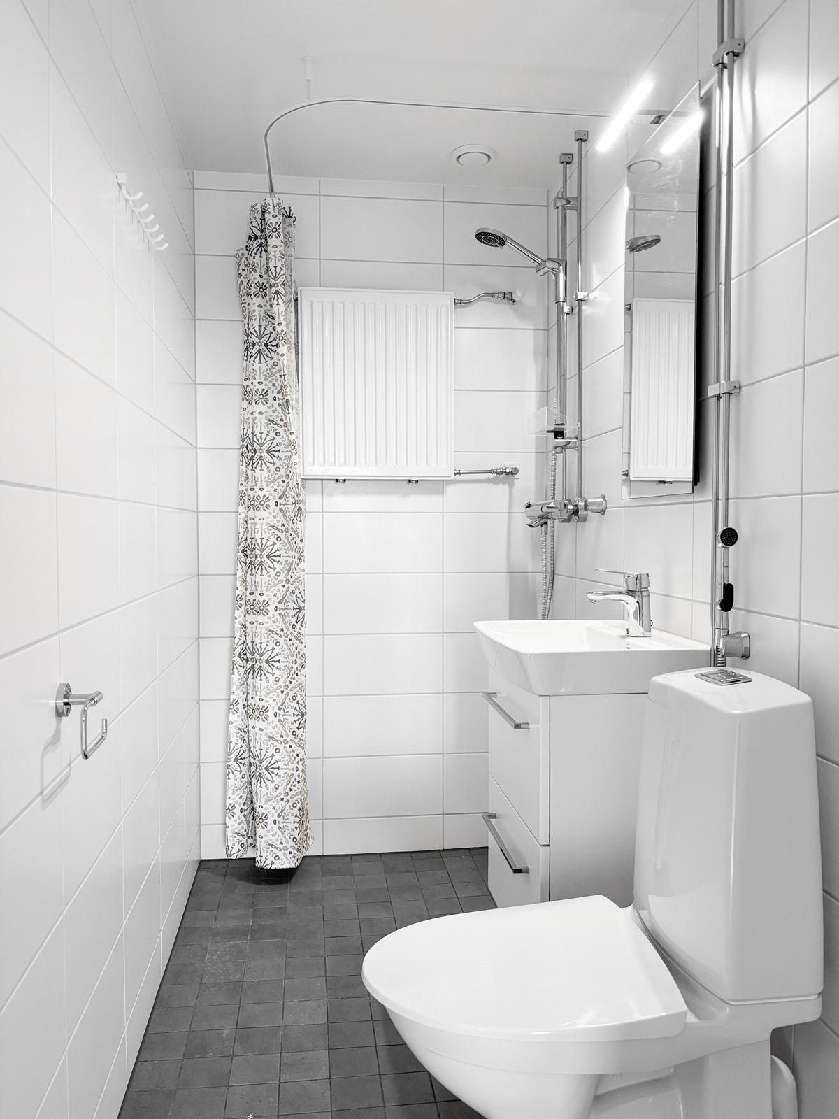 - Kylpyhuone, suihku, peilit, allaskaappi, pesukoneliitäntä, kiinteät valaisimet.
