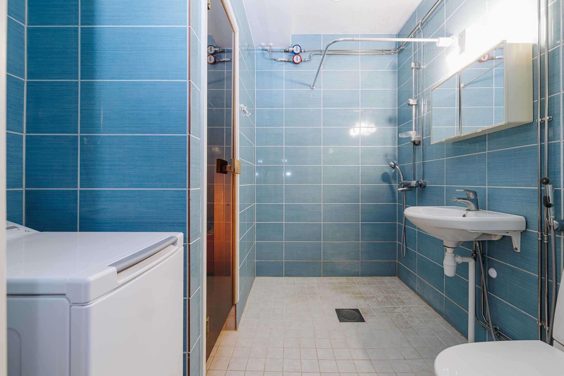 - Sauna, sähkökiuas, kylpyhuone, suihku, peilikaappi, allaskaappi, pesukoneliitäntä, kiinteät valaisimet.