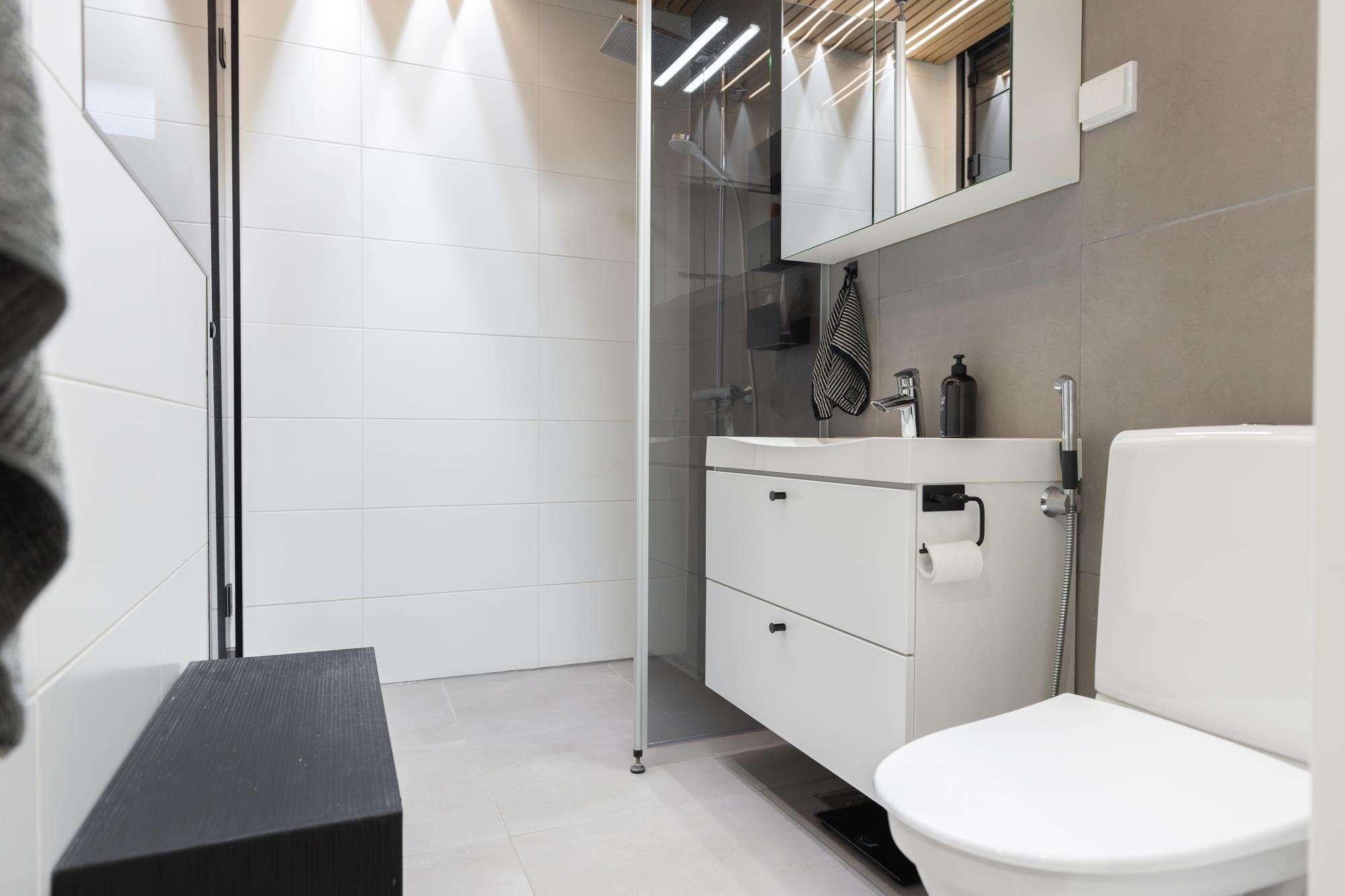 - Sauna, sähkökiuas Harvian pilarikiuas, kylpyhuone, erillinen wc, suihku, suihkuseinä, peilikaappi, allaskaappi, pesukoneliitäntä, lattialämmitys, kiinteät valaisimet.