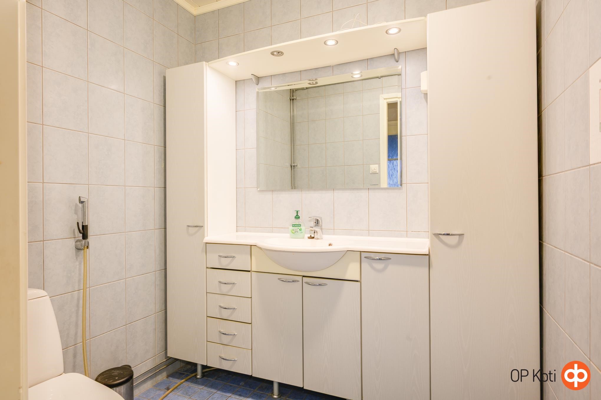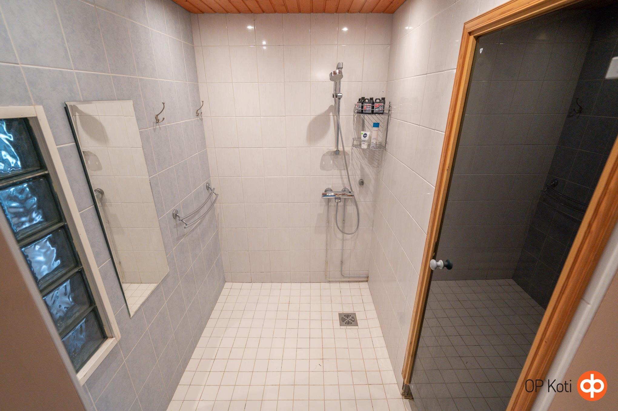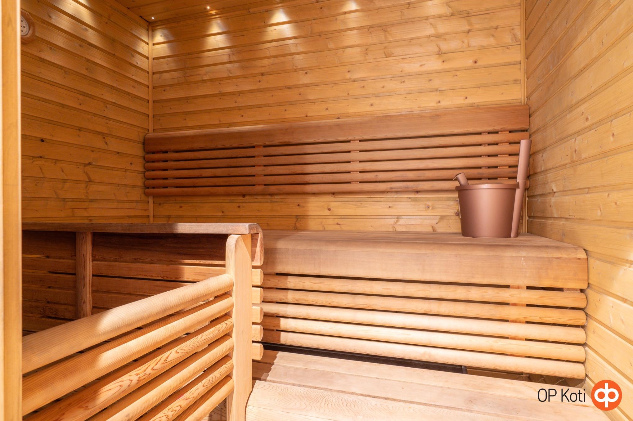 - Sauna, sähkökiuas, kylpyhuone, erillinen wc, suihku, peilit Kylpyhuone, kaapit, allaskaappi, pesukoneliitäntä, lattialämmitys, kiinteät valaisimet.