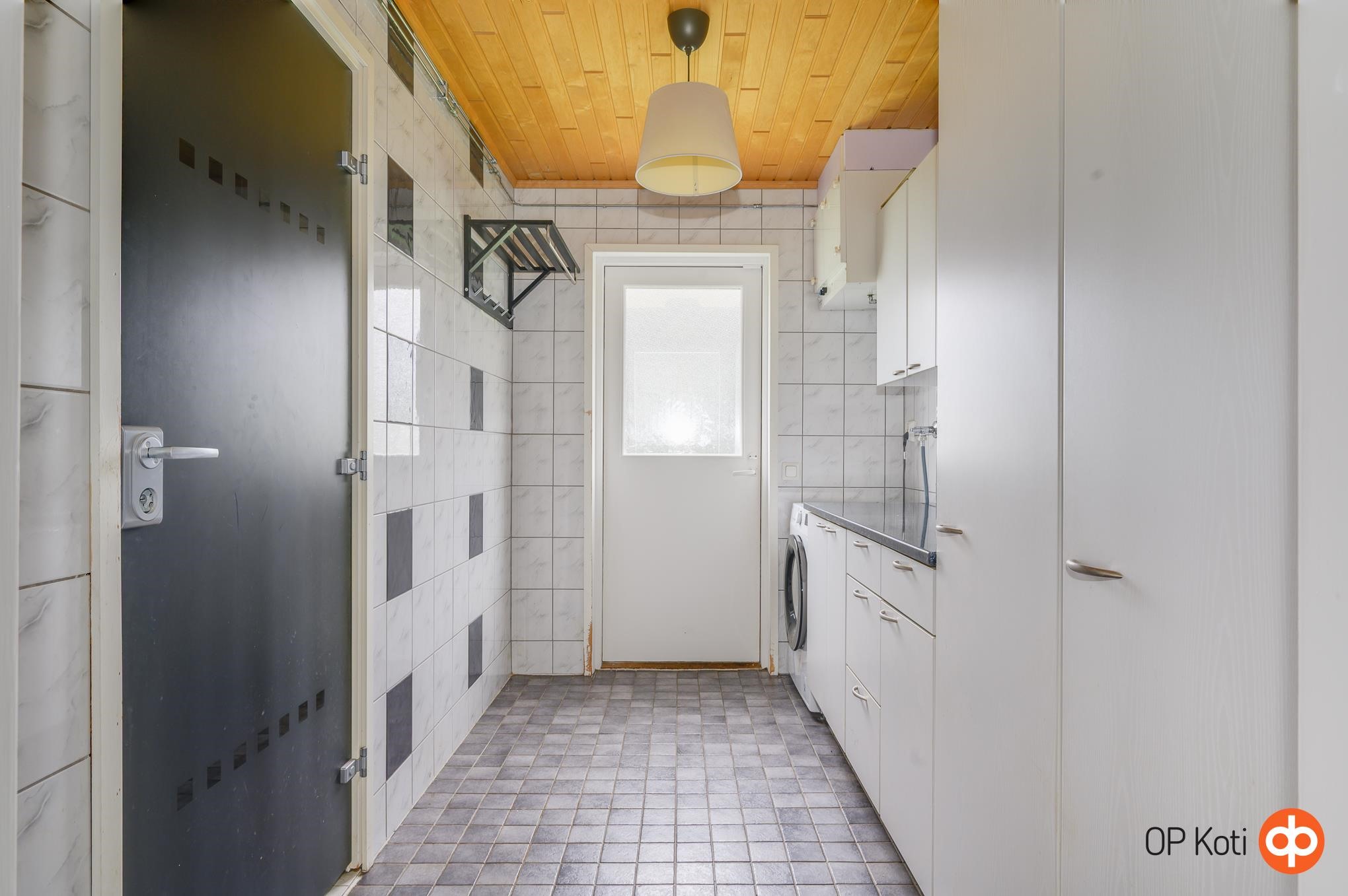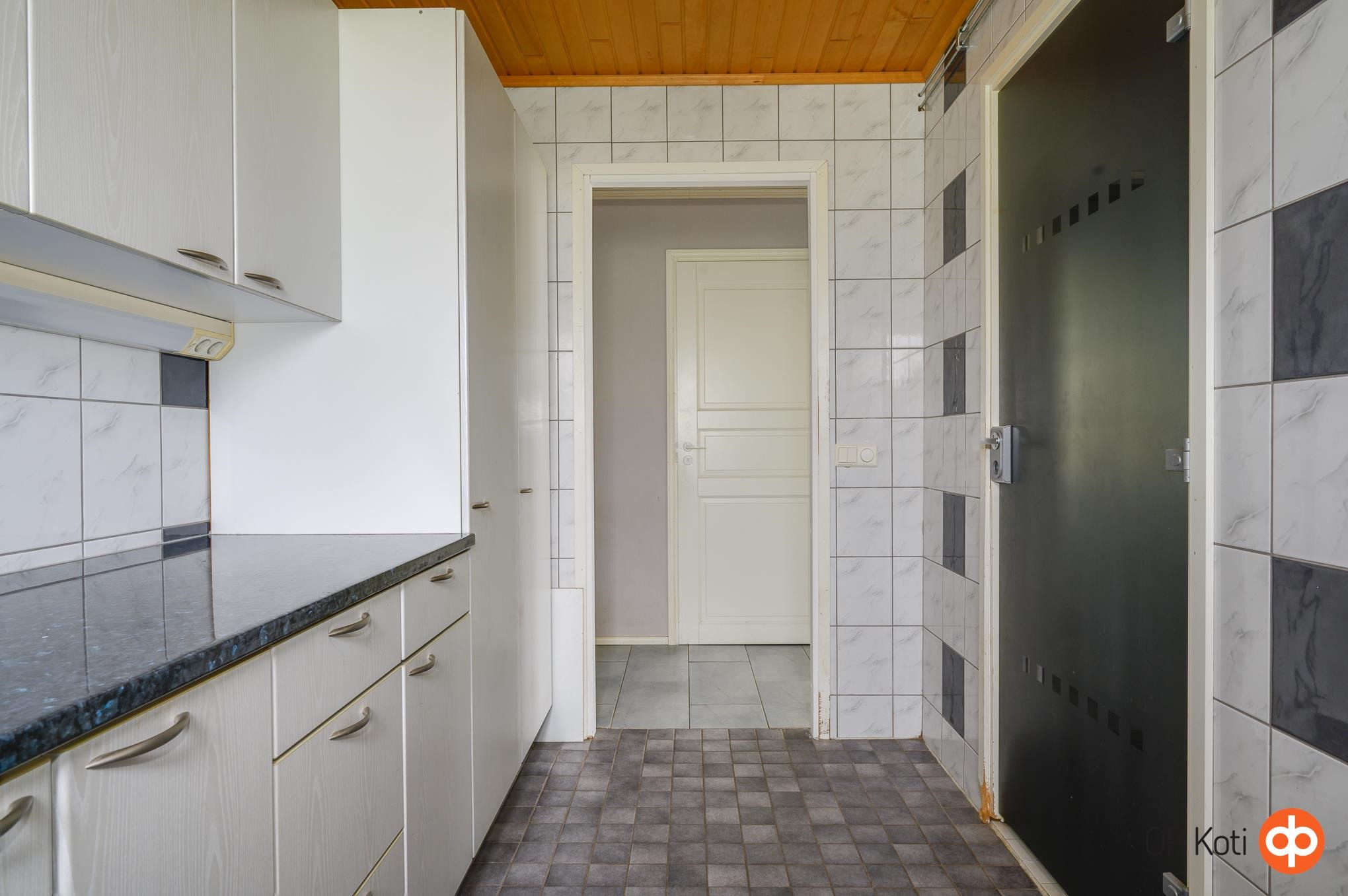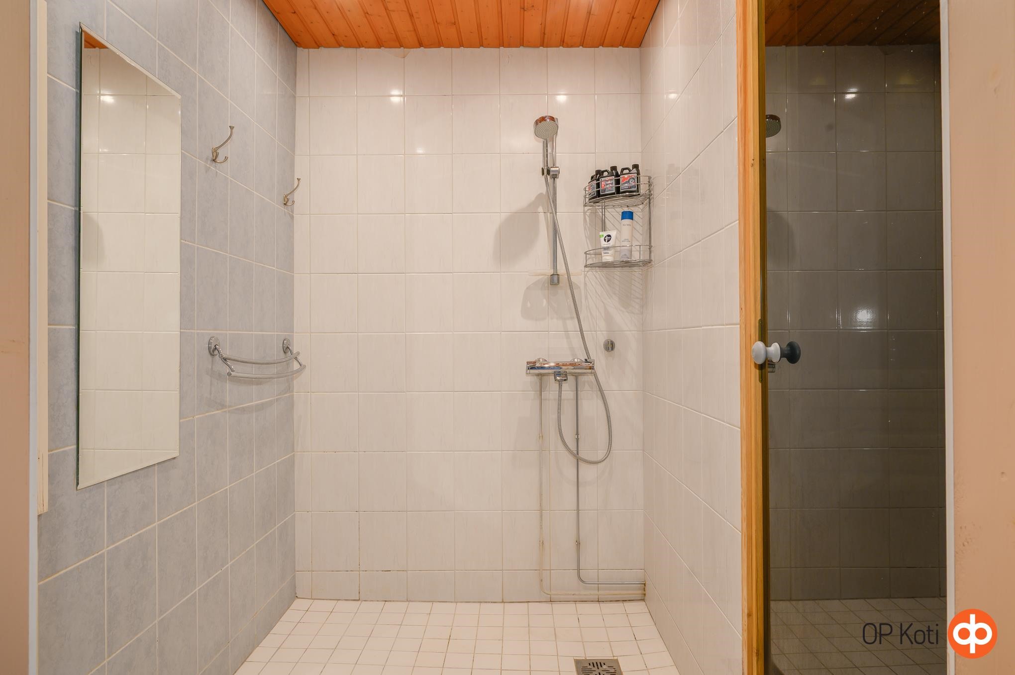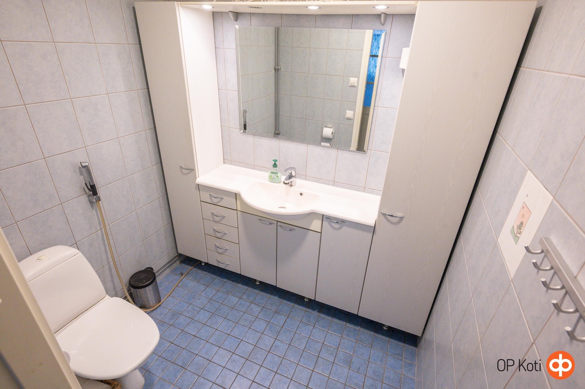- Sauna, sähkökiuas, kylpyhuone, erillinen wc, suihku, peilit Kylpyhuone, kaapit, allaskaappi, pesukoneliitäntä, lattialämmitys, kiinteät valaisimet.