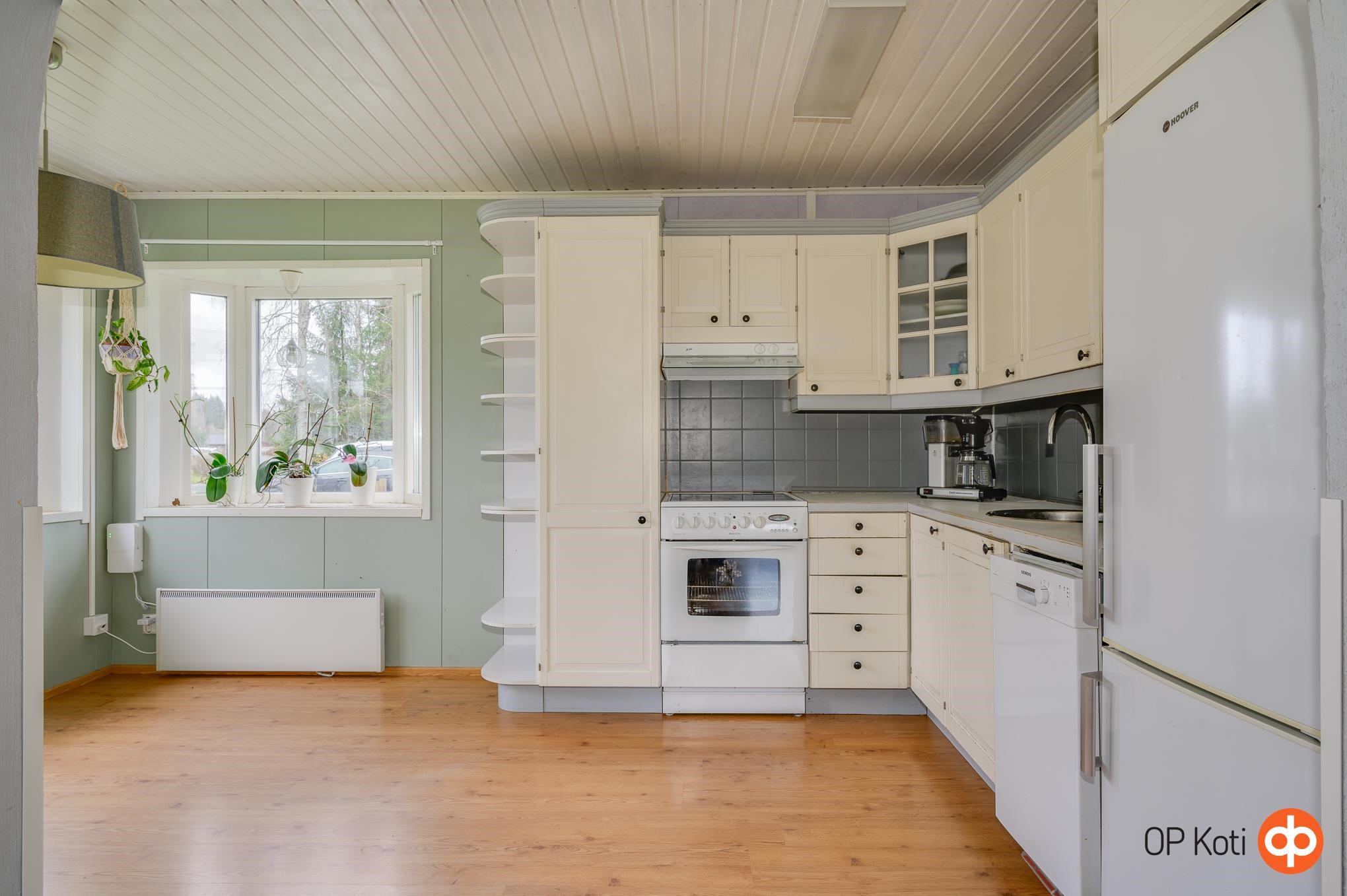 - Jääkaappipakastin, lattialiesi, keraaminen liesi, liesituuletin, astianpesukone, kaapistot, kiinteät valaisimet.
