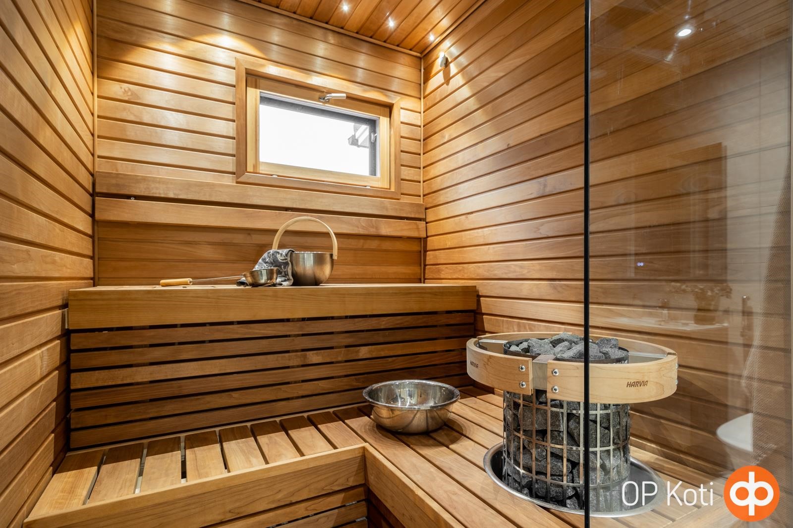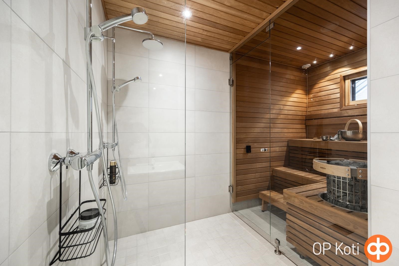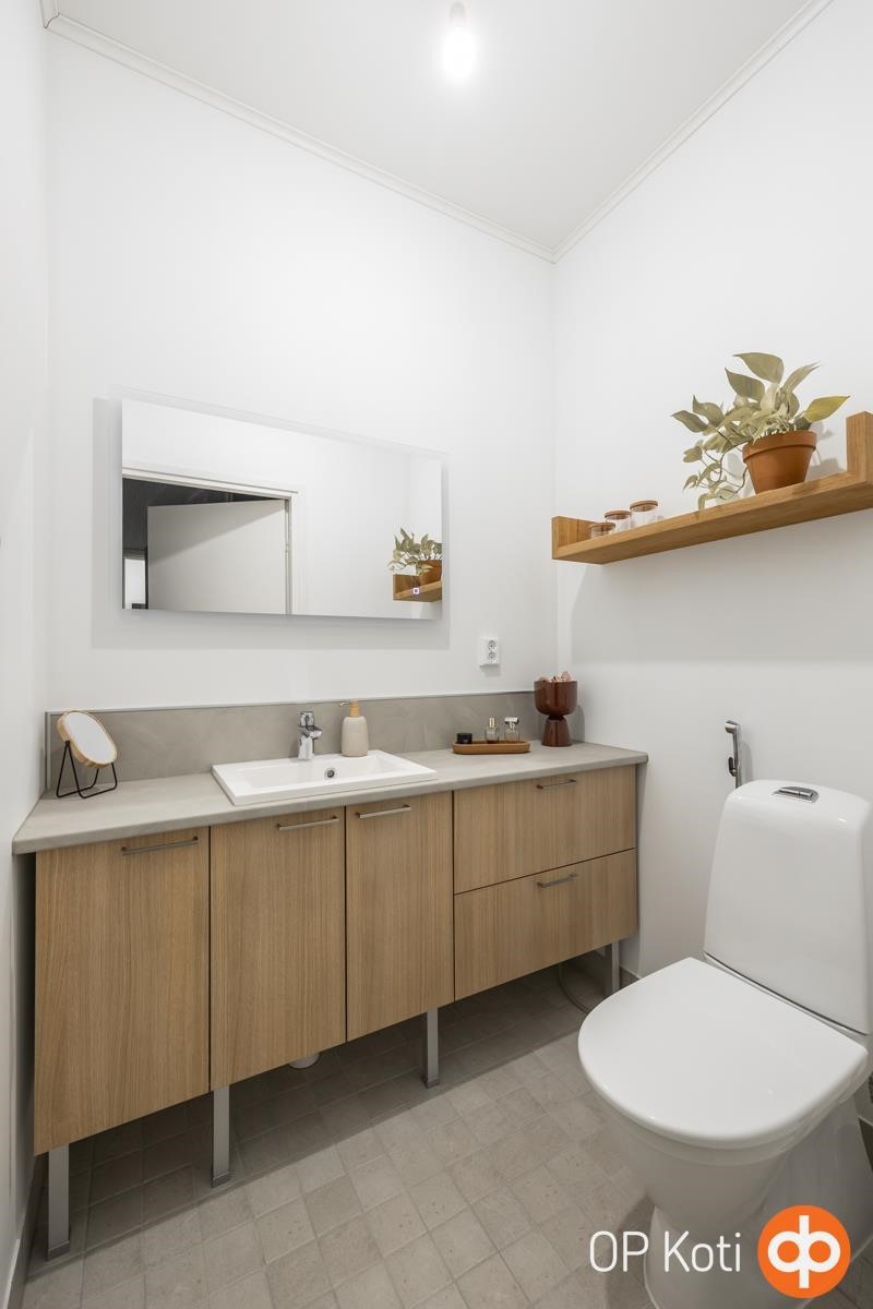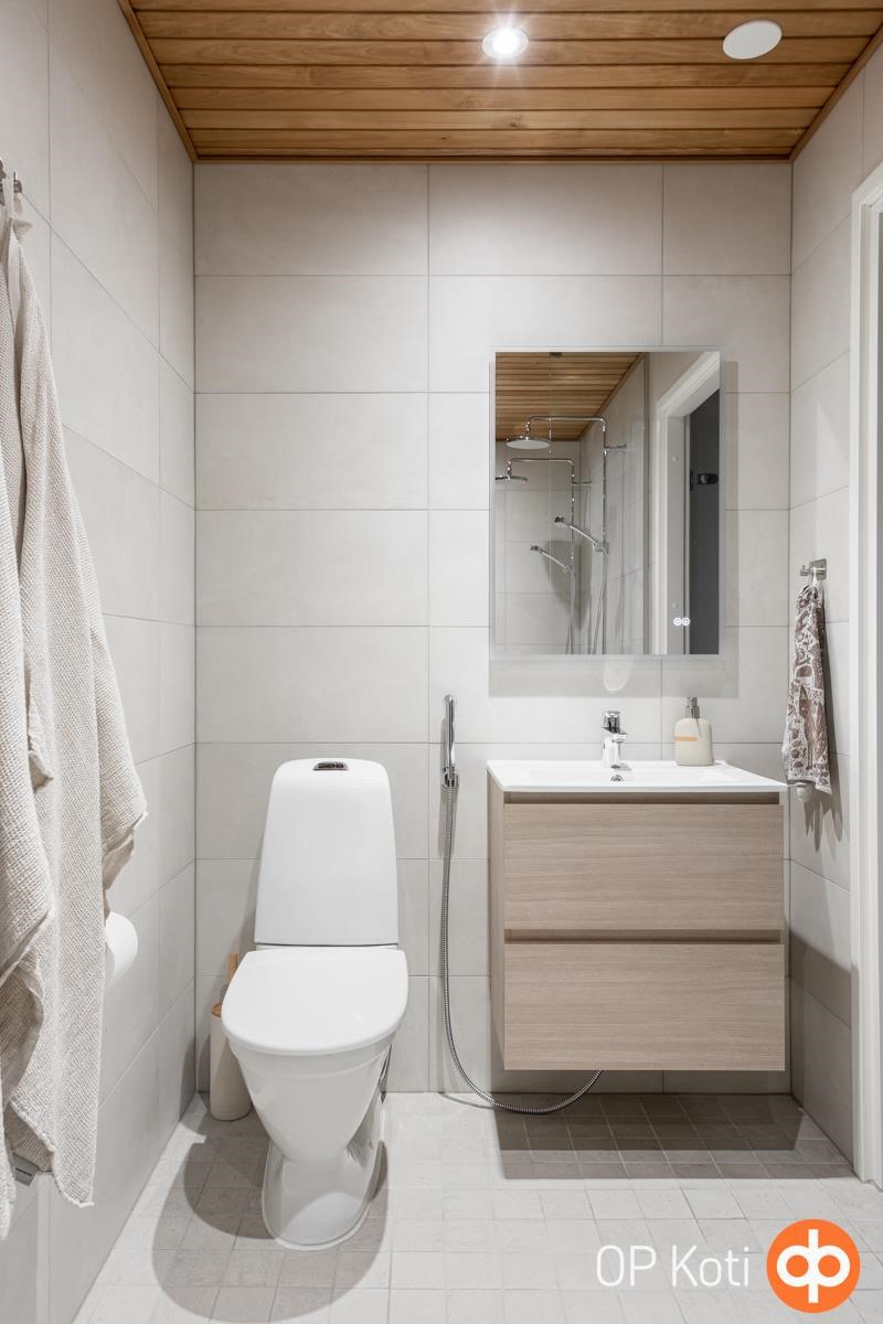 - Sauna, sähkökiuas, kylpyhuone, erillinen wc, suihku, peilit, kaapit, allaskaappi, pesukoneliitäntä, lattialämmitys, kiinteät valaisimet.