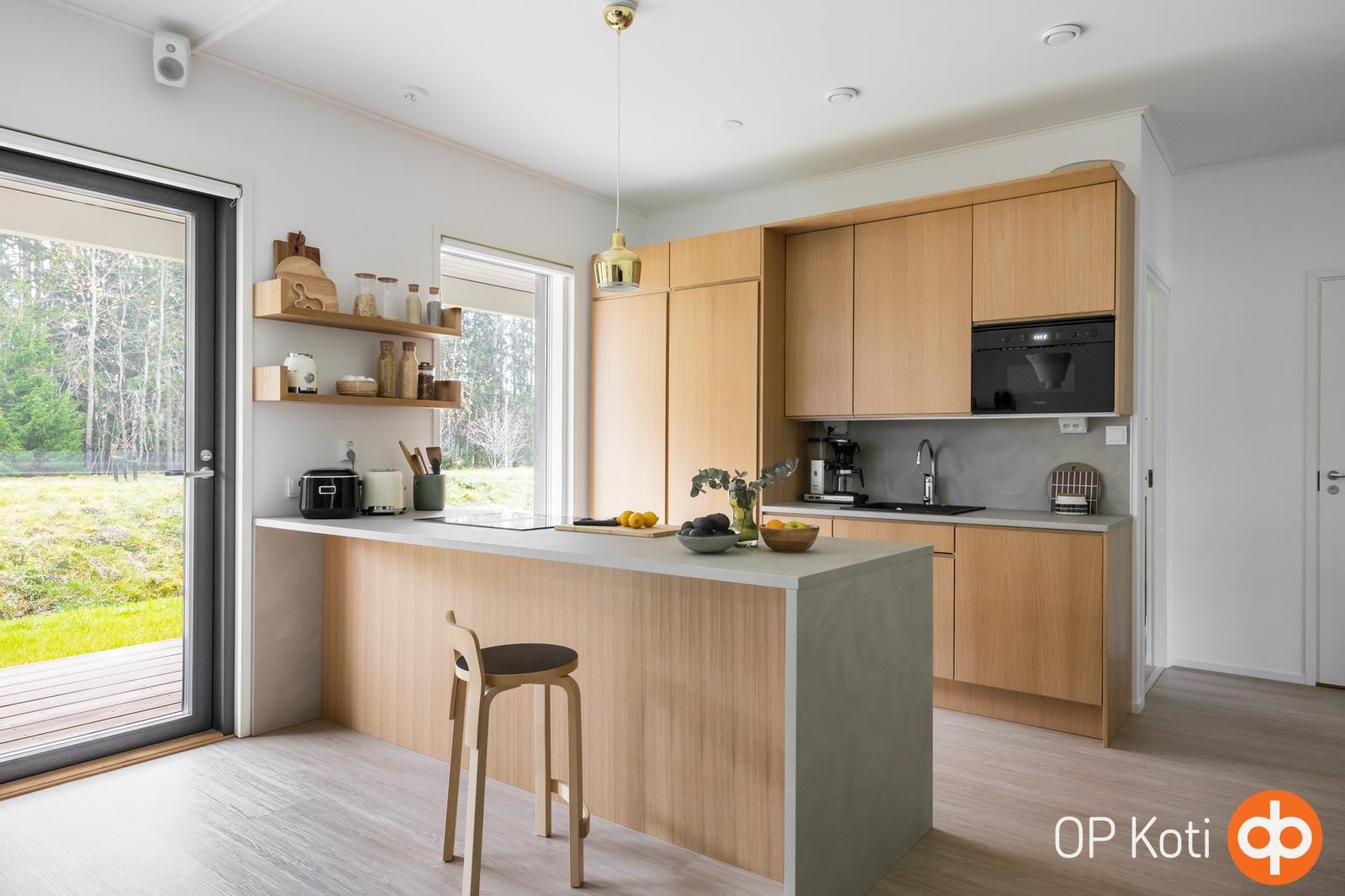 - Jääkaappi, pakastekaappi, erillisuuni, induktioliesi, liesituuletin, mikroaaltouuni Integroitu, astianpesukone Integroitu, kaapistot, viinikaappi, kiinteät valaisimet.