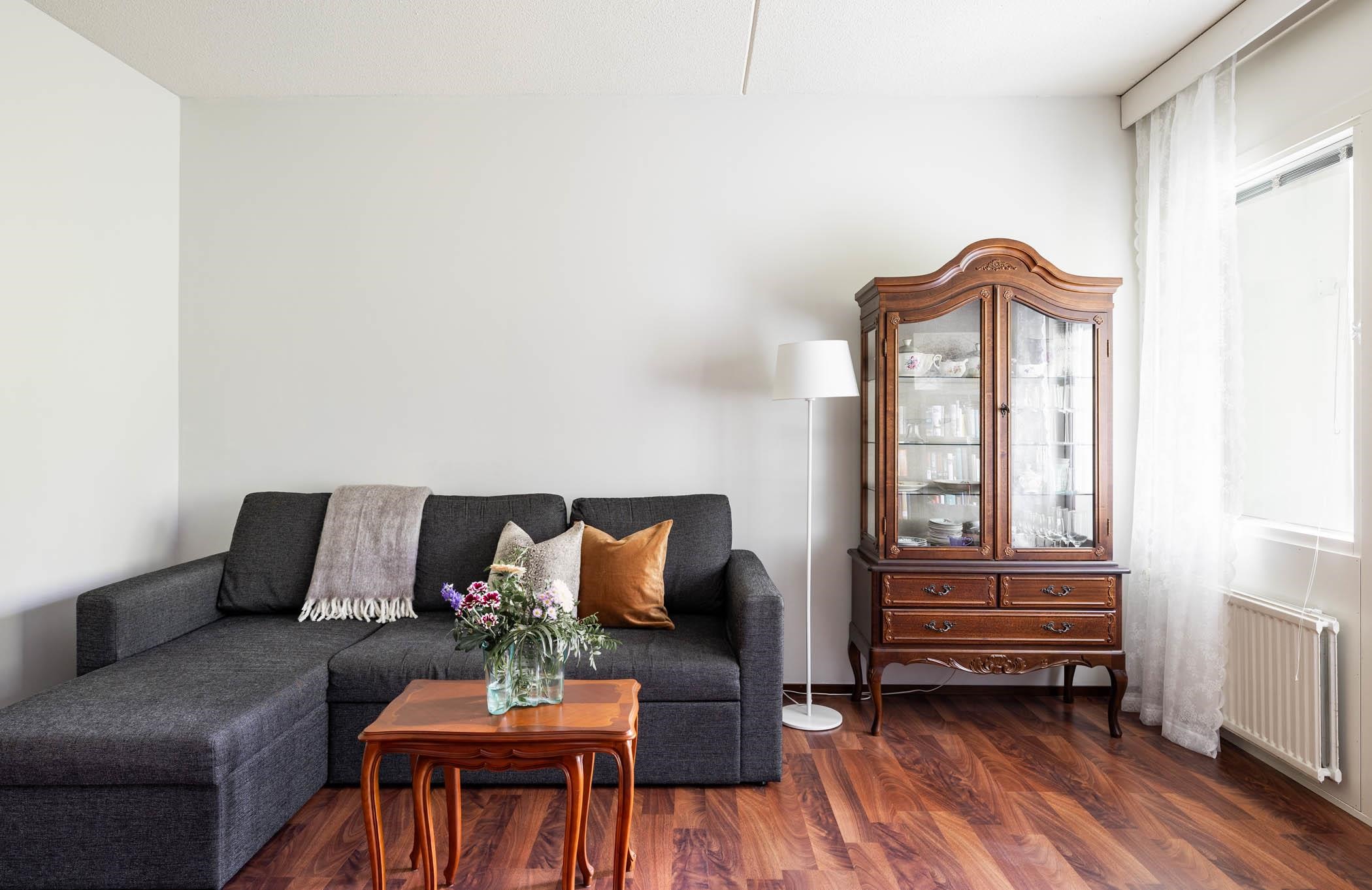 - Keittiö: Maalatut seinät / laminaattilattia. Olohuone: Seinät tapetoitu/maalattu / laminaattilattia. Kylpyhuone: Laatta/laatta. Eteinen: Maalatut seinät / laminaattilattia. Vaatehuone: Maalatut seinät / laminaattilattia.