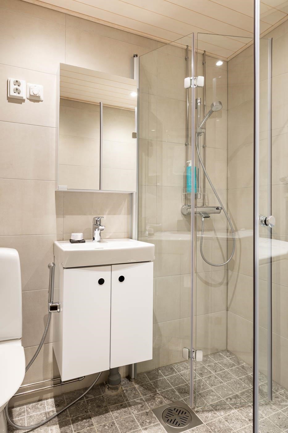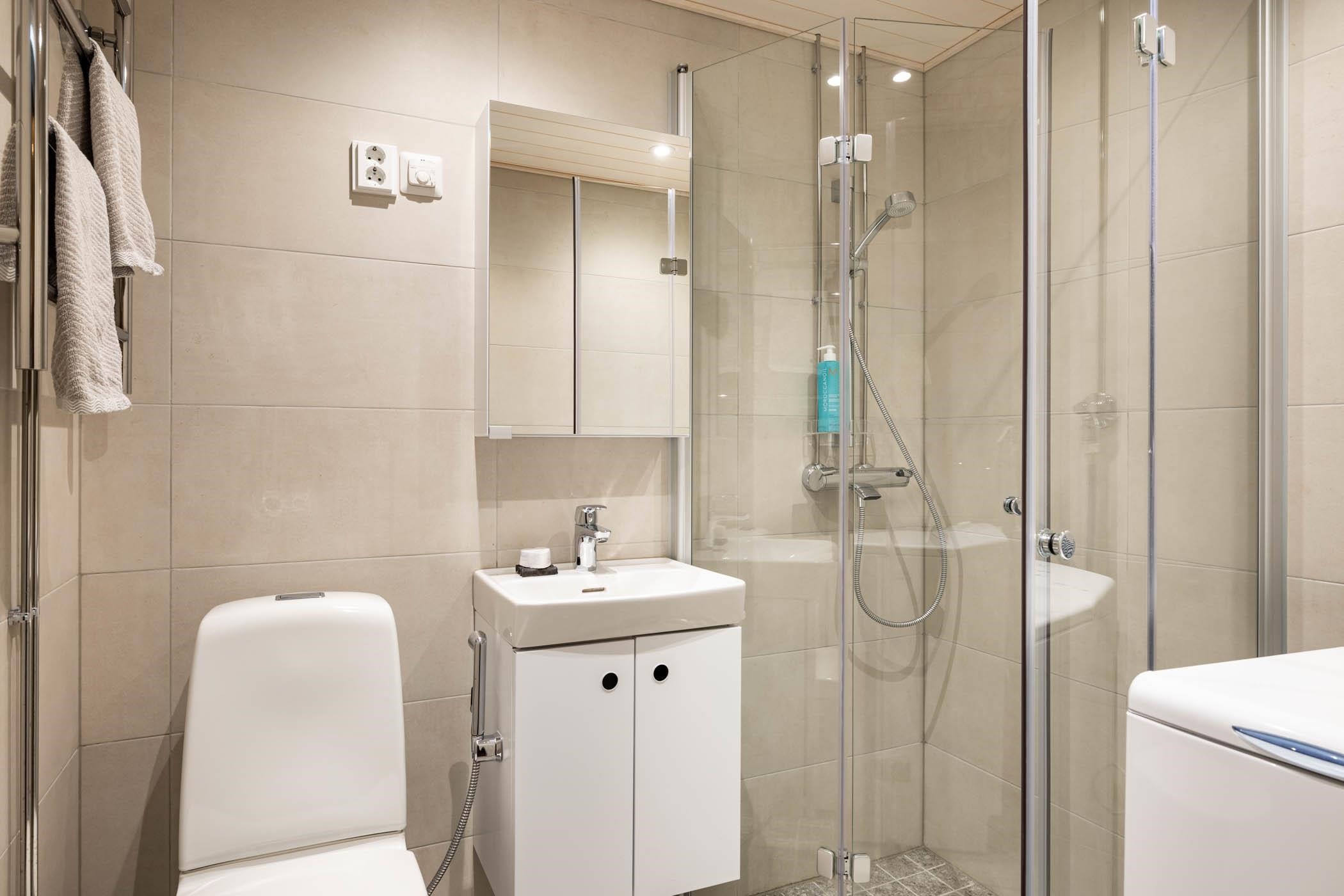- Kylpyhuoneessa on suihku, suihkuseinä (taittuvat lasiset 2 kpl), peilikaappi, allaskaappi, pesukoneliitäntä, lattialämmitys ja kiinteät valaisimet.