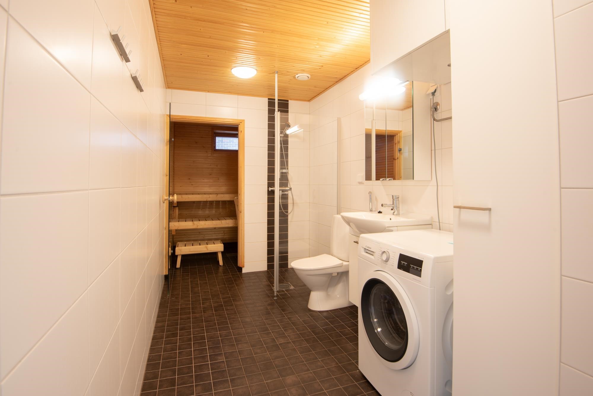 - Sauna, sähkökiuas, kylpyhuone, suihku, suihkuseinä, peilikaappi, allaskaappi, pesukoneliitäntä, lattialämmitys.