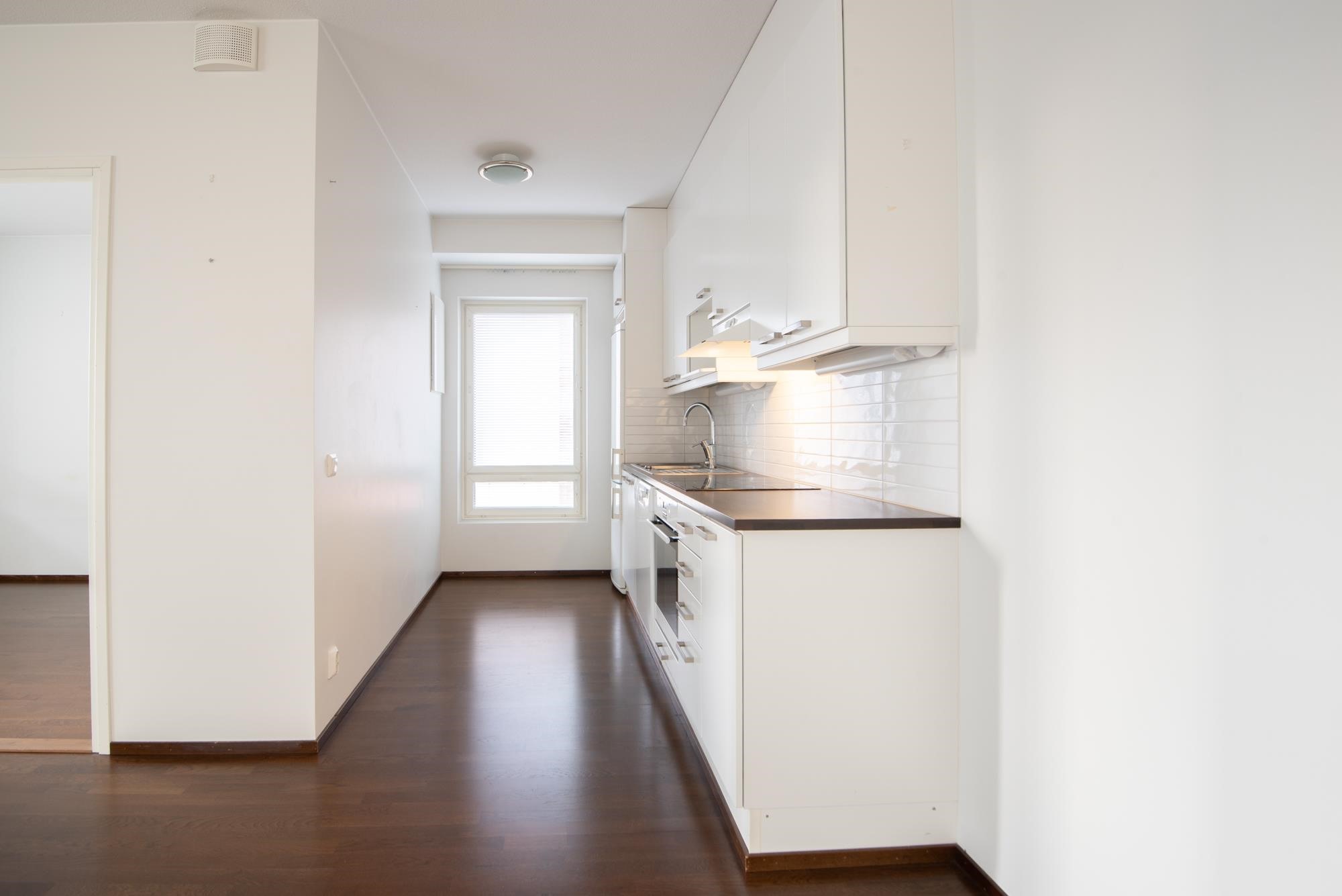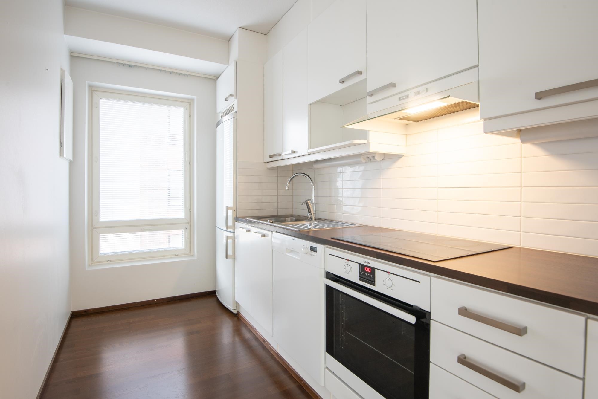 - Jääkaappipakastin, lattialiesi, liesituuletin, astianpesukone, kaapistot.