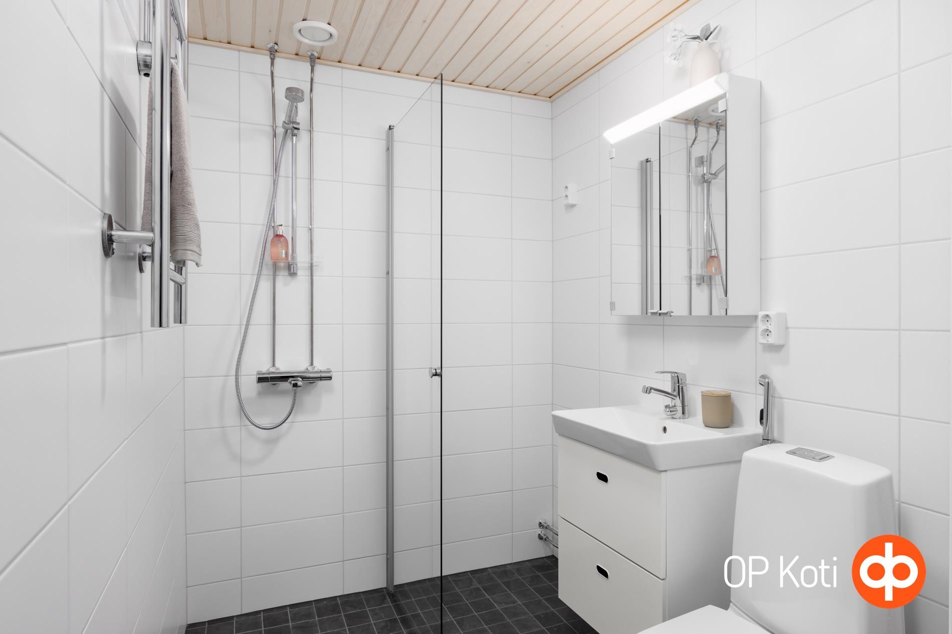 - Kylpyhuone, suihku, suihkuseinä, peilit, peilikaappi, allaskaappi, pesukoneliitäntä, lattialämmitys, kiinteät valaisimet. Pyykekuivain vesikiertoinen . Kylpyhuone remontoitu LVI remontin yhteydessä, joka on juuri valmistunut 09/2025.