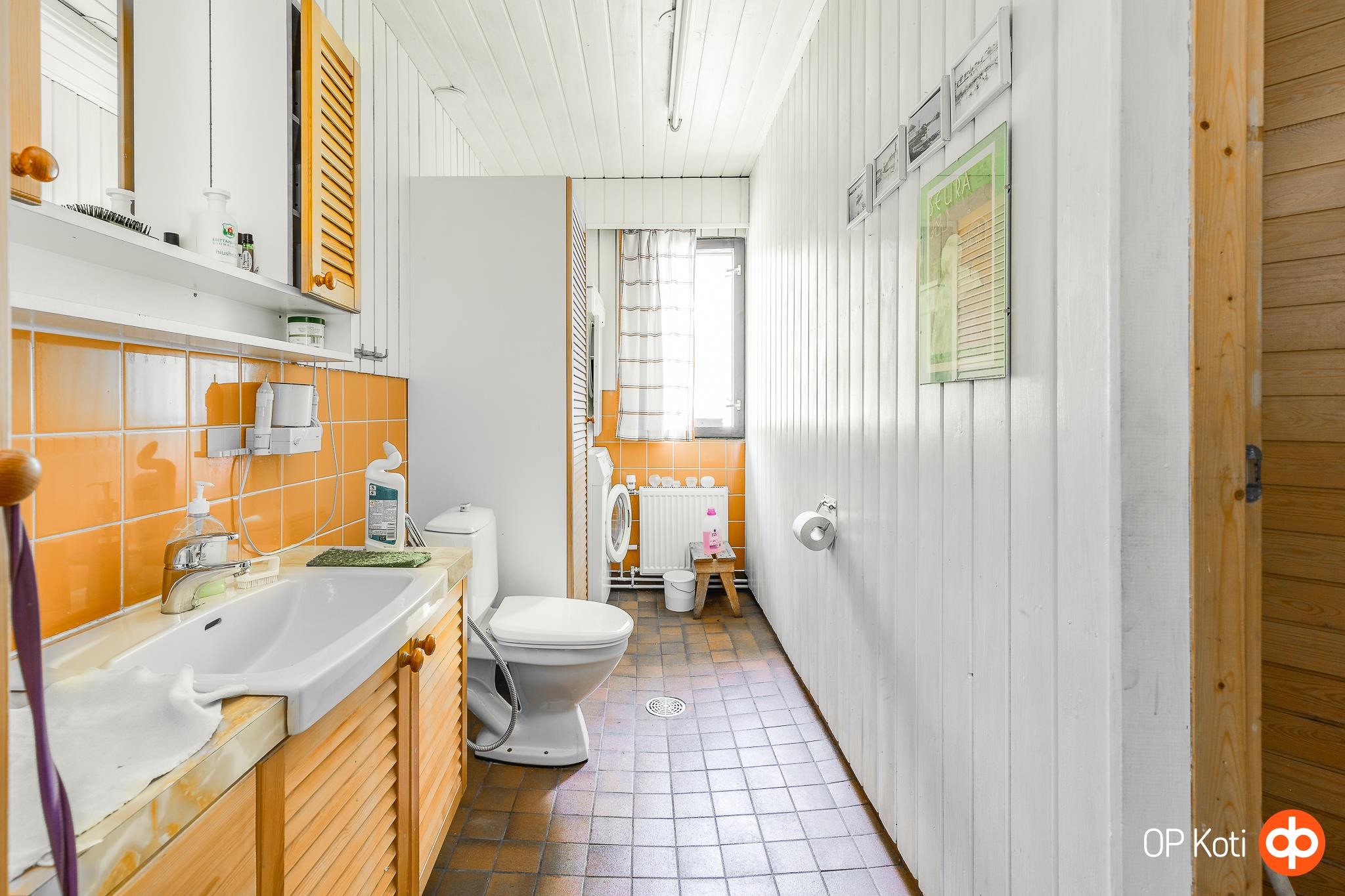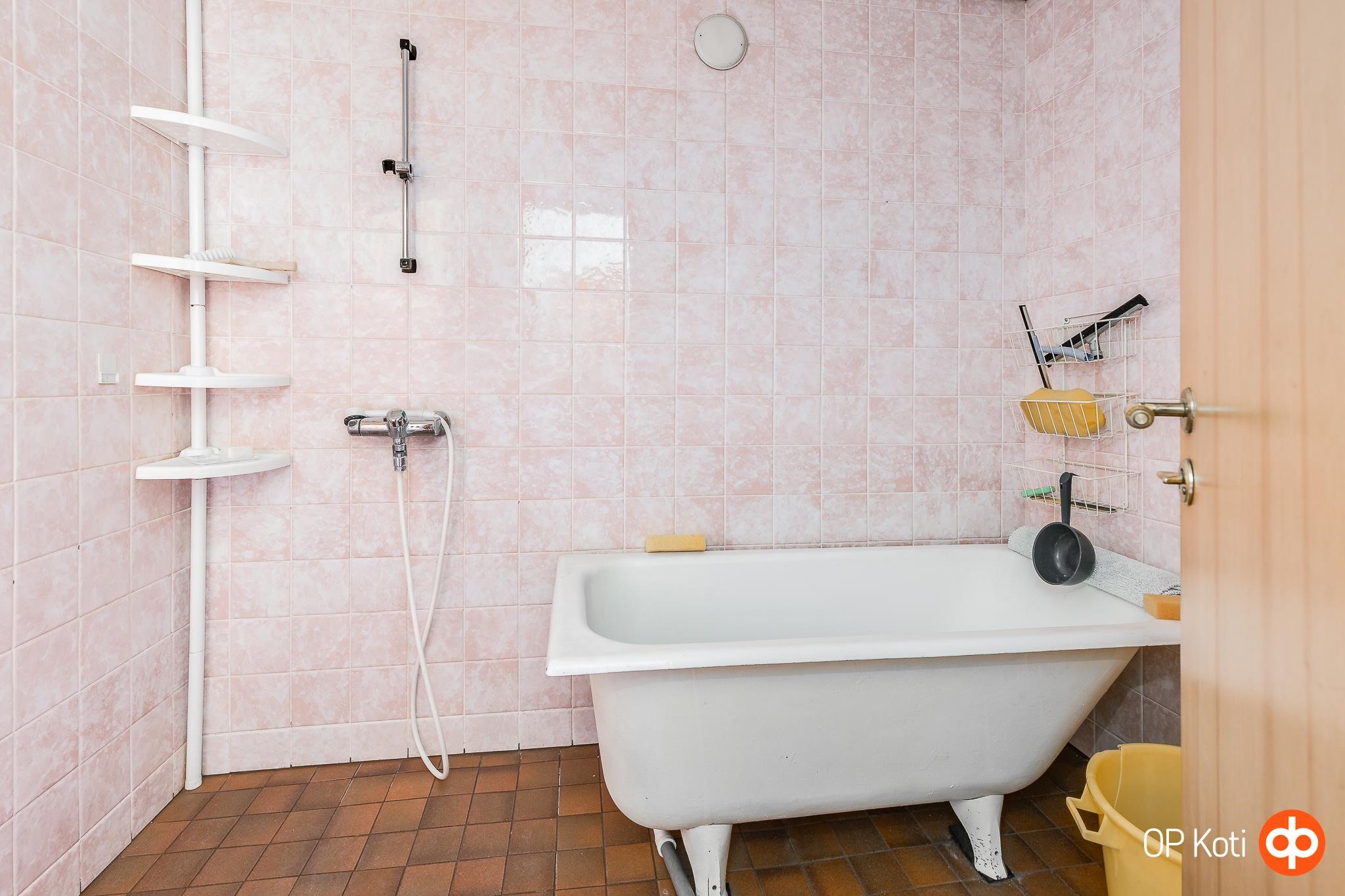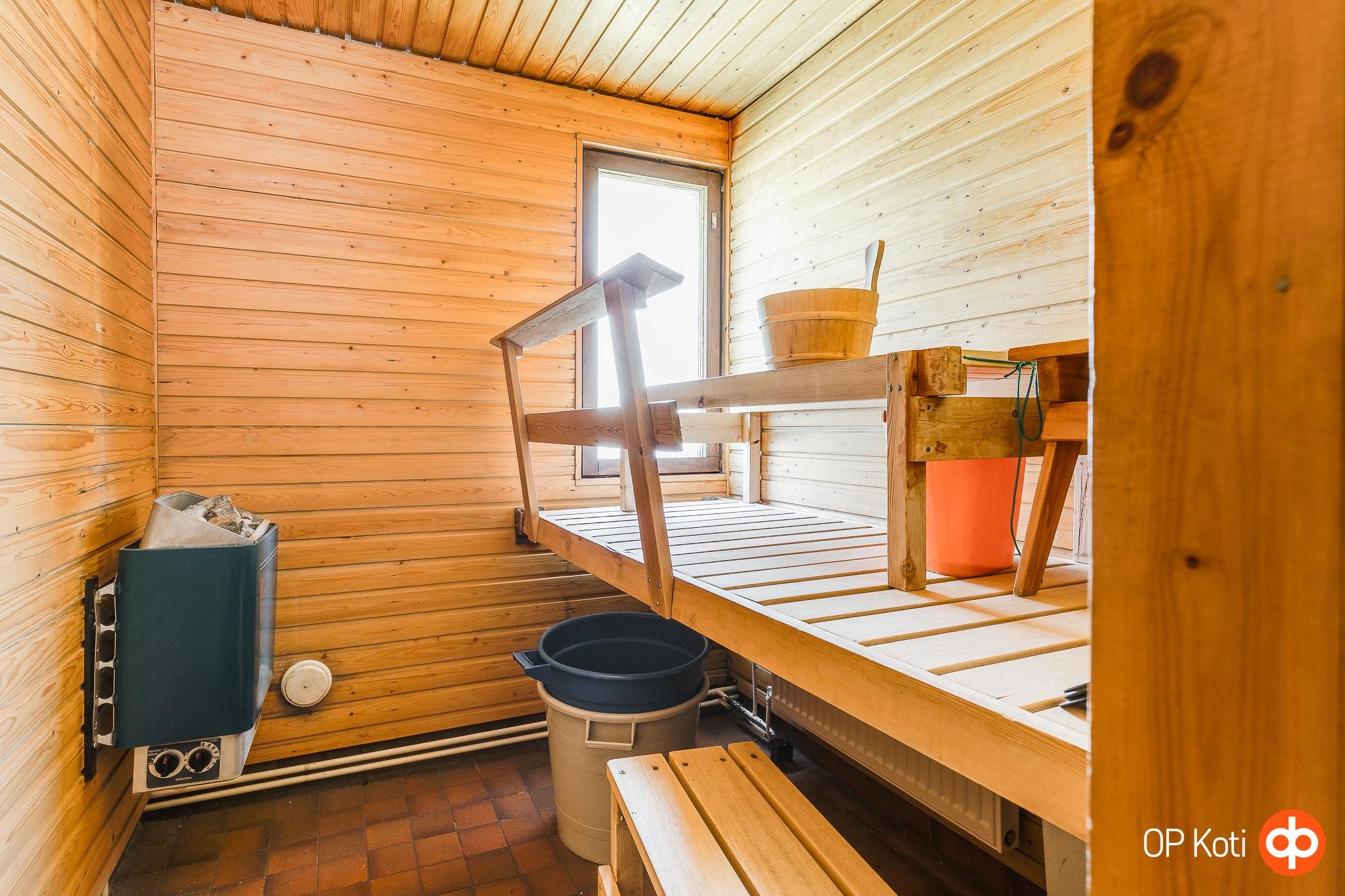- Sauna, sähkökiuas, kylpyhuone, erillinen wc, suihku, amme, peilit, peilikaappi, allaskaappi, pesukoneliitäntä, kiinteät valaisimet. teknisen käyttöiän päässä