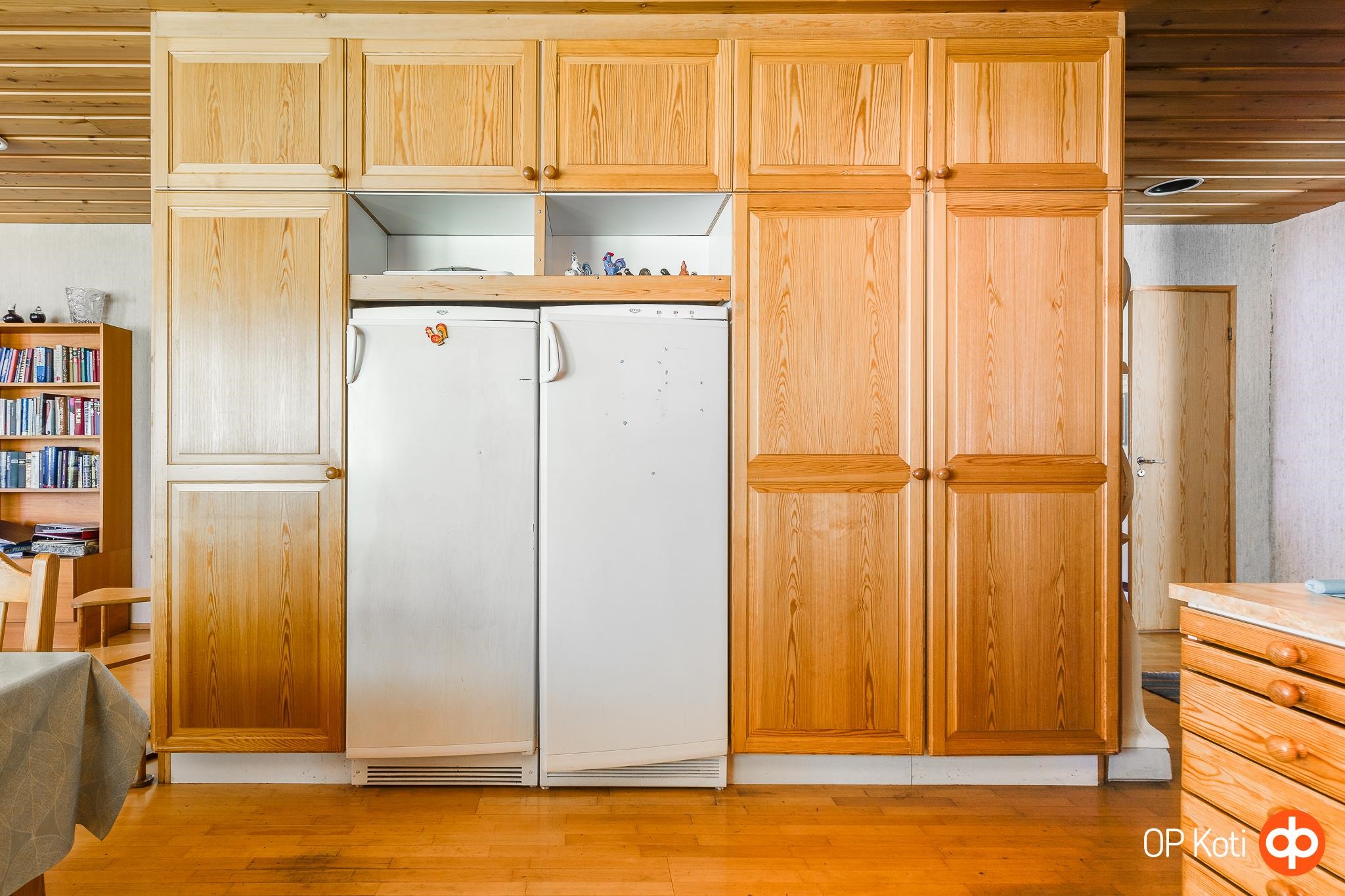 - Jääkaappi, pakastekaappi, lattialiesi, liesituuletin, leivinuuni, astianpesukone, kaapistot, kiinteät valaisimet. Täyspuiset keittiökaapit