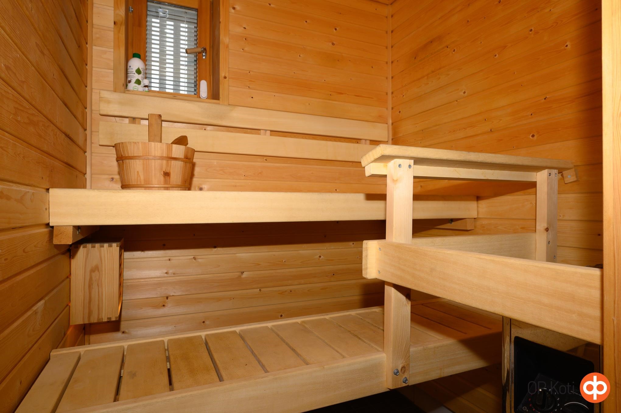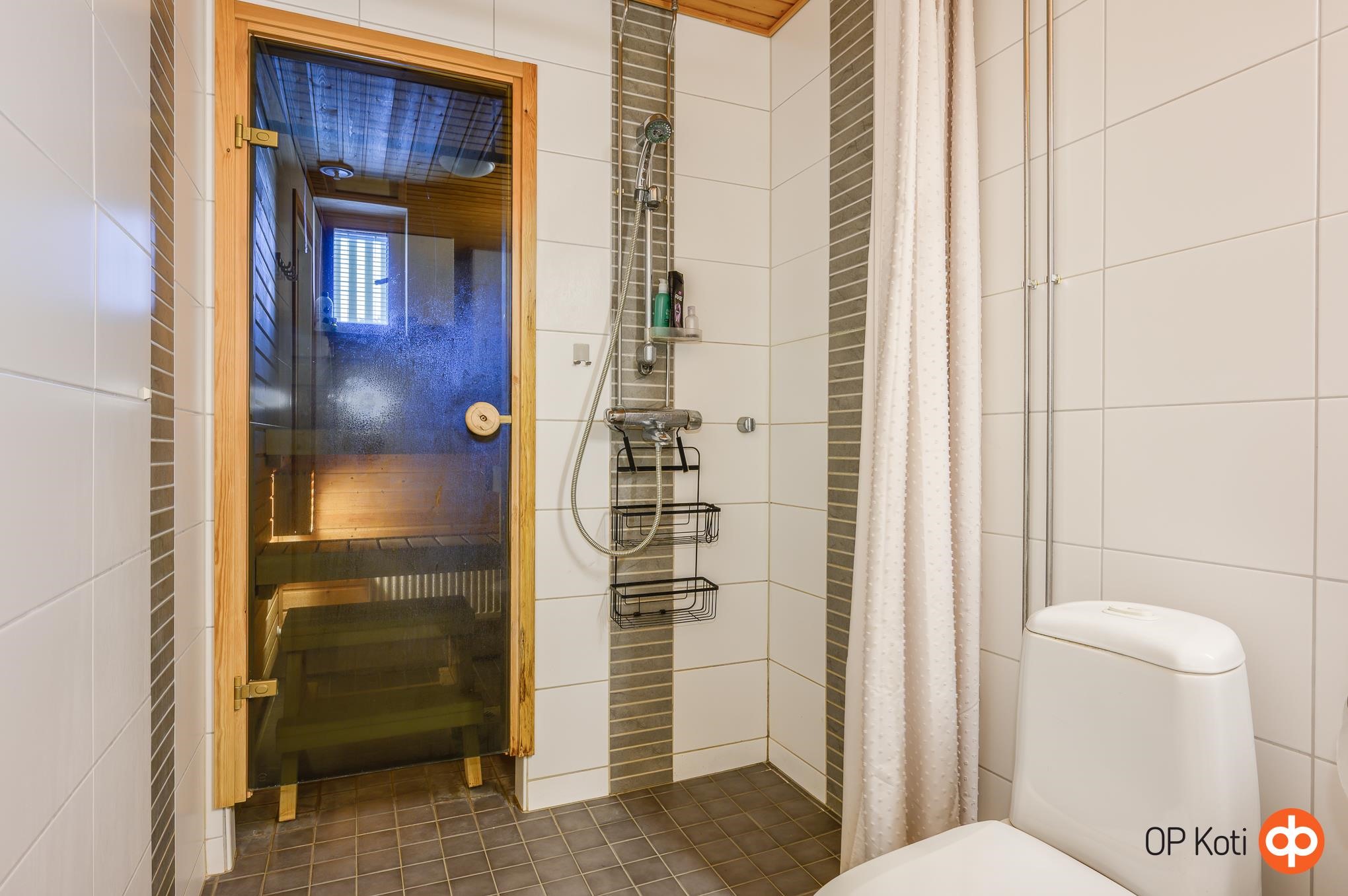 - Sauna, sähkökiuas, kylpyhuone, peilikaappi, allaskaappi, pesukoneliitäntä, lattialämmitys, kiinteät valaisimet.
