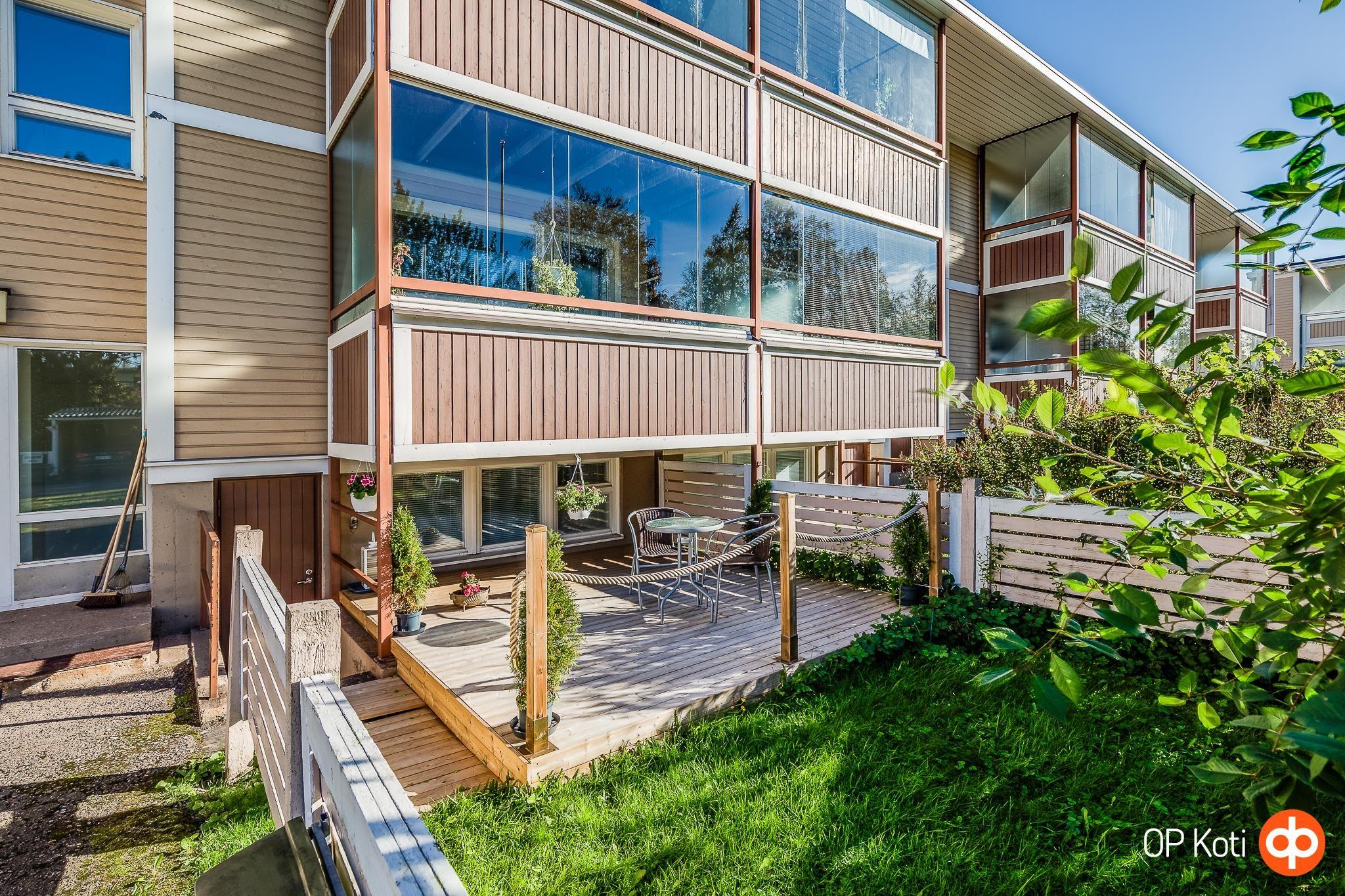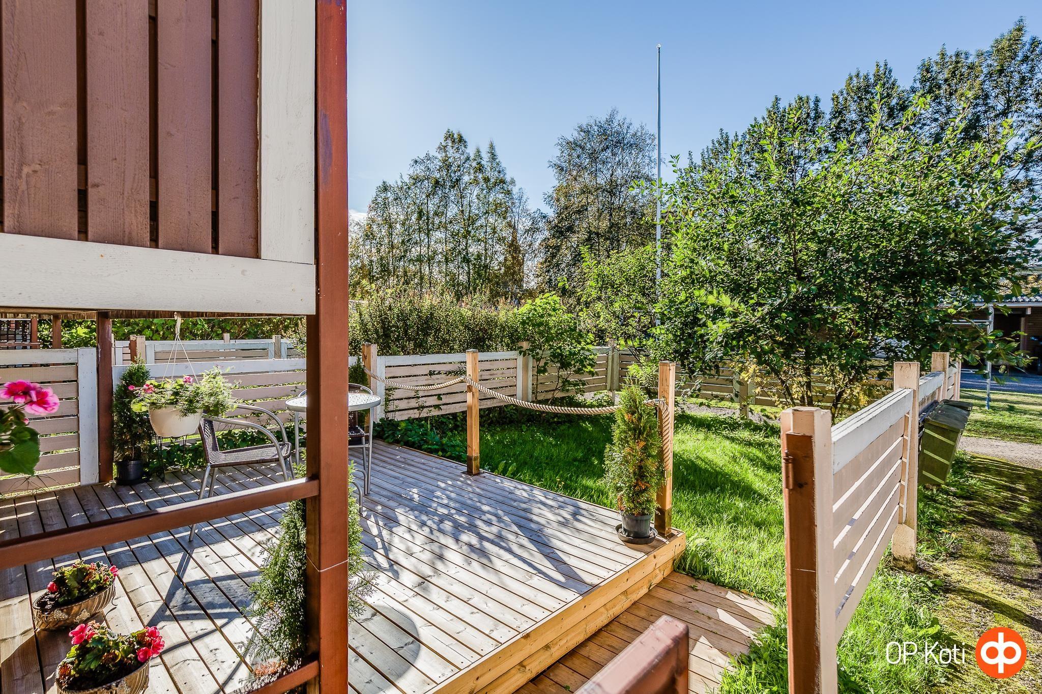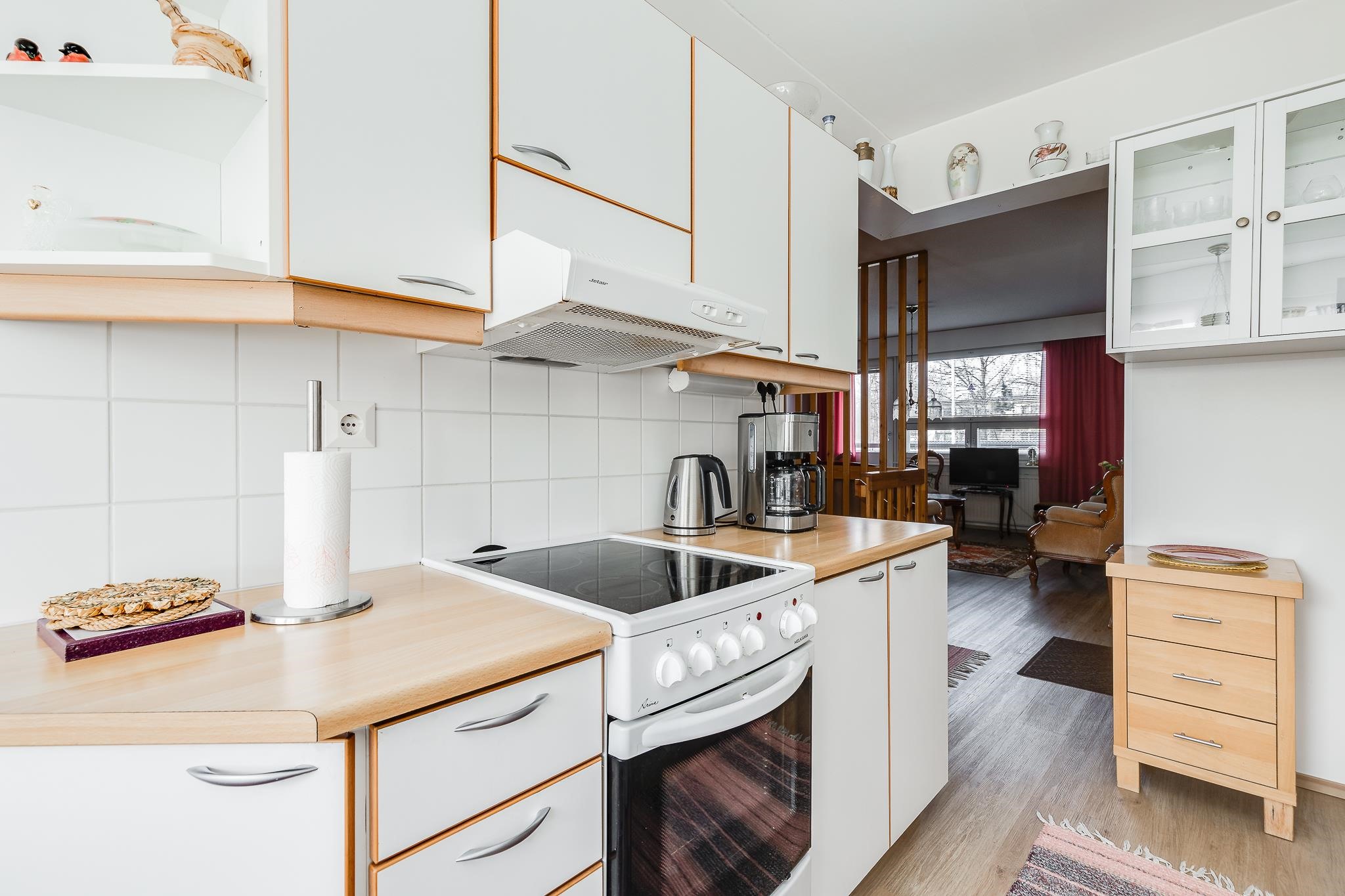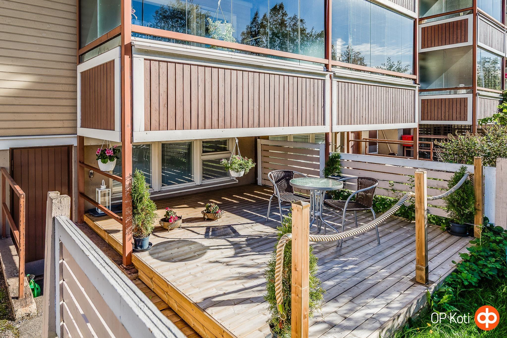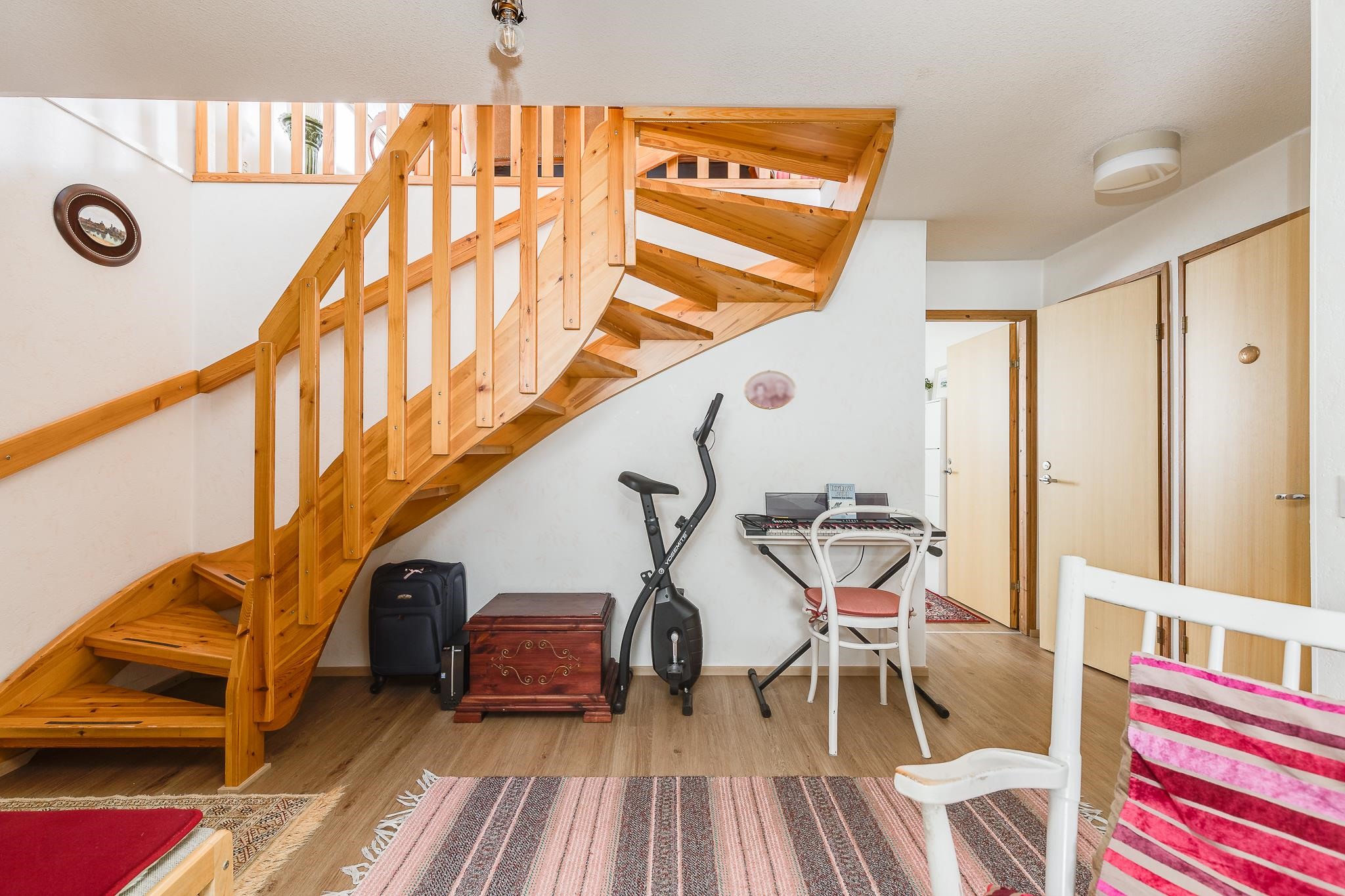 Asunnon pohjaratkaisu on harkittu ja toimiva. Yläkerrassa sijaitsevat tilavat olohuone ja keittiö, joista on kulku lasitetulle parvekkeelle. Pohjakerroksessa odottavat takkahuone, askartelutila ja sauna. Keittiössä on uusitut kalusteet ja käytännöllinen varustelu, joka täyttää vaativammankin kokin tarpeet. Säilytystilaa löytyy vaatehuoneesta ja ulkovarastosta.