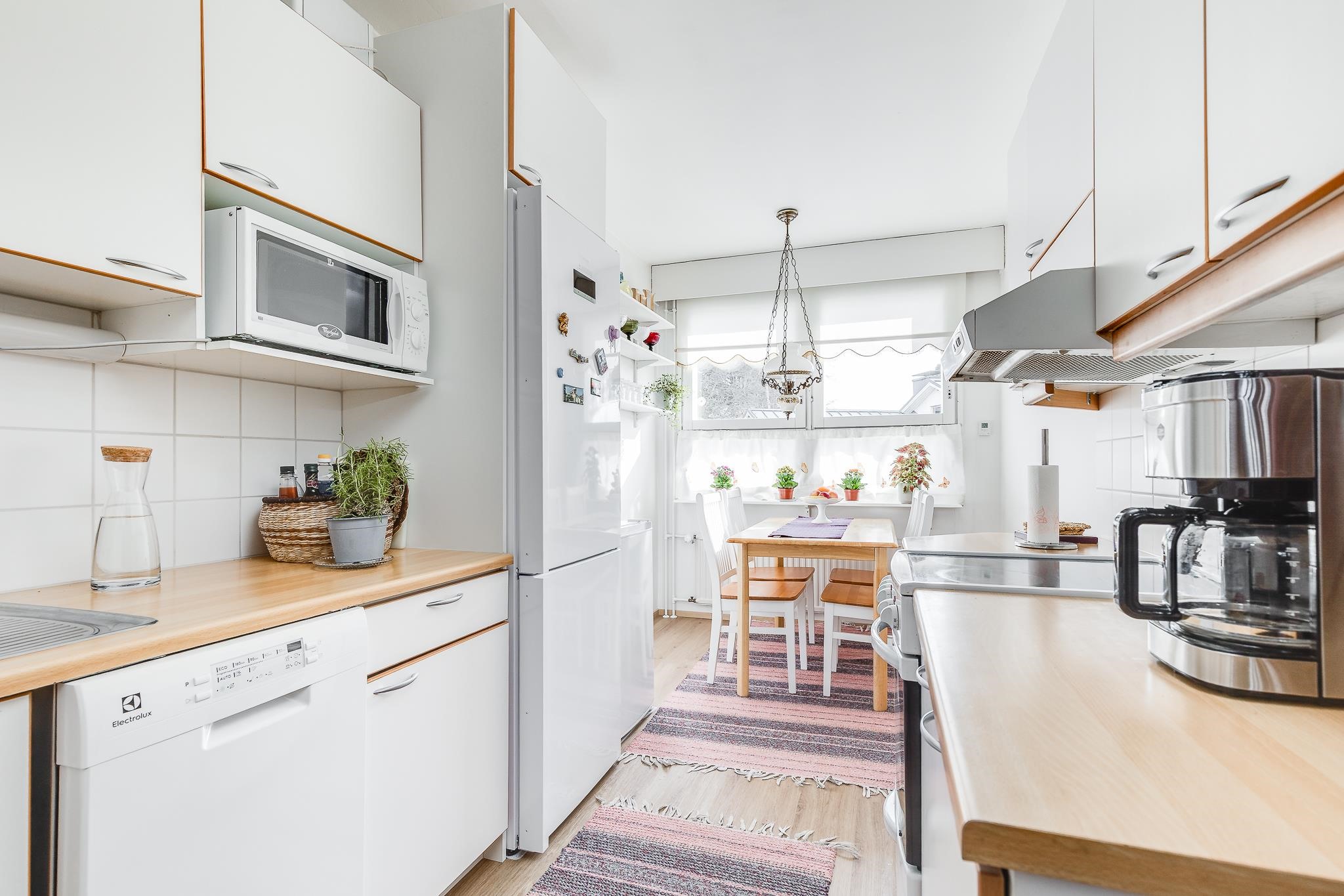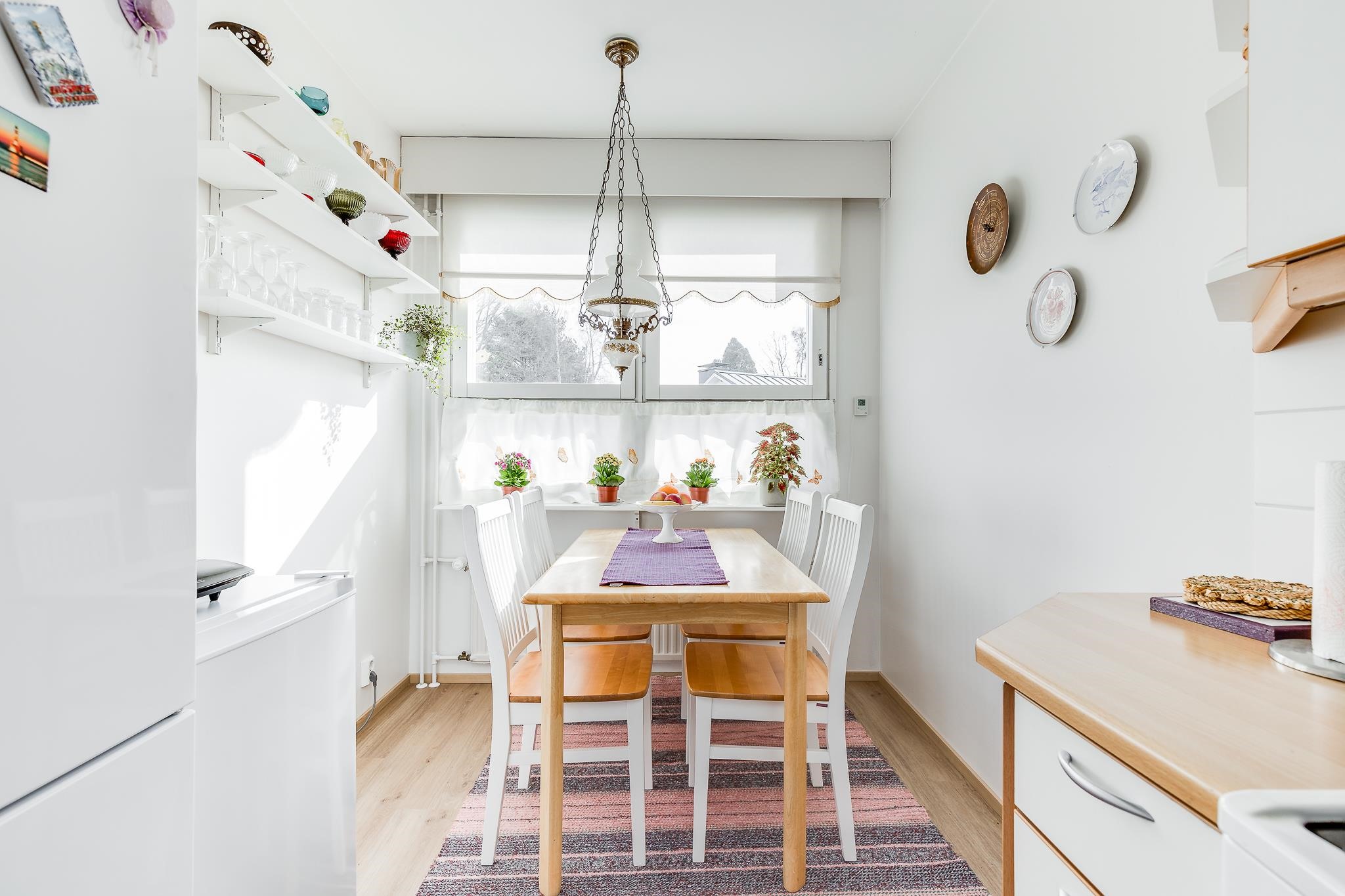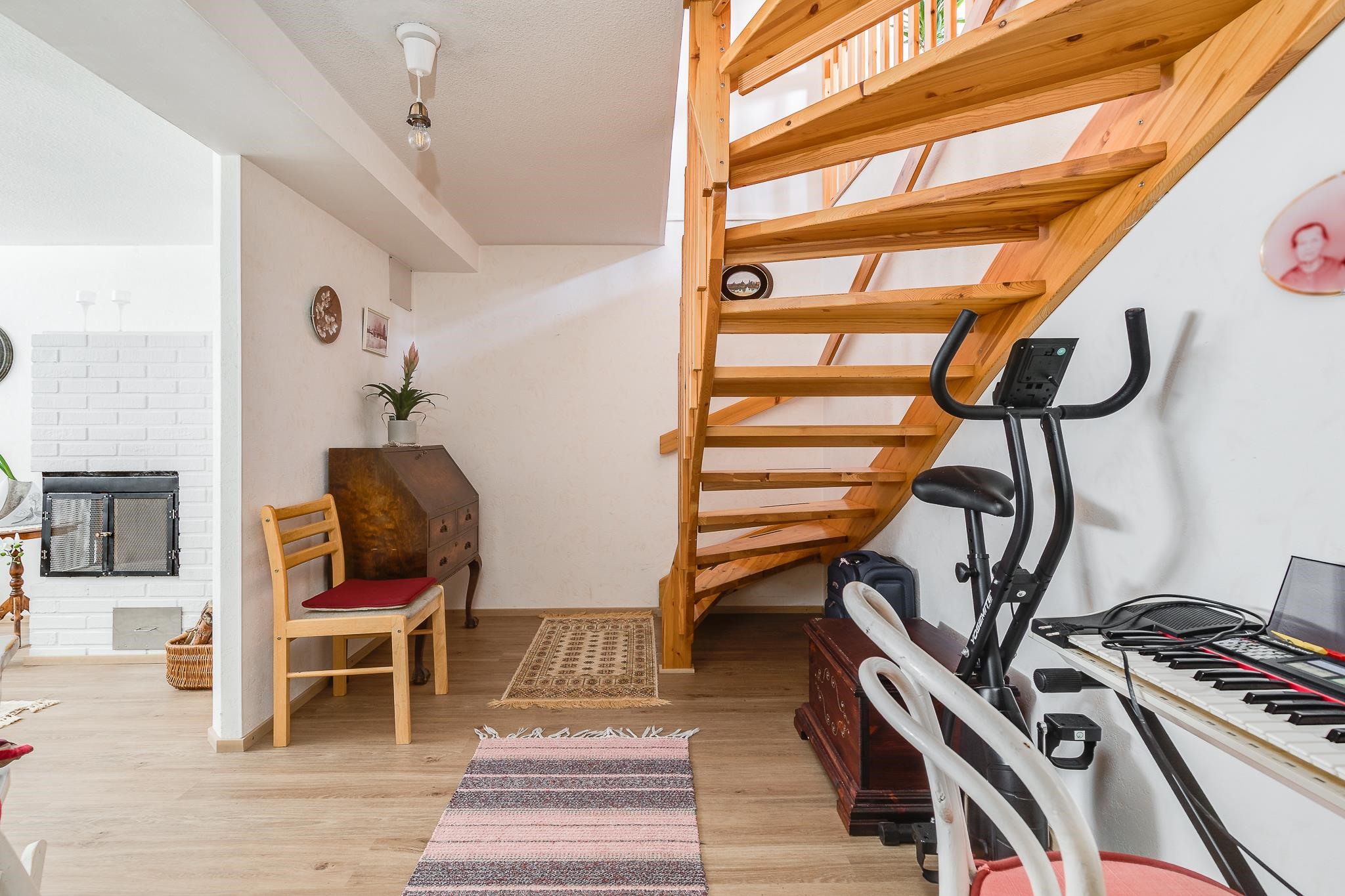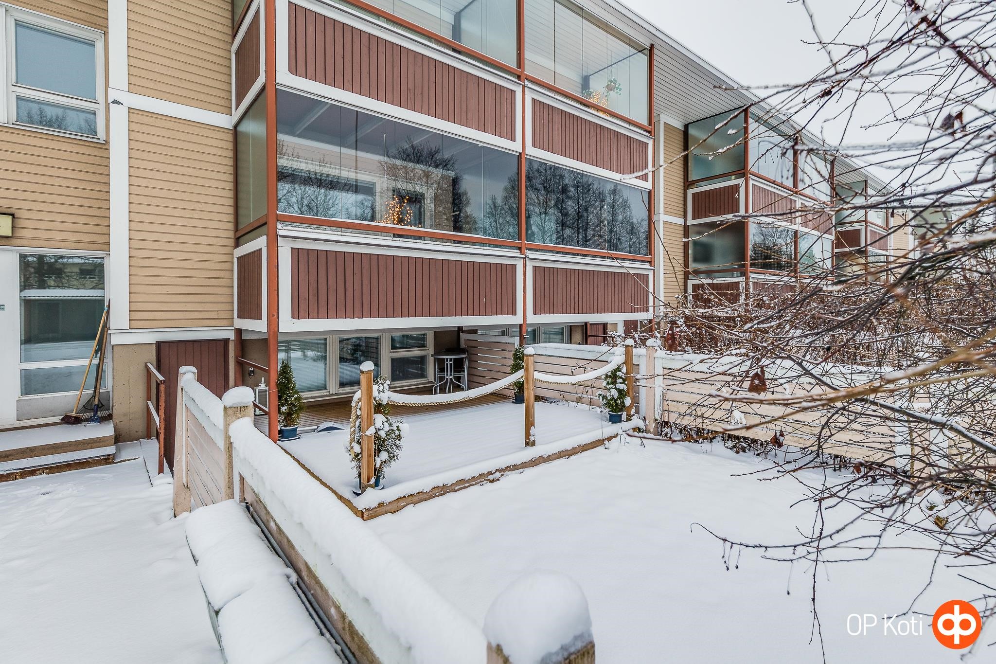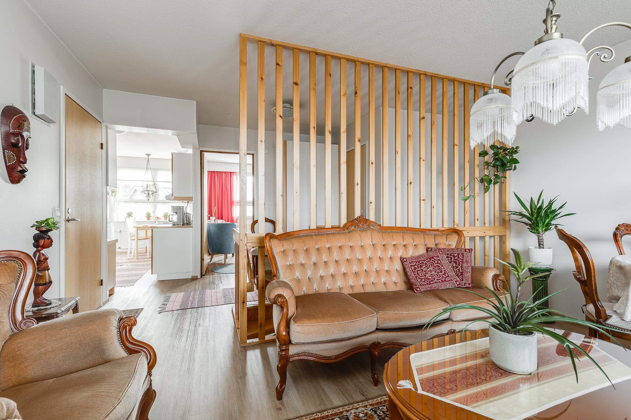 Asunnon pohjaratkaisu on harkittu ja toimiva. Yläkerrassa sijaitsevat tilavat olohuone ja keittiö, joista on kulku lasitetulle parvekkeelle. Pohjakerroksessa odottavat takkahuone, askartelutila ja sauna. Keittiössä on uusitut kalusteet ja käytännöllinen varustelu, joka täyttää vaativammankin kokin tarpeet. Säilytystilaa löytyy vaatehuoneesta ja ulkovarastosta.