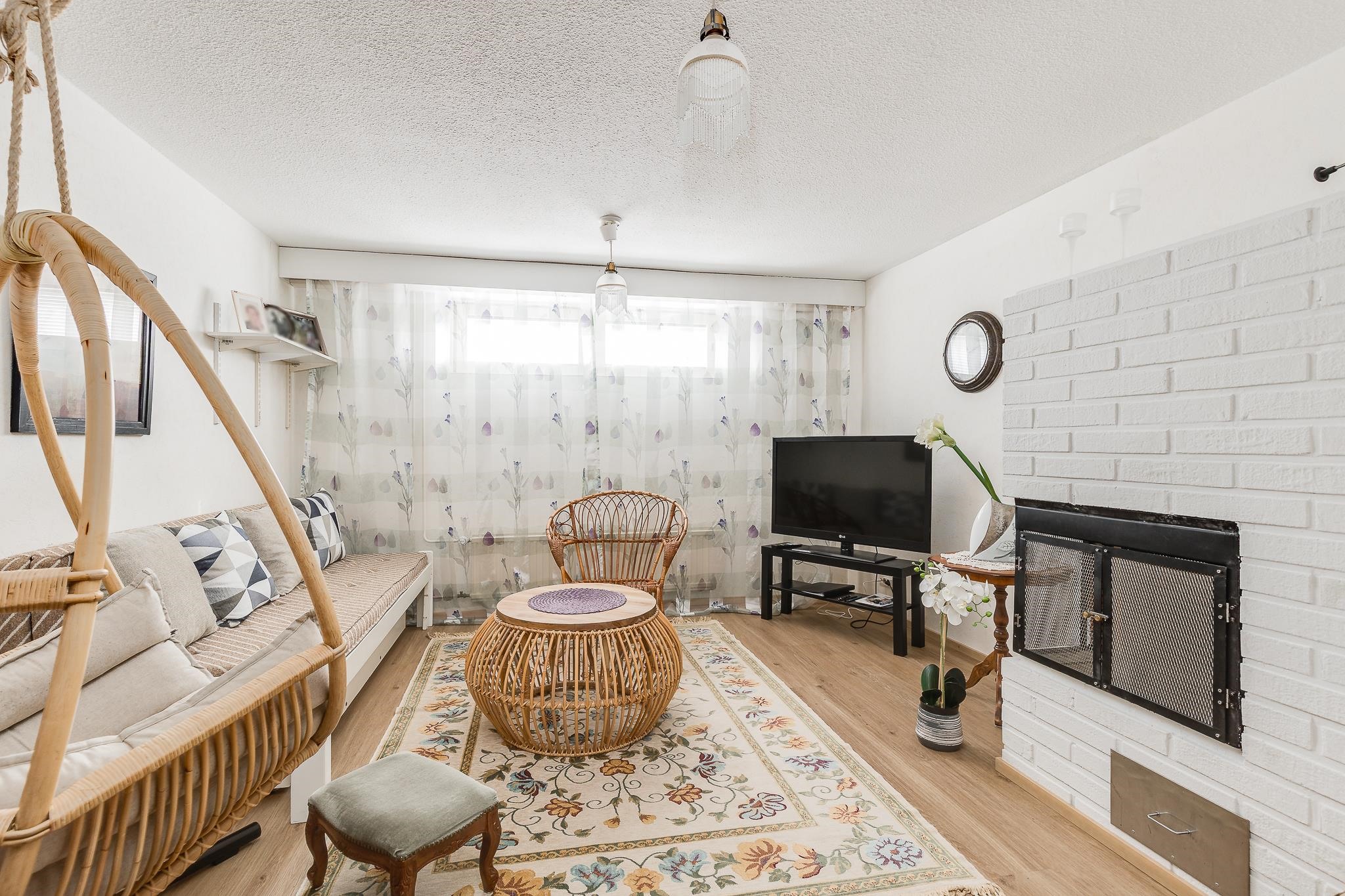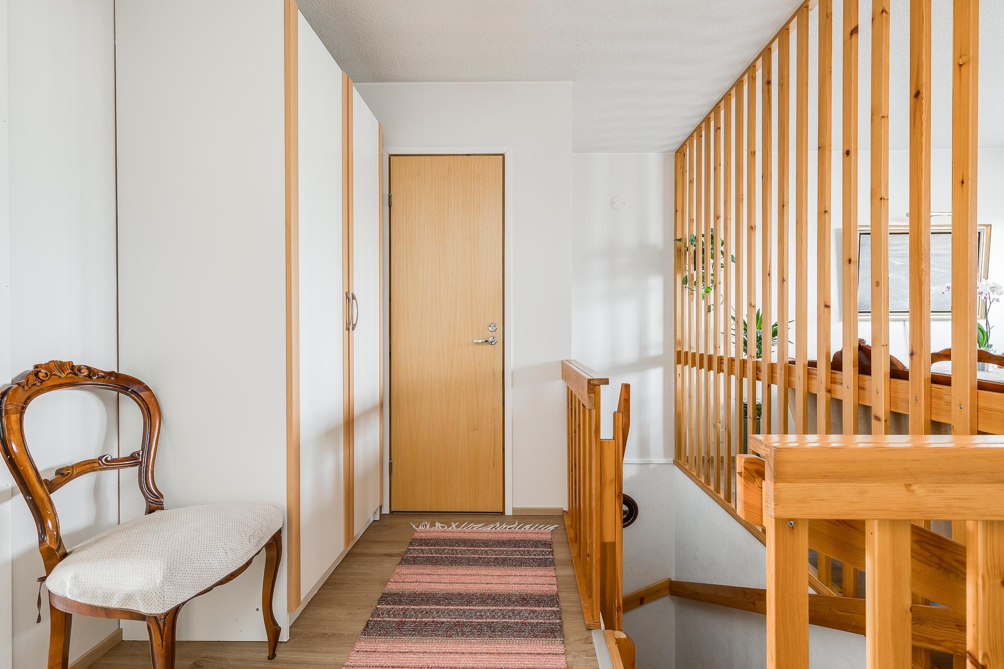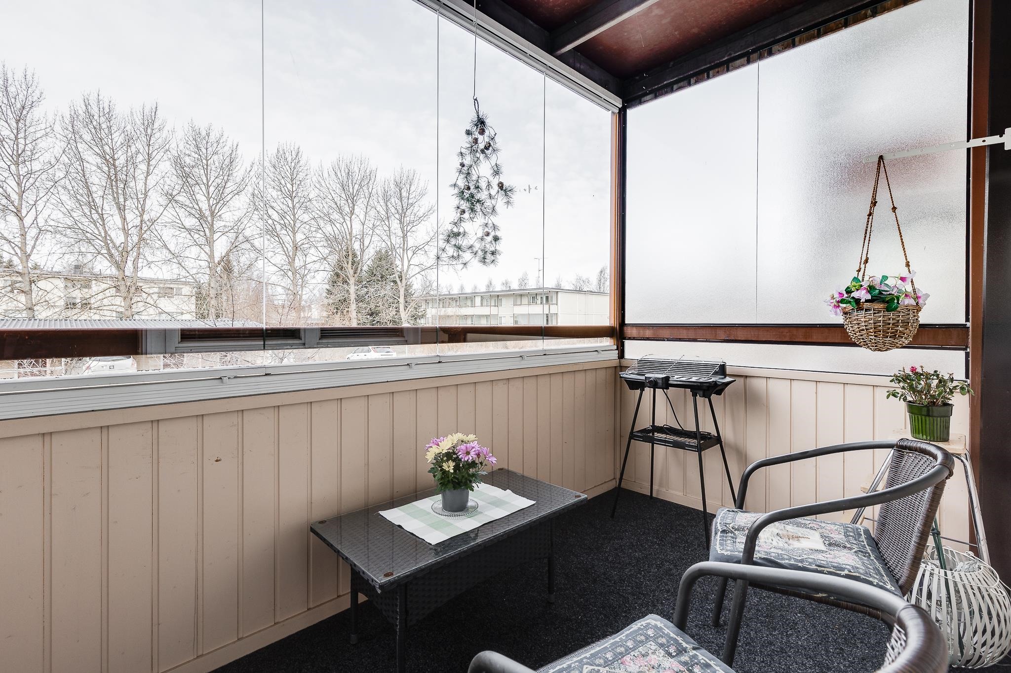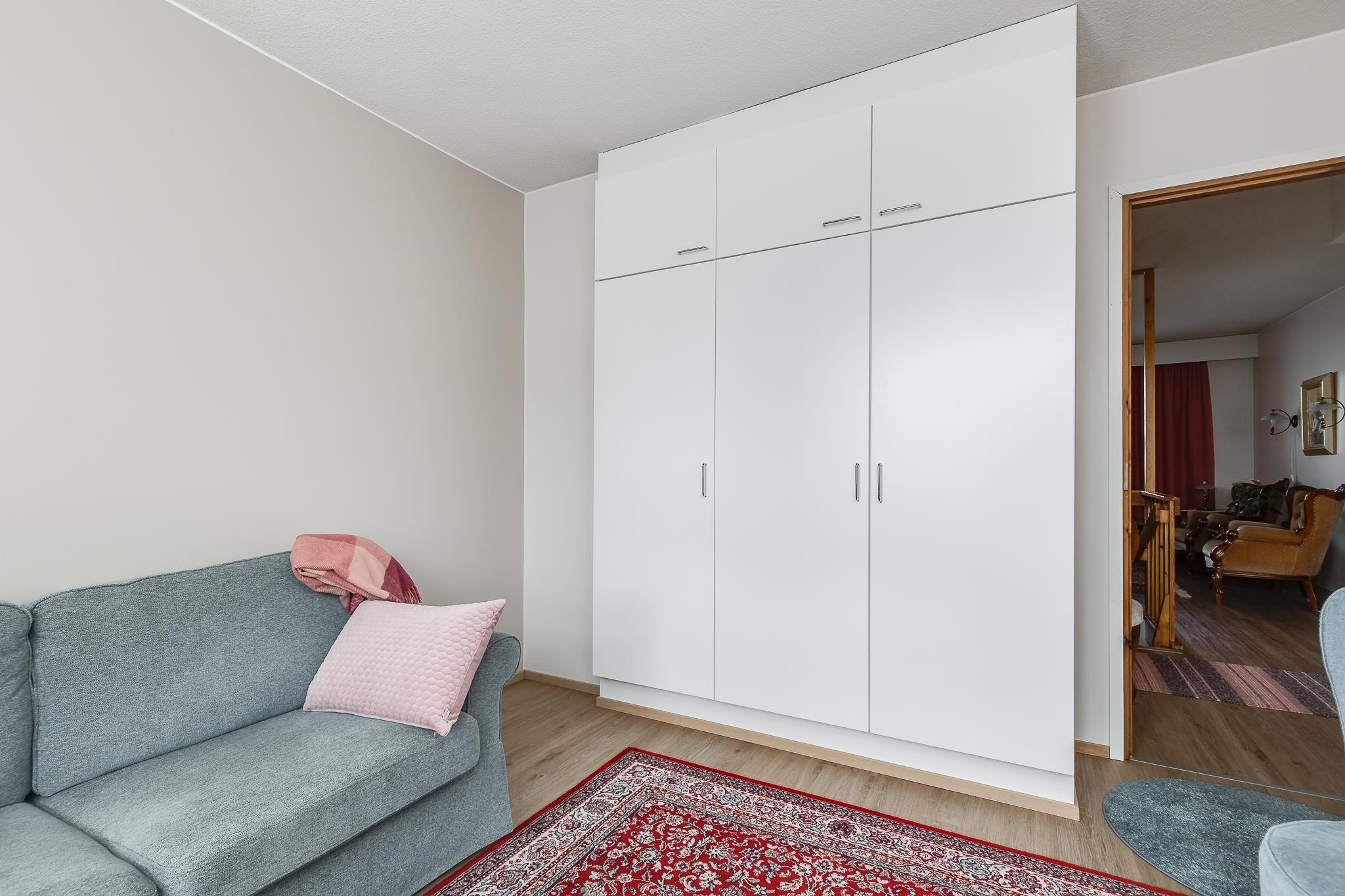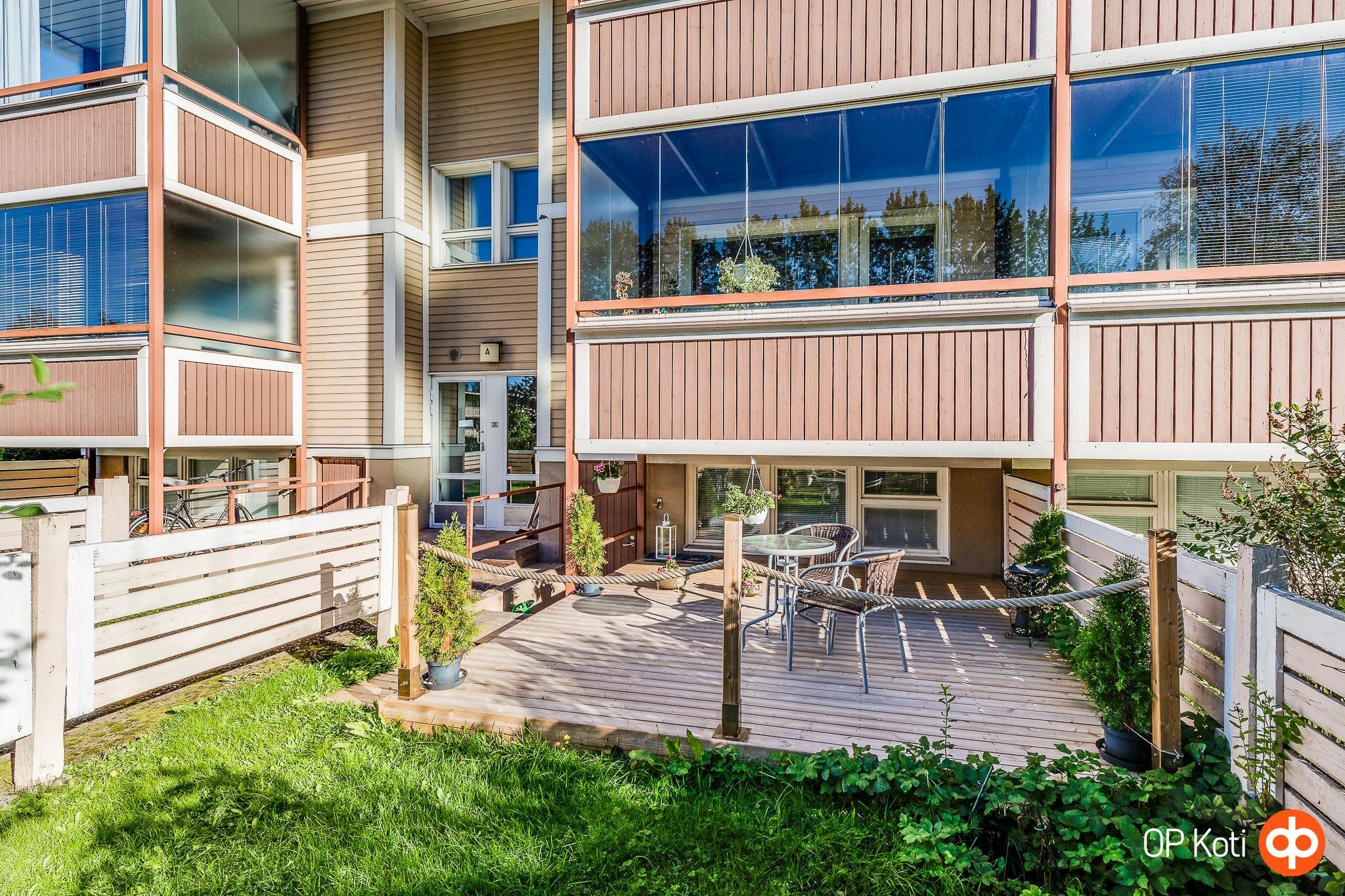 Asunnon pohjaratkaisu on harkittu ja toimiva. Yläkerrassa sijaitsevat tilavat olohuone ja keittiö, joista on kulku lasitetulle parvekkeelle. Pohjakerroksessa odottavat takkahuone, askartelutila ja sauna. Keittiössä on uusitut kalusteet ja käytännöllinen varustelu, joka täyttää vaativammankin kokin tarpeet. Säilytystilaa löytyy vaatehuoneesta ja ulkovarastosta.