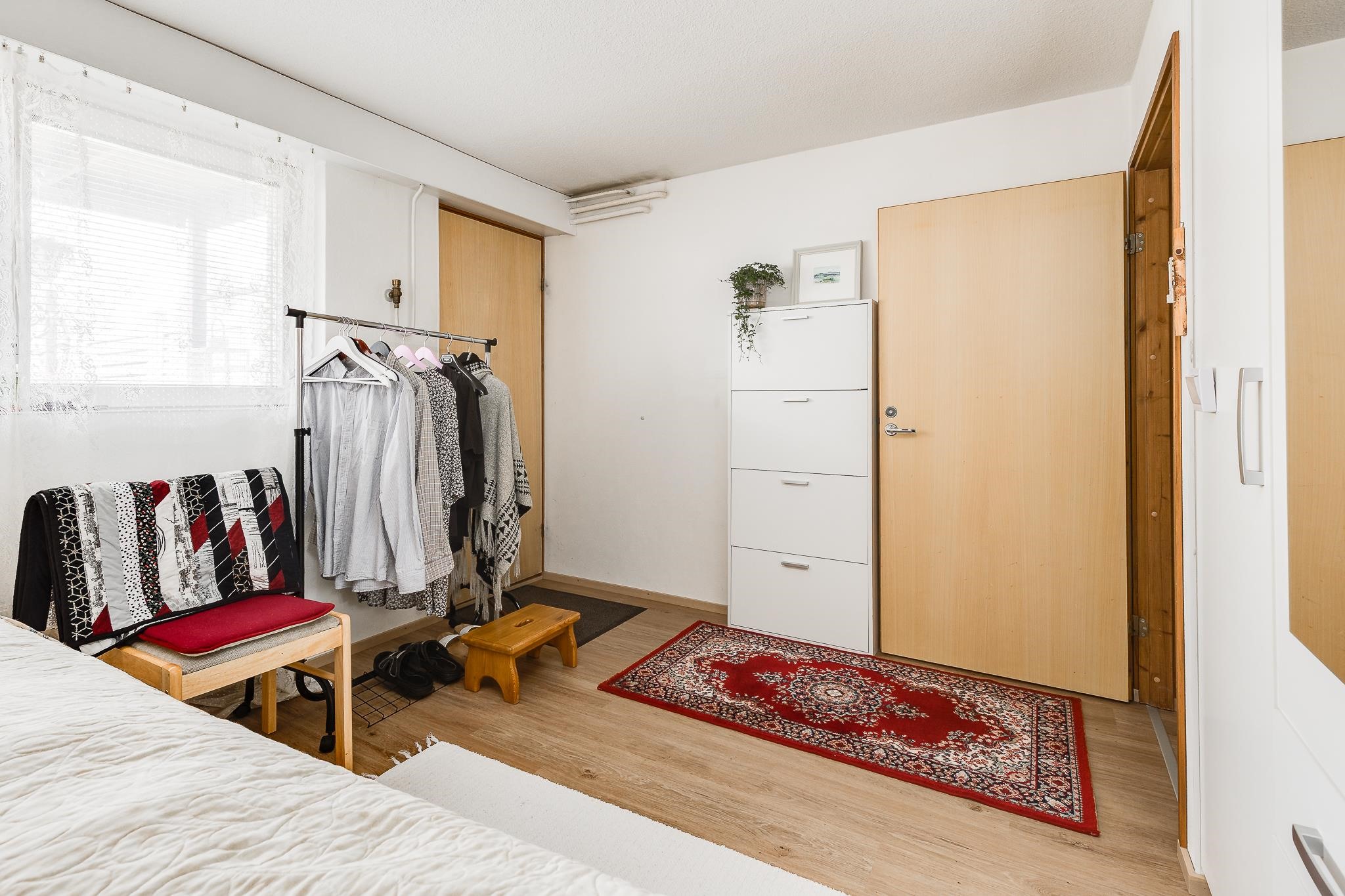- Keittiö: Lattia vinyyli ja seinäpinnat maalattu. Olohuone: Lattia vinyyli ja seinäpinnat maalattu. Makuuhuone 1: Lattia vinyyli ja seinäpinnat maalattu. Sauna: Seinäpinnat paneeli ja lattia laattaa. Kylpyhuone: Pinnat laattaa. Eteinen: Lattia vinyyli ja seinäpinnat maalattu tapetti. Toimii tällä hetkellä makuuhuuoneena. Käynti ulos.. Takkahuone: Lattia vinyyli ja seinäpinnat maalattu tapetti.