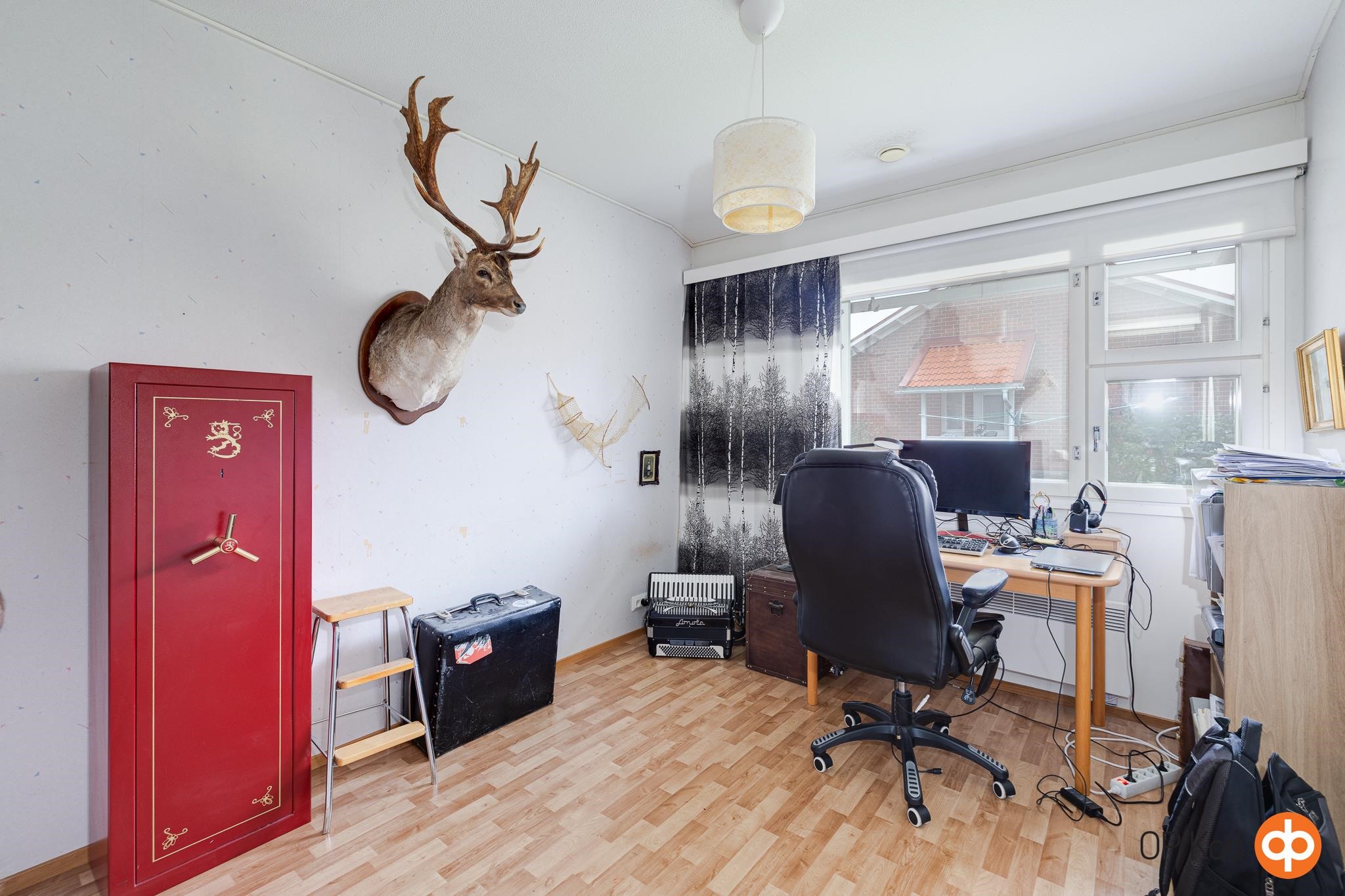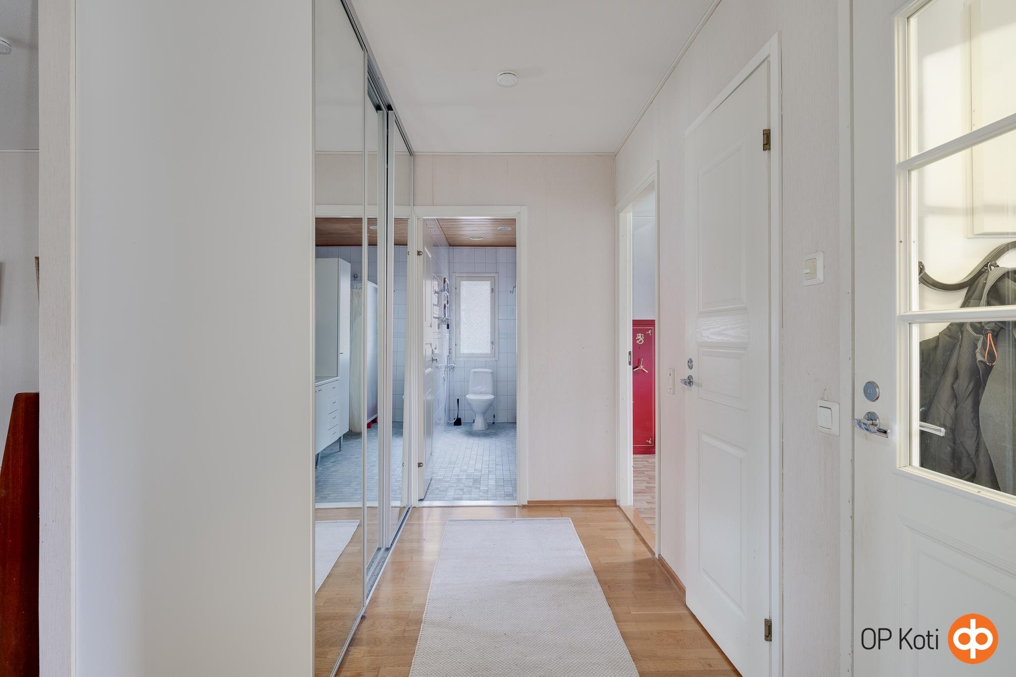 - Keittiö: Parketti, maalatut seinät. Olohuone: Parketti, maalattu seinä/tapetit. Makuuhuone 1: Parketti, maalattu seinä/tapetit. Makuuhuone 2: Muovimatto, maalattu seinä/tapetit. Makuuhuone 3: Parketti, maalattu seinä/tapetit. Kodinhoitohuone: Klinkkeri, maalatut seinät. Sauna: Klinkkeri, paneeli. Kylpyhuone: Laatoitettu. Eteinen: Parketti, tapetti. Wc: Laatoitettu. Makuuhuone 4: Muovimatto, maalattu seinä/tapetit. Tuulikaappi: Klinkkeri, maalattu seinä.