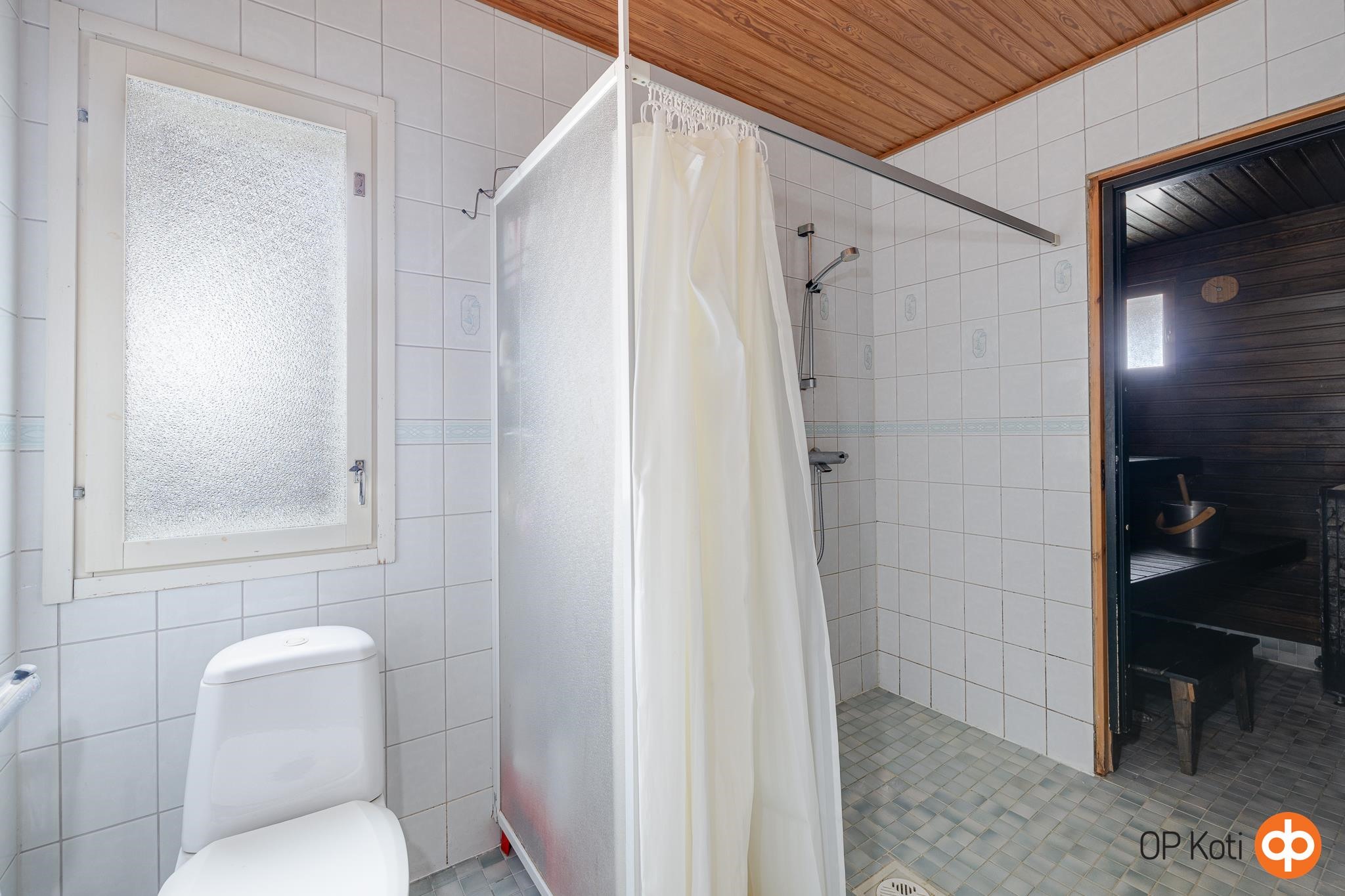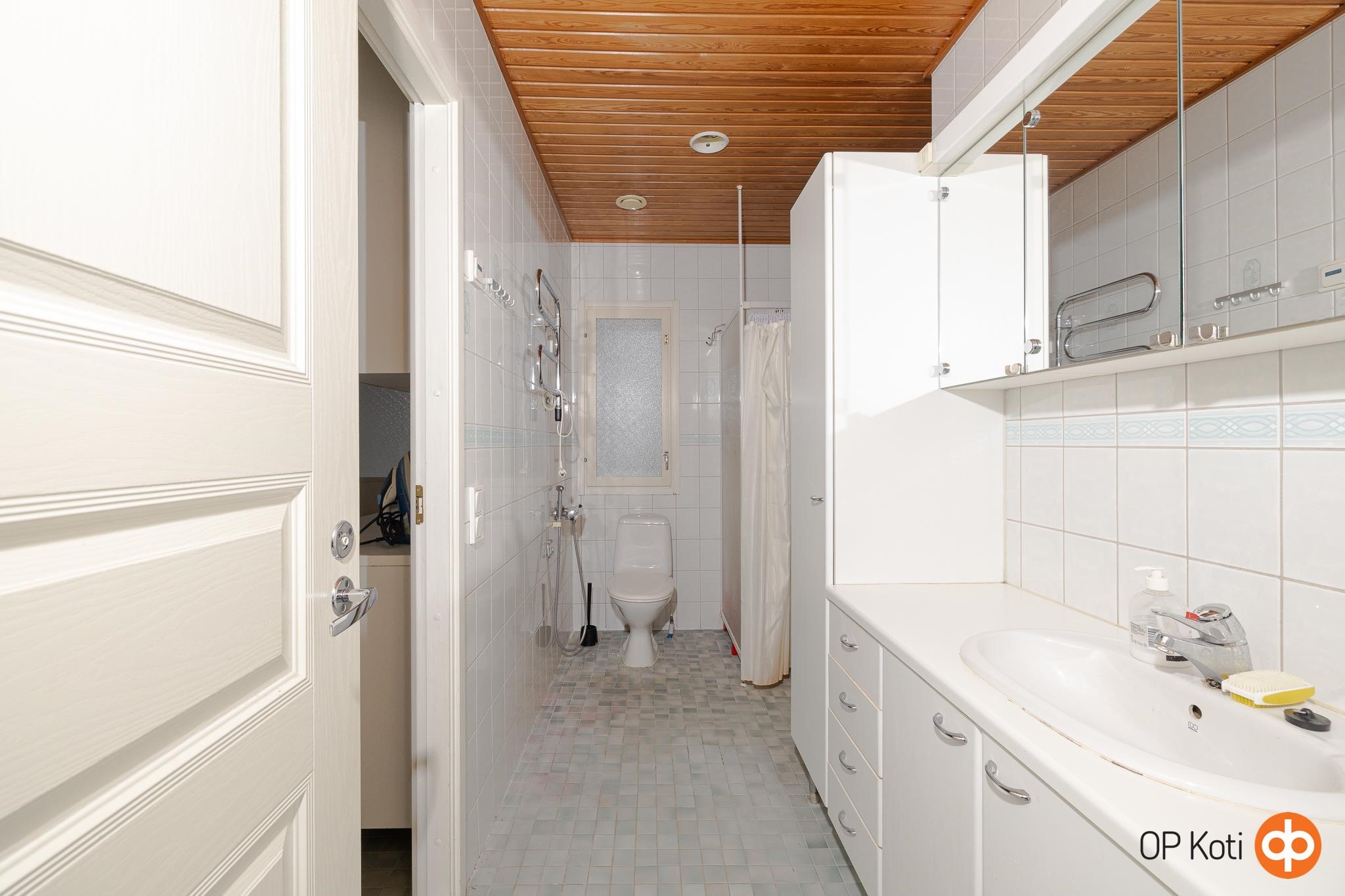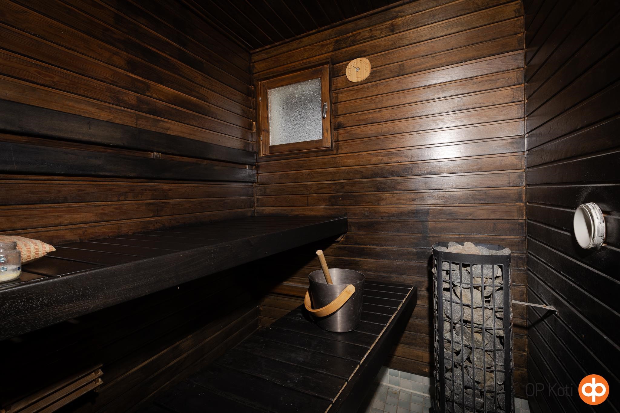 - Sauna, sähkökiuas, kylpyhuone, erillinen wc, suihku (2 kpl.), suihkuseinä, peilikaappi (kylpyhuoneessa ja wc:ssä), kaapit (kylpyhuoneessa), allaskaappi (kylpyhuoneessa ja wc:ssä), pesukoneliitäntä, lattialämmitys, kiinteät valaisimet. Sauna maalattu ja kiuas uusittu 2013 (?), erilliswc:n ja kylpyhuoneen kaikki hanat (myös suihkuhanat) uusittu (ei kylpyhuoneen allashanaa)