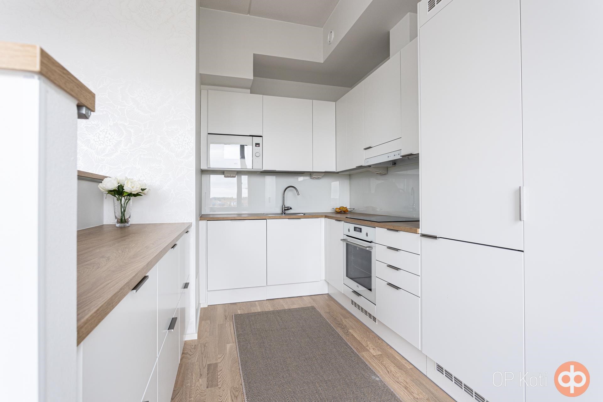 - Jääkaappi integroitu, pakastekaappi integroitu, erillisuuni, induktioliesi, liesituuletin, mikroaaltouuni, astianpesukone integroitu, kaapistot, kiinteät valaisimet.