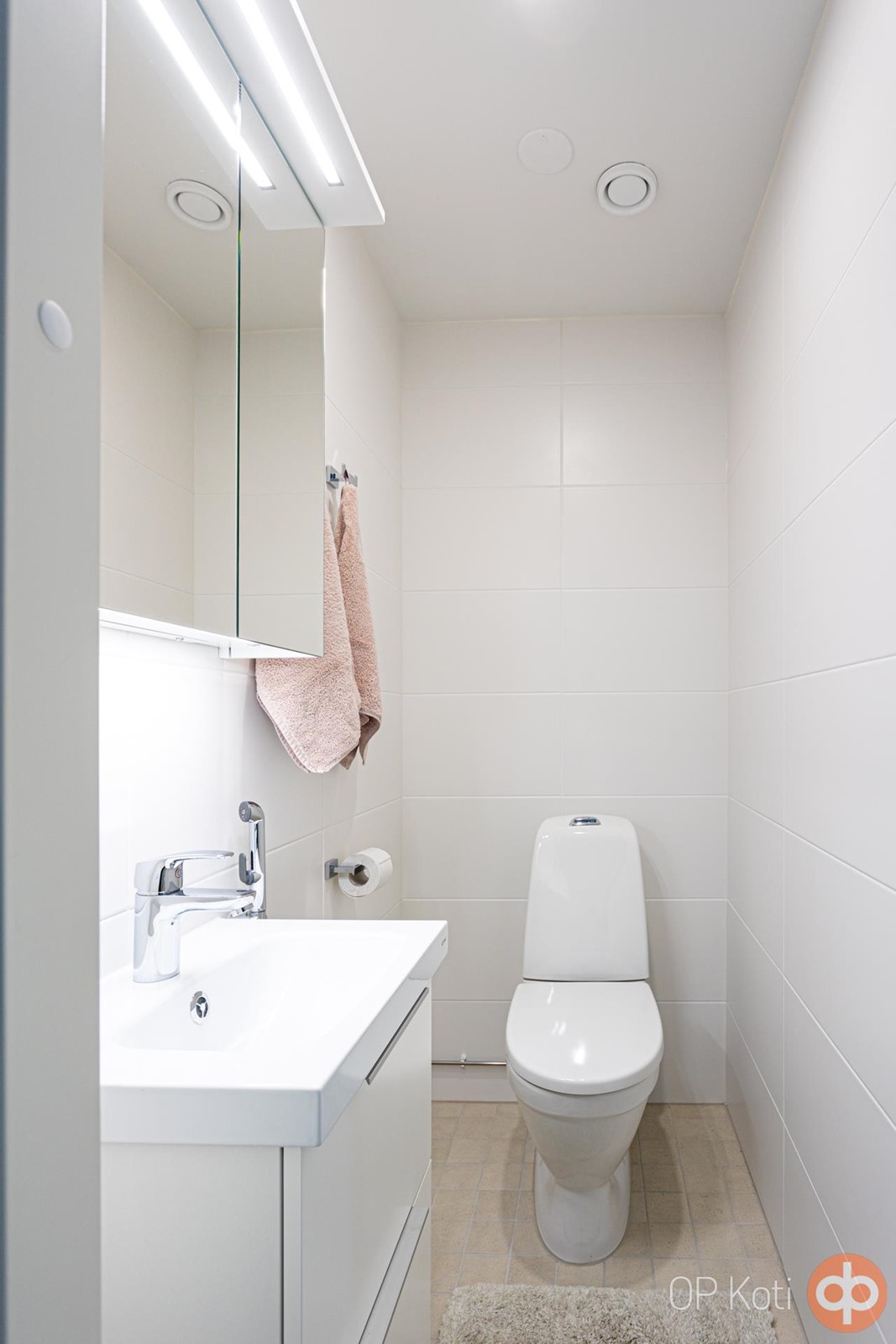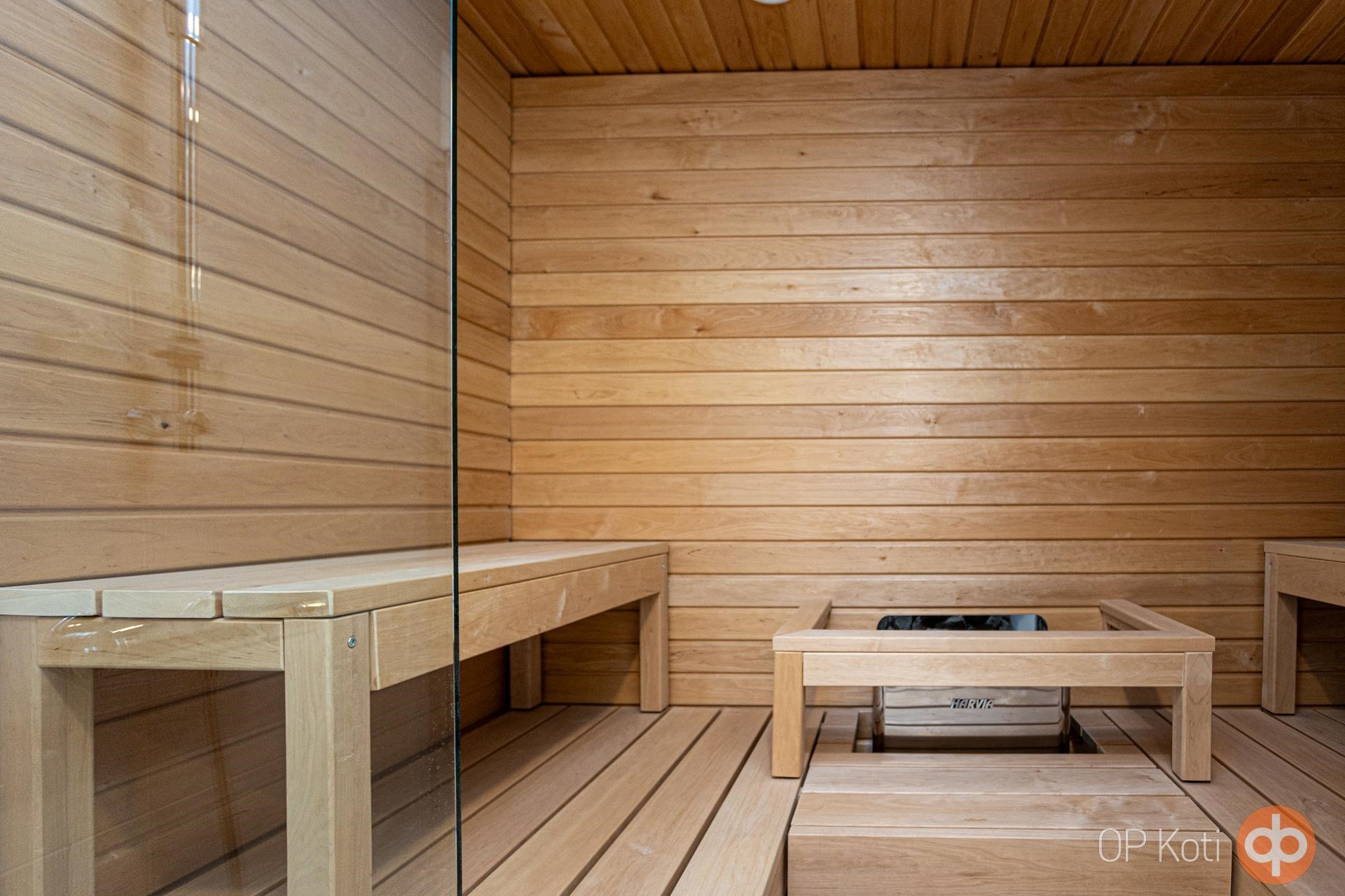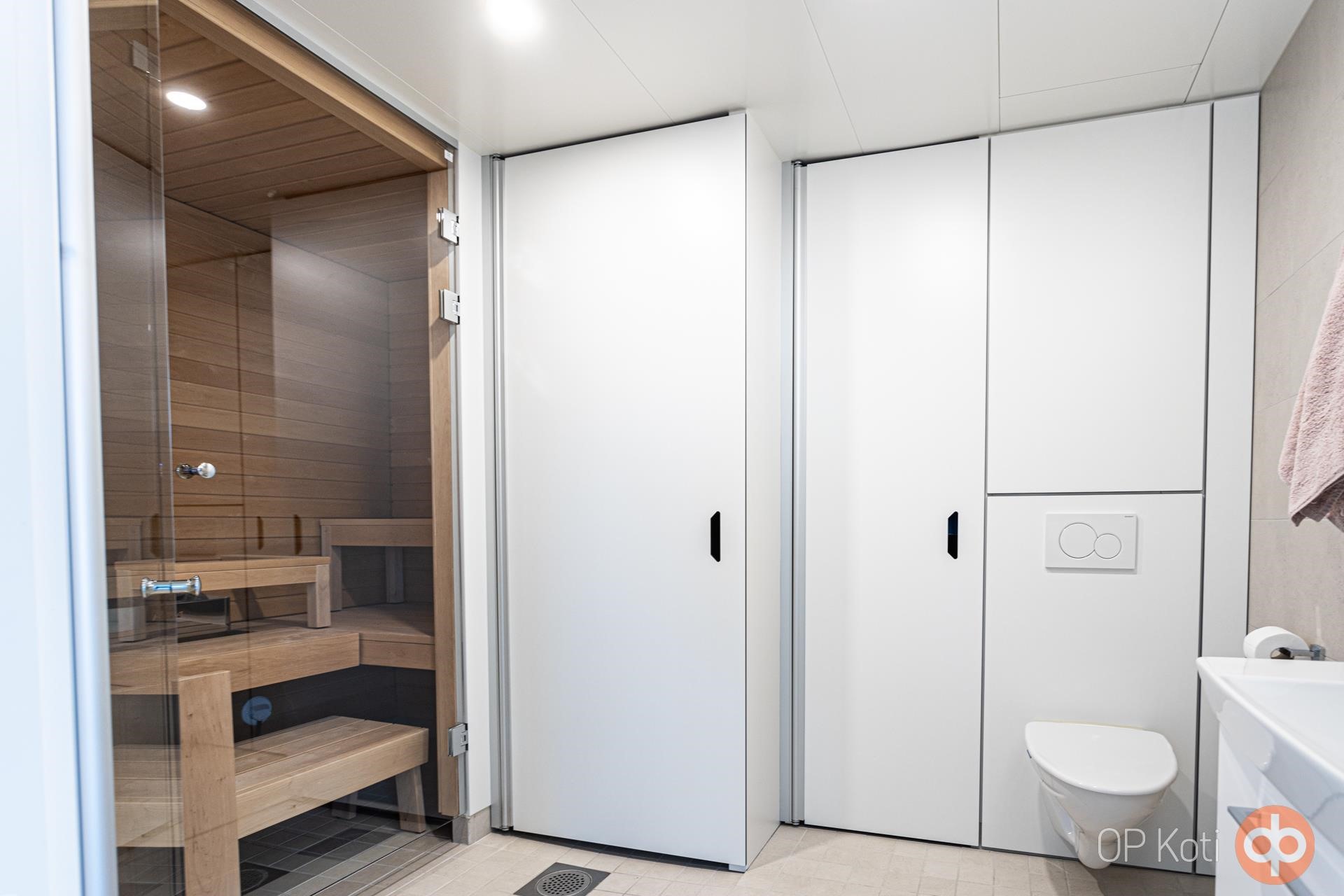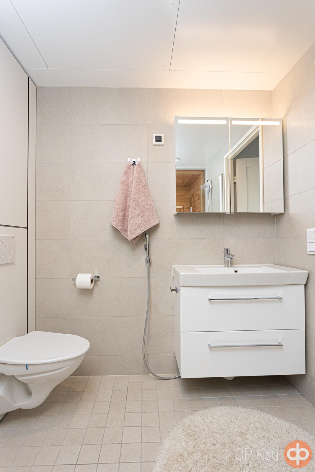 - Sauna, sähkökiuas, erillinen wc, suihku, suihkuseinä, peilikaappi, kaapit, allaskaappi, pesukoneliitäntä, lattialämmitys, kiinteät valaisimet.