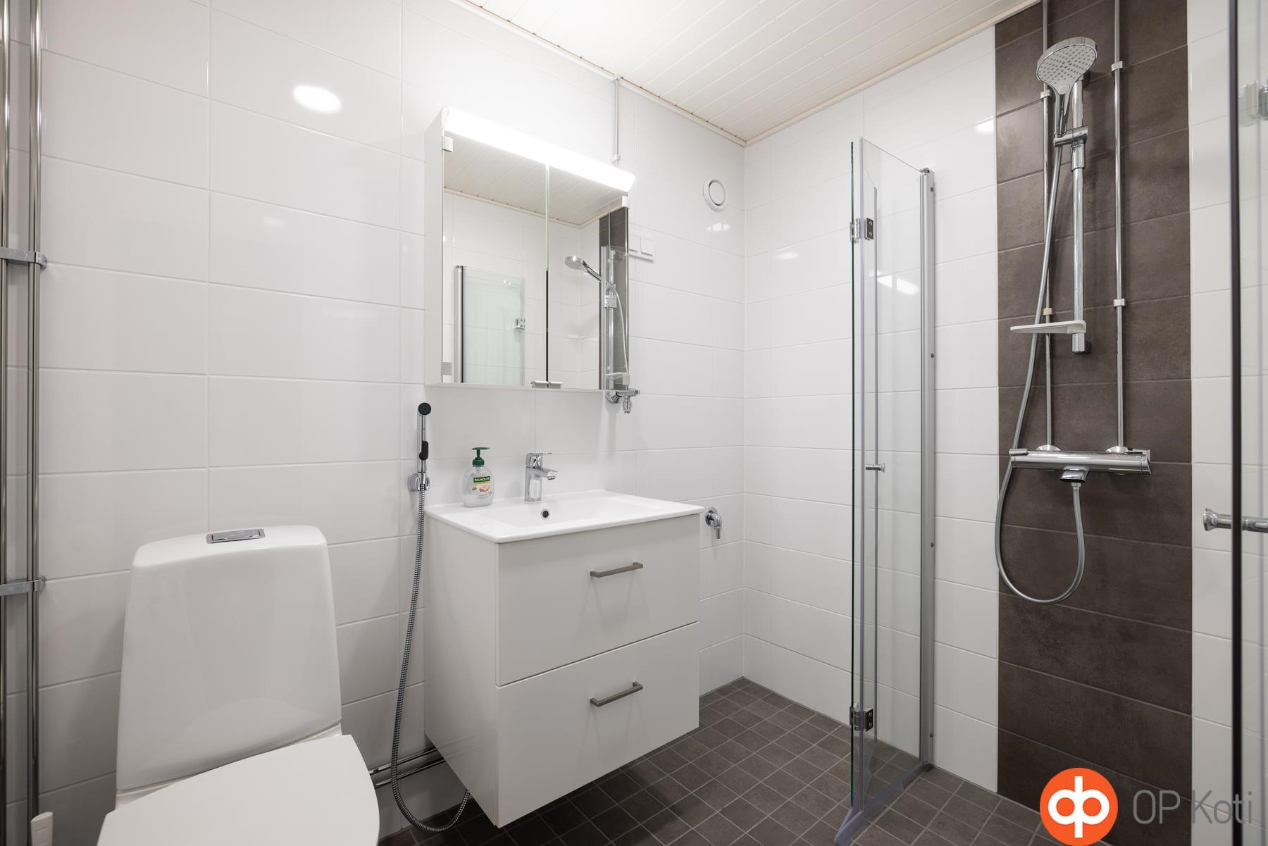 - Kylpyhuone, suihku suihkuseinät, peilikaappi, allaskaappi, pesukoneliitäntä, lattialämmitys. Kylpyhuone uusittu 2025 ja on käyttämätön.