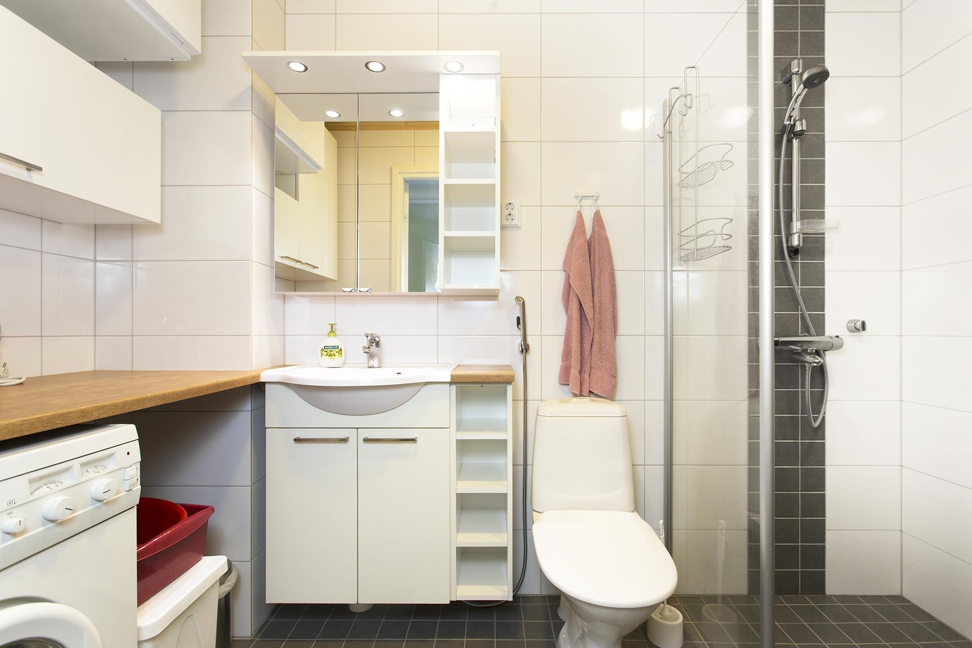 - Sauna, sähkökiuas, kylpyhuone, suihku, suihkuseinä, peilit, peilikaappi, kaapit, pesukoneliitäntä, lattialämmitys, kiinteät valaisimet. .-